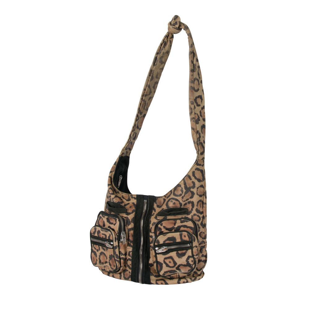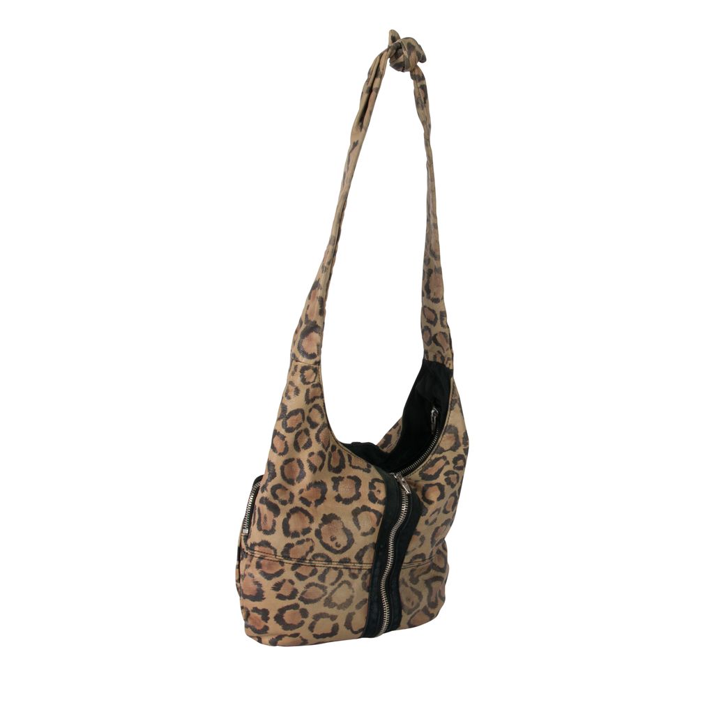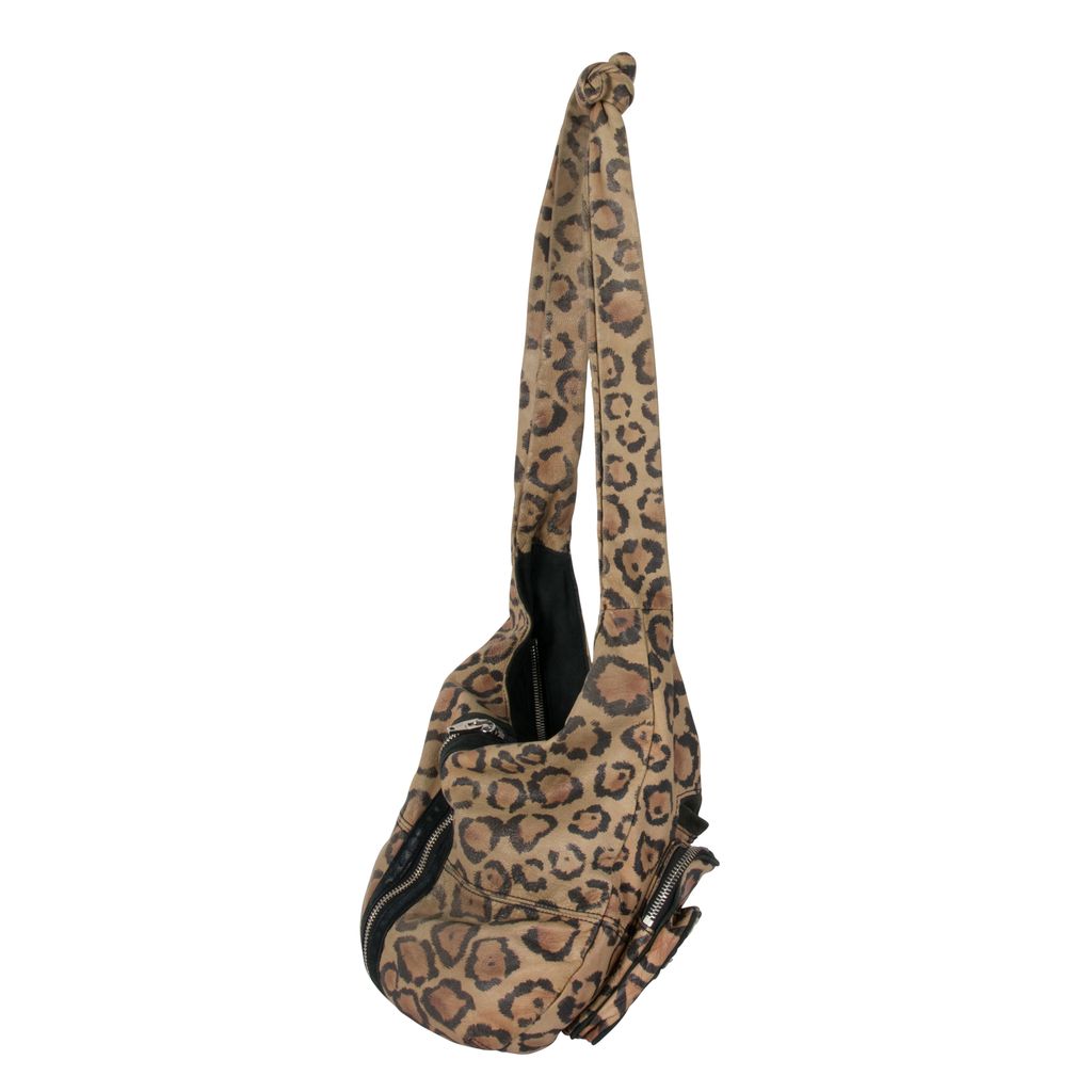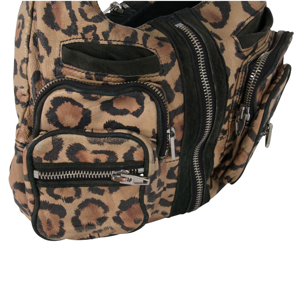 This leopard print leather satchel from Alexander Wang features silver zippered pockets throughout, black suede trim/extension detail, nylon lining, and has a knotted strap construction. In fair condition, fading throughout from wear.