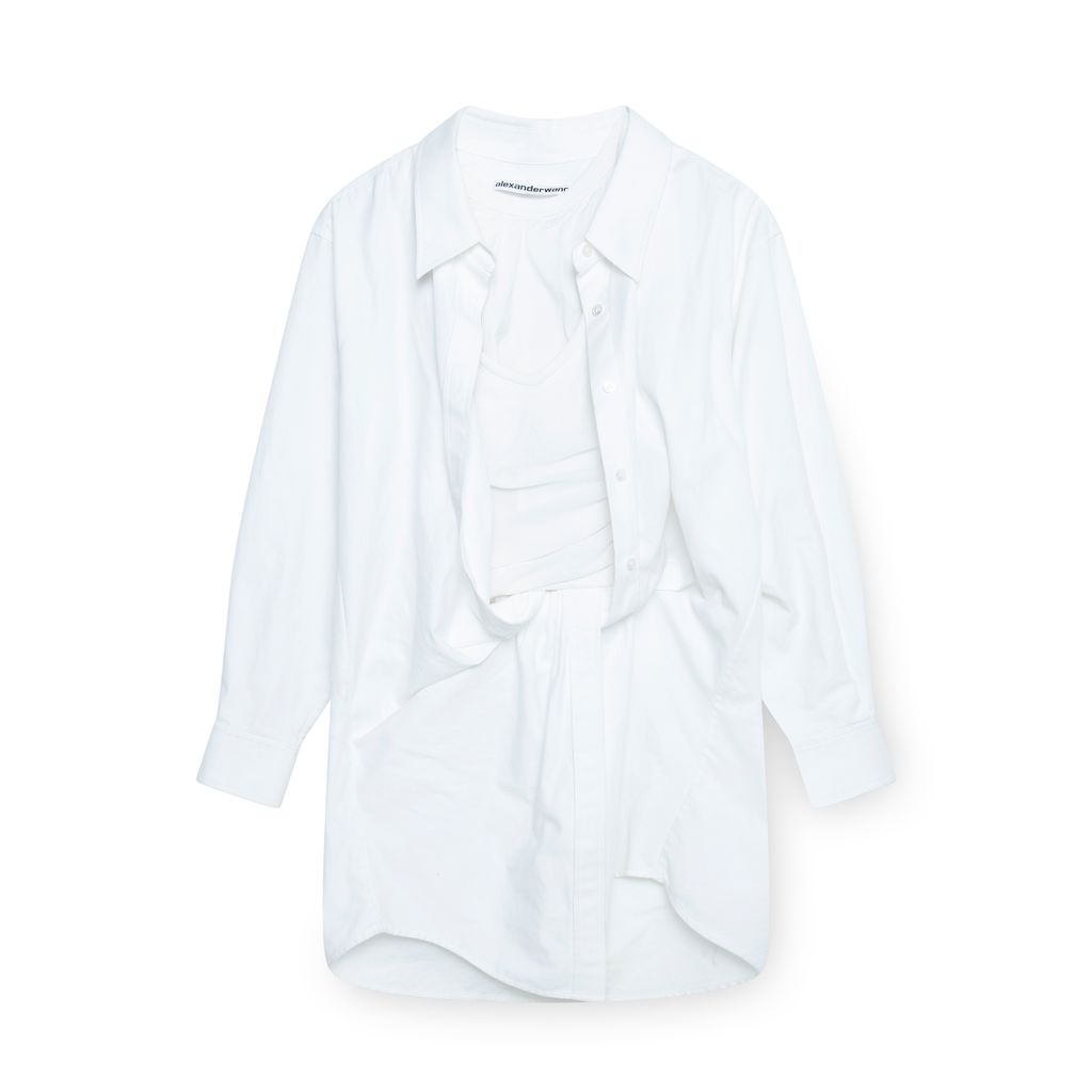 Alexander Wang Smocked Cami Shirt Dress features inner corseted tank top, mini length, and front button closure.