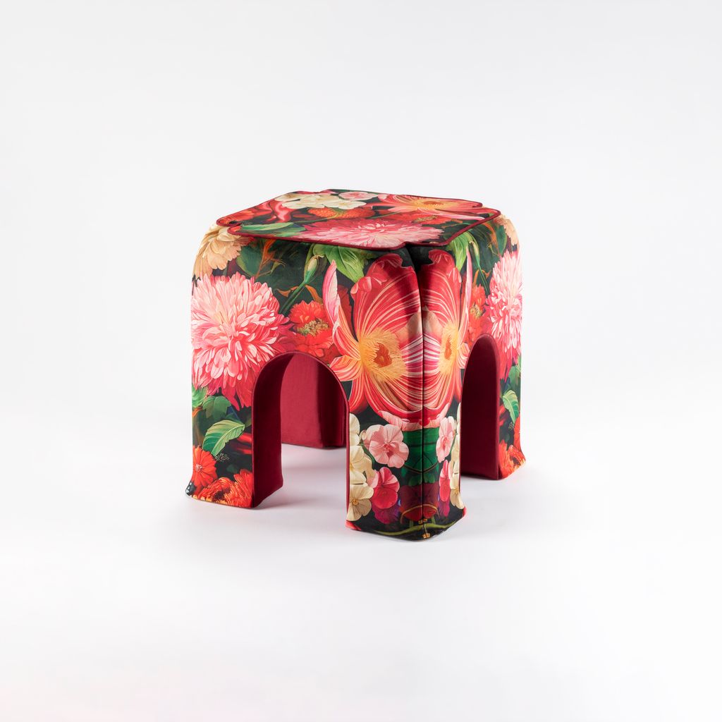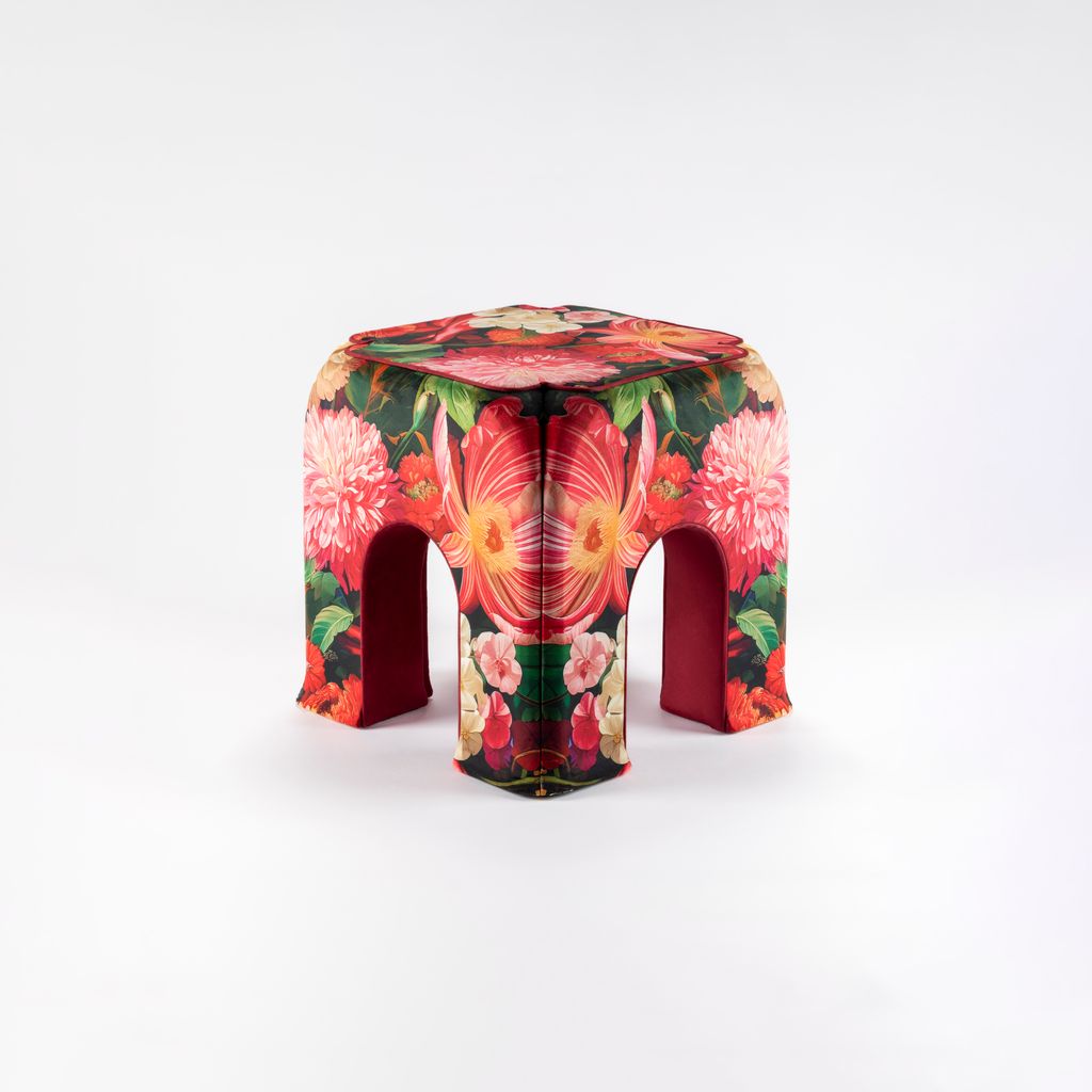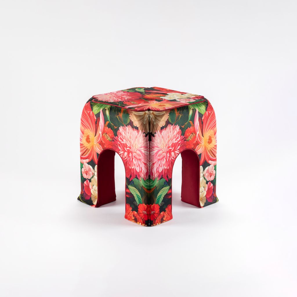 The Alice stool draws inspiration from Lewis Carroll’s Alice in Wonderland, offering a dreamlike, oversized vision of nature. The four-leaf clover — a symbol of luck and rarity — is subtly integrated into the seat’s design, whose edges seem to distort and gradually dissolve.Crafted using artificial intelligence, the floral pattern is inspired by classic still-life paintings, blurring the line between reality and illusion, authenticity and digital dream. Available in two shades — soft pink and deep red — the color palette reflects different stages of life, reminding us that age is love is an ageless adventure.