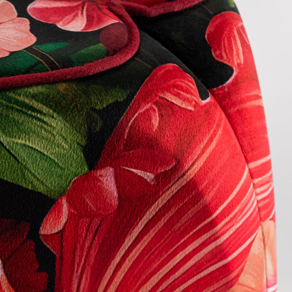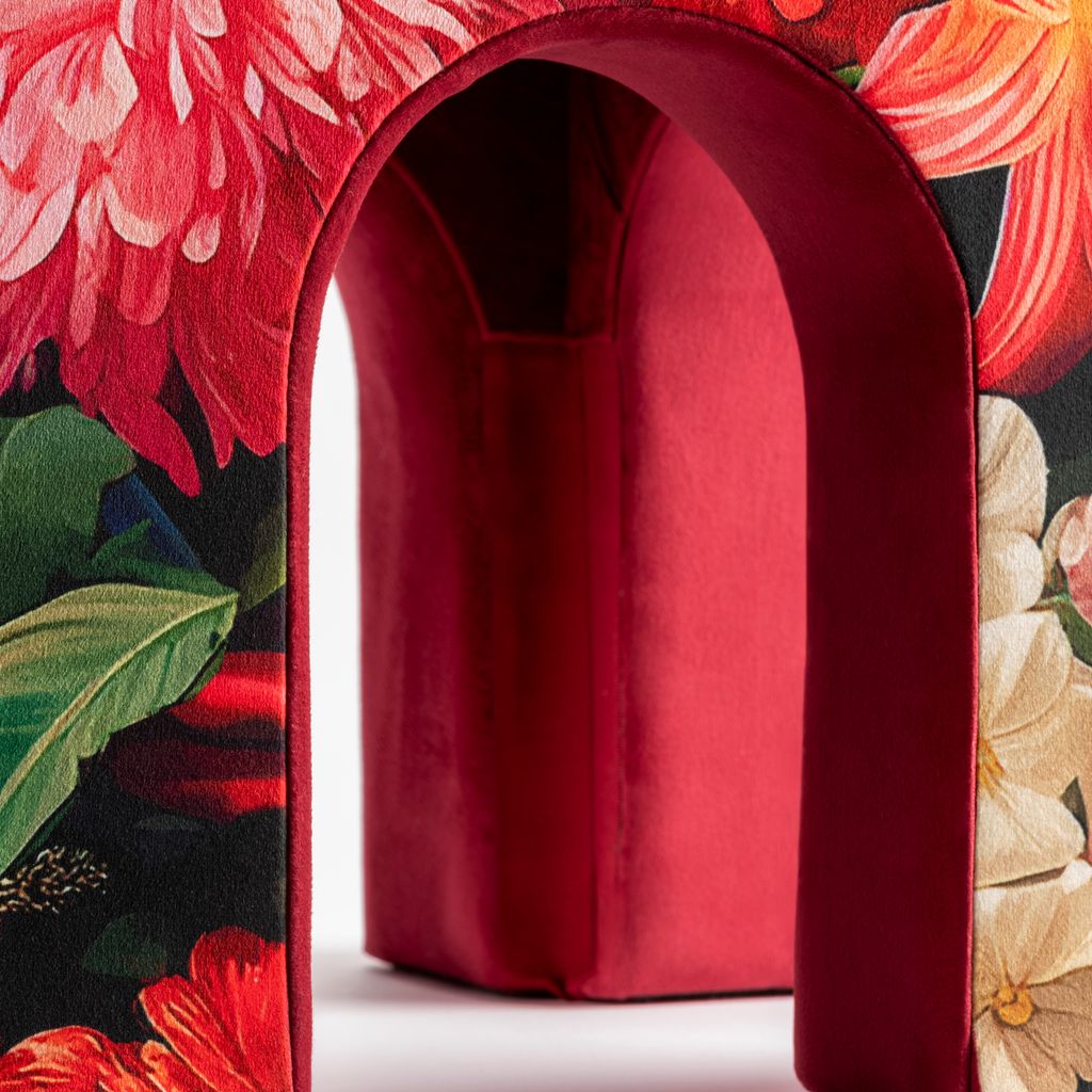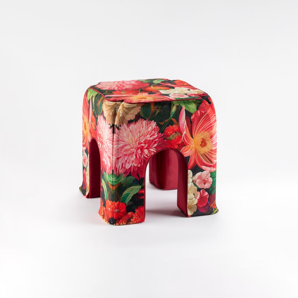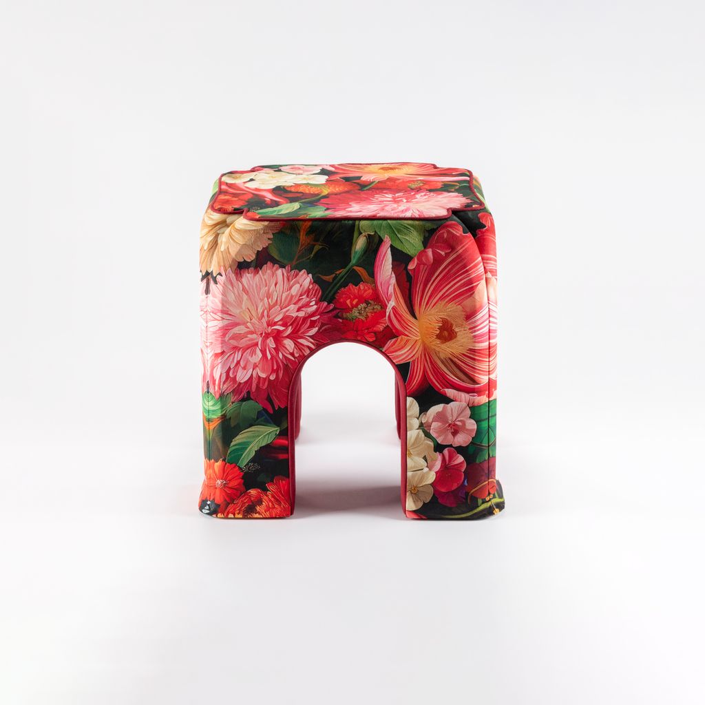 The Alice stool draws inspiration from Lewis Carroll’s Alice in Wonderland, offering a dreamlike, oversized vision of nature. The four-leaf clover — a symbol of luck and rarity — is subtly integrated into the seat’s design, whose edges seem to distort and gradually dissolve.Crafted using artificial intelligence, the floral pattern is inspired by classic still-life paintings, blurring the line between reality and illusion, authenticity and digital dream. Available in two shades — soft pink and deep red — the color palette reflects different stages of life, reminding us that age is love is an ageless adventure.
