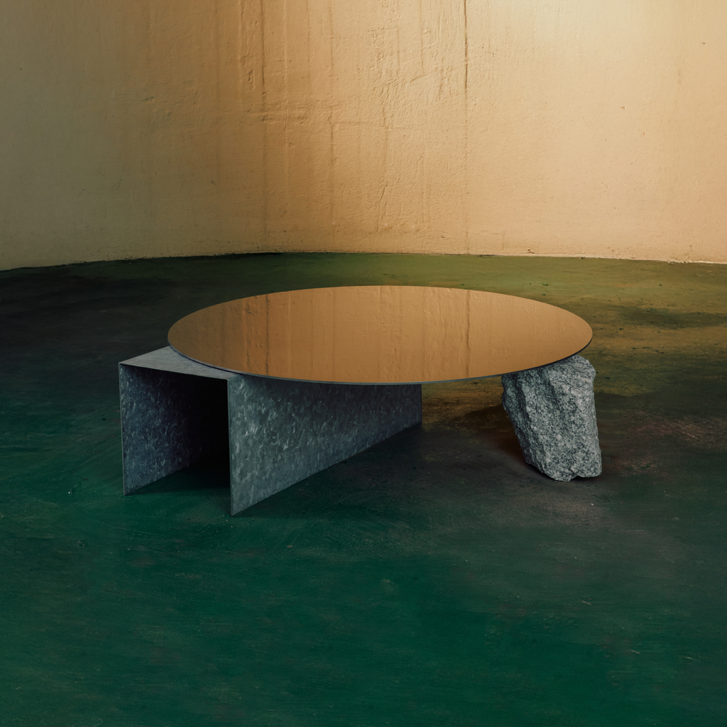 A sculptural low table with a semi polished top which gives a soft, smoky reflection.