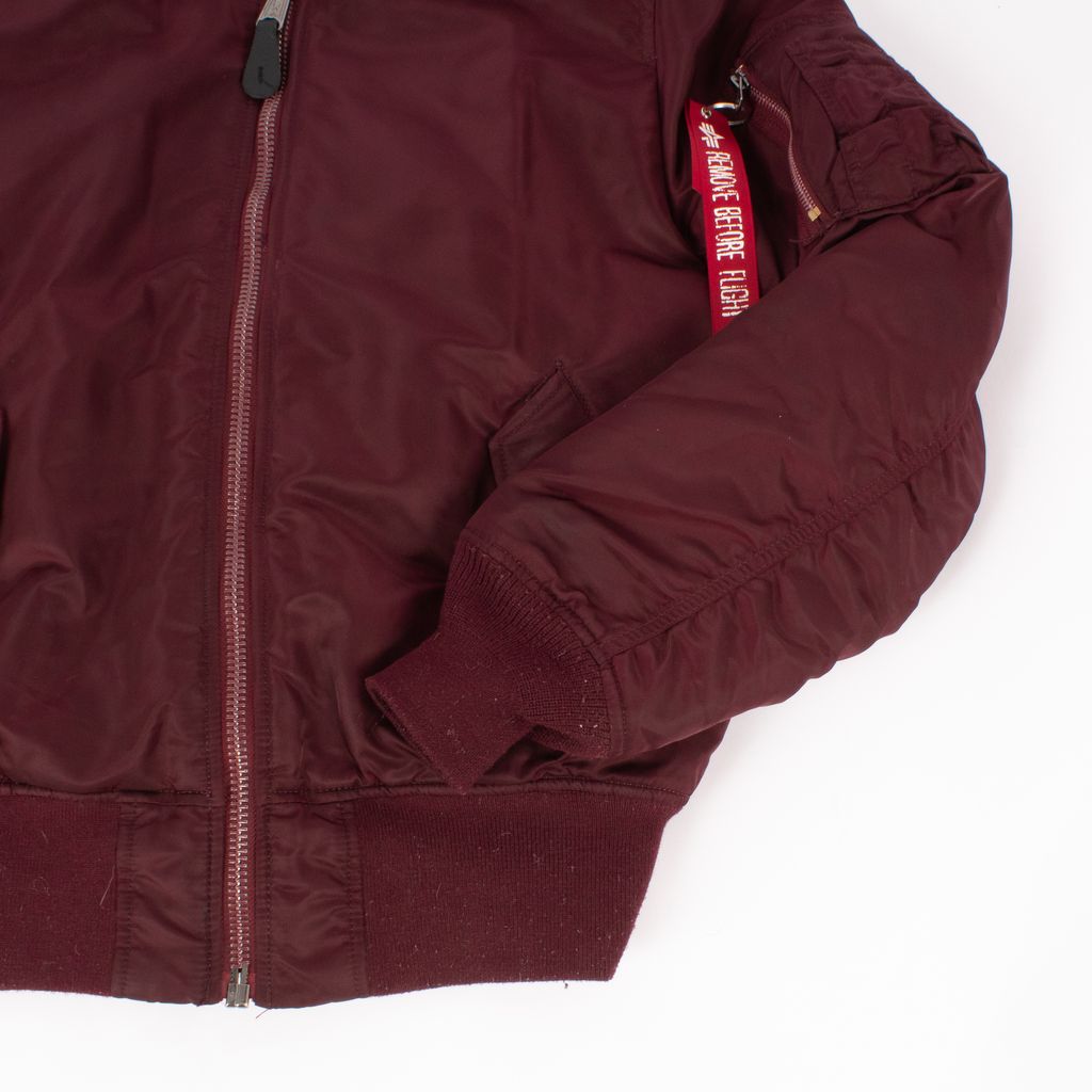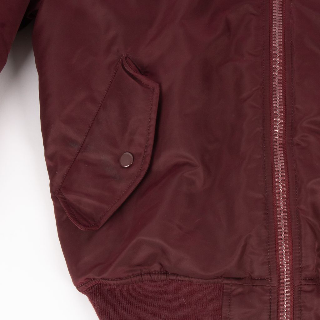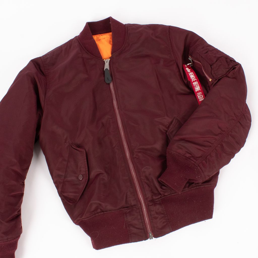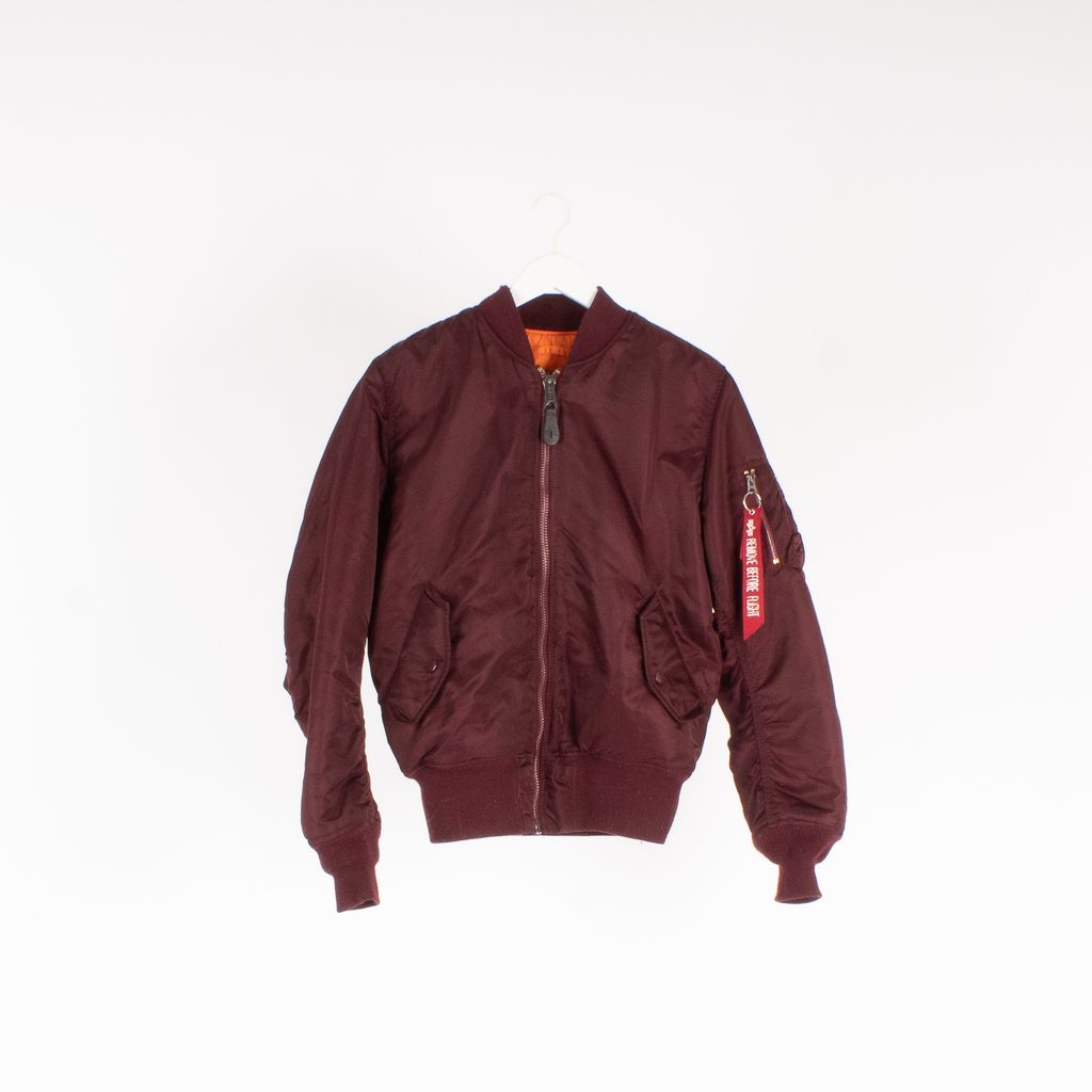 A cold winter, fashion friendly staple, this bomber from Alpha Industries will have you ready to brave the elements in style. Features zip front closure, snap closure flap pockets, thick rib knit bands at wrists and waist, iconic orange lining, and minor signs of wear. Signs of wear include mild staining on front and pilling on knit bands.