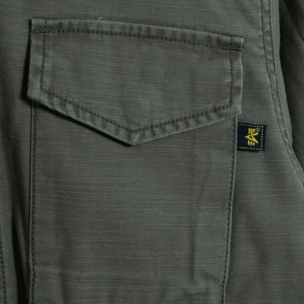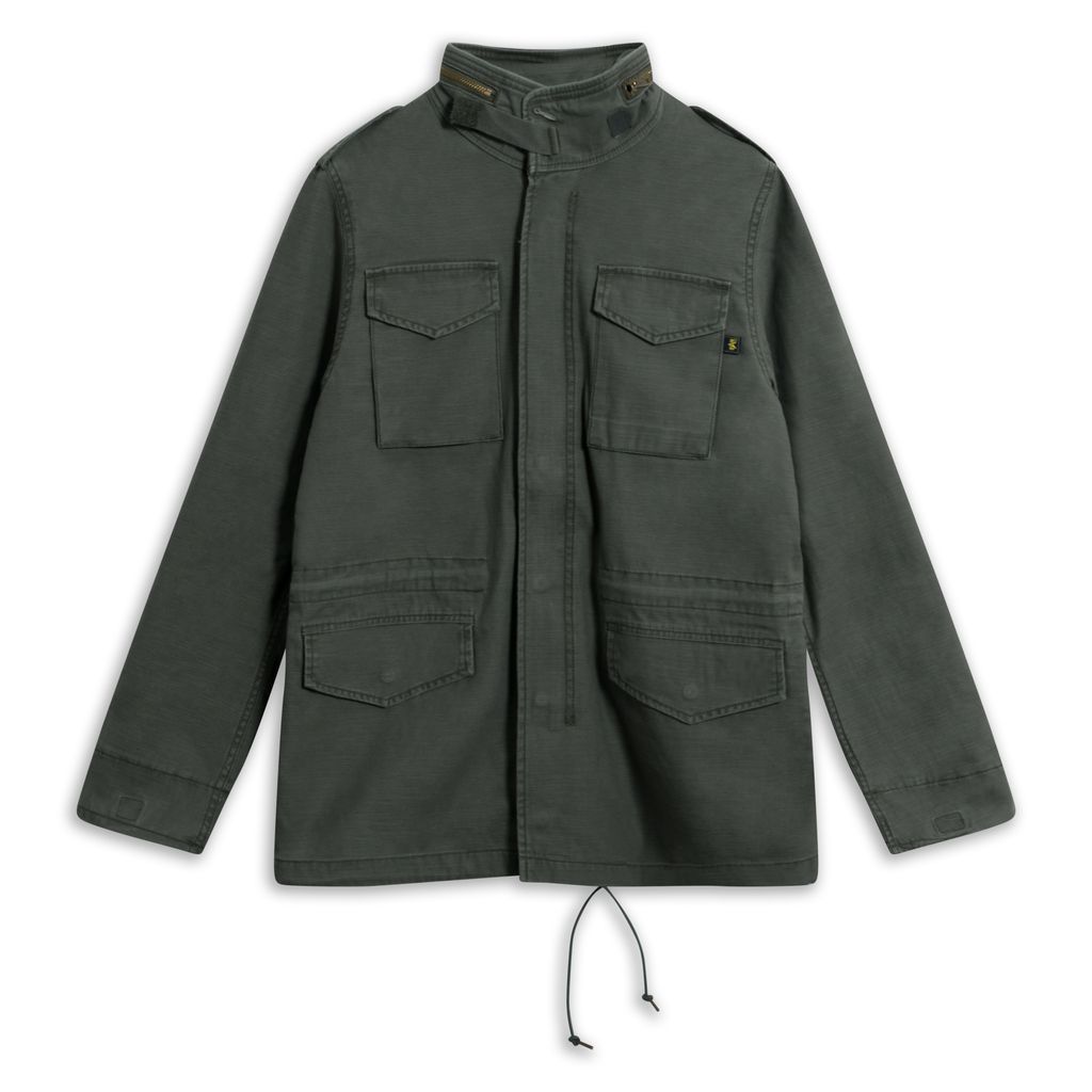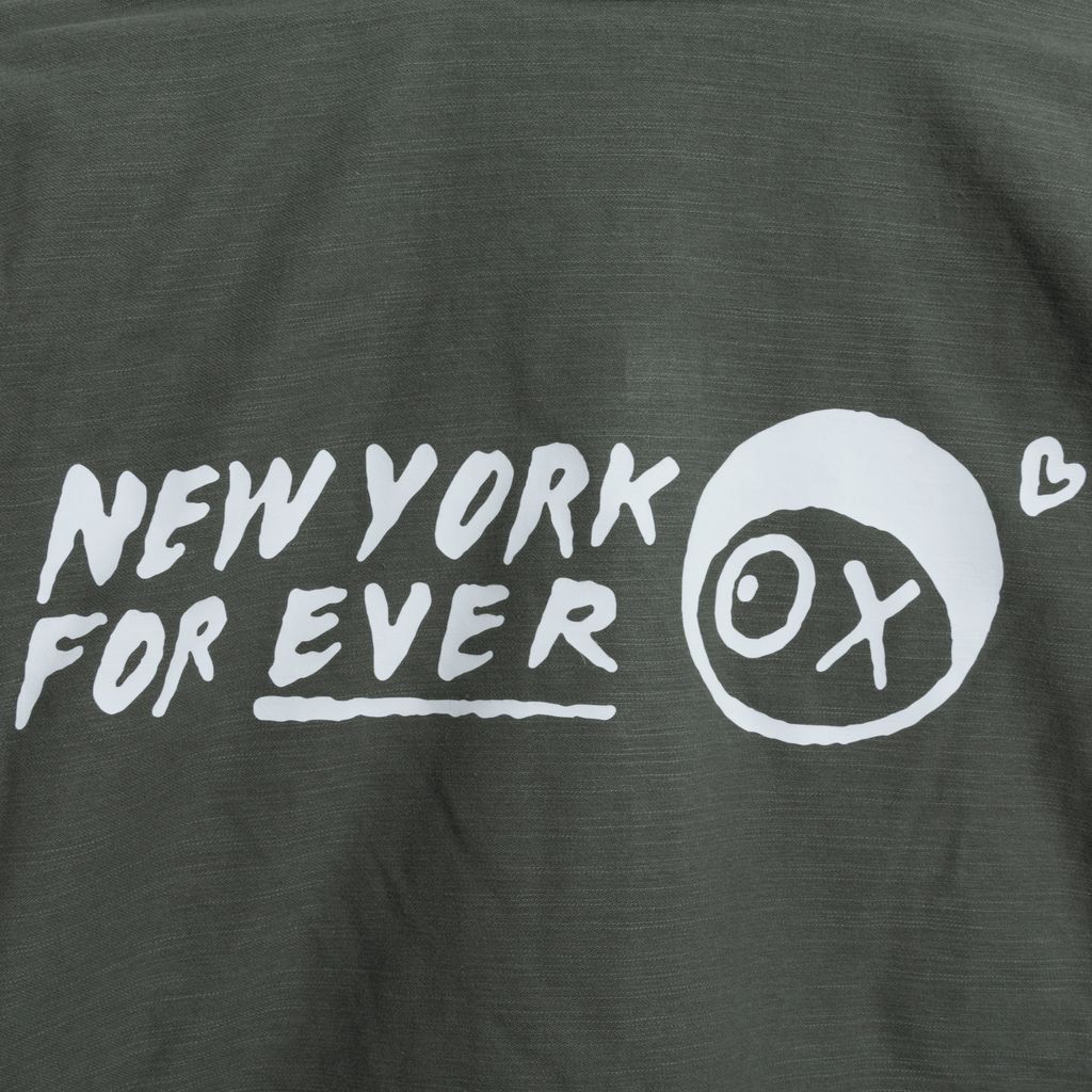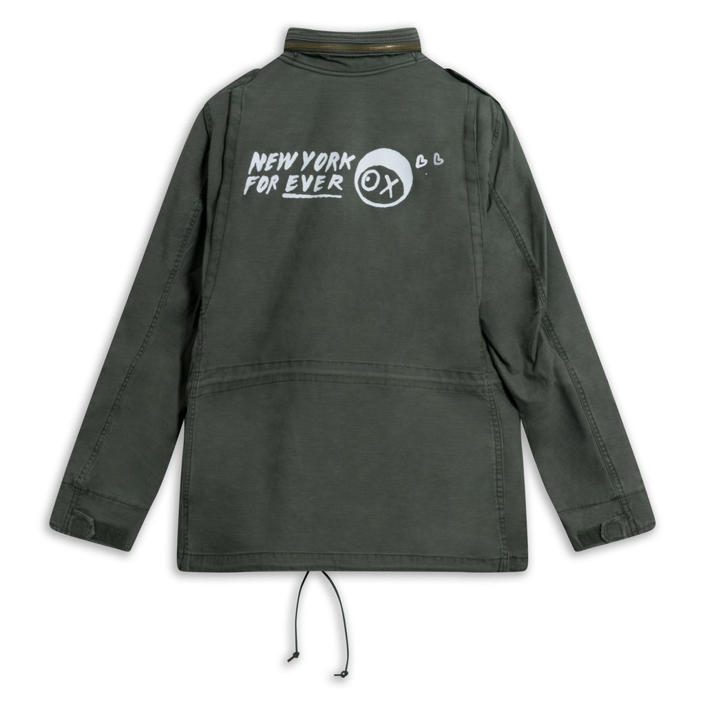 This field jacket is a part of the Alpha Industries x André Saraiva collaboration and is crafted from olive canvas and features shoulder epaulettes, collapsable hood, snap flap pockets and a military inspired "New York Forever" printed back graphic. Piece also features custom Mr. André pins. Brand new with tags attached.