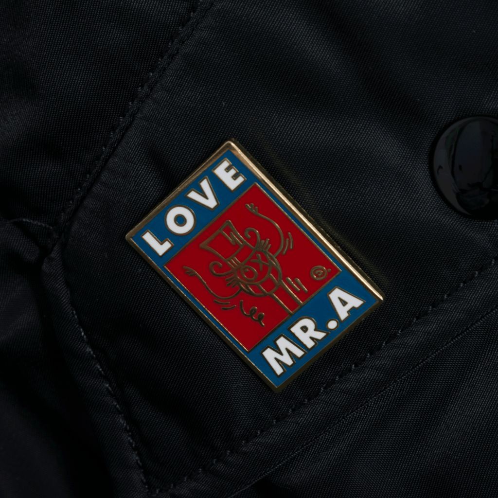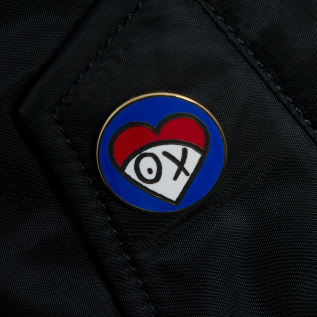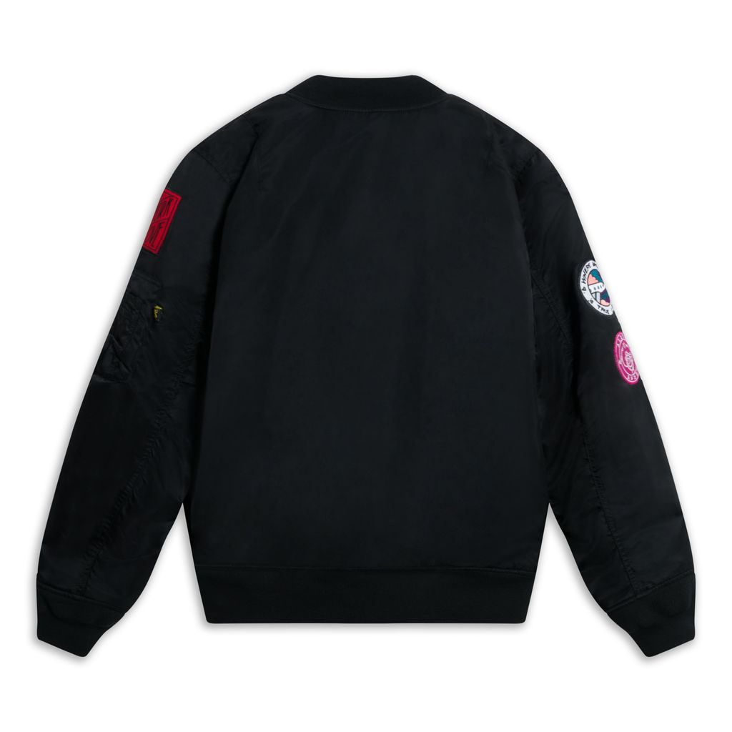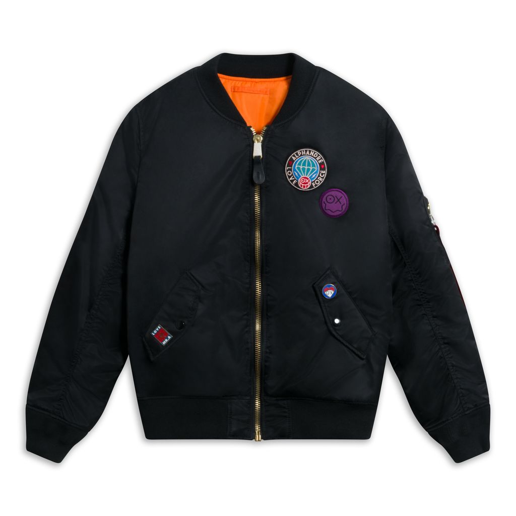 This bomber jacket is a part of the Alpha Industries x André Saraiva collaboration and features reversible black tech to orange tech fabric, front zip closure, assorted multi-color patches, multiple pockets and custom Mr. André pins unique to each piece, this bomber is one of a kind. Brand new with tags attached.