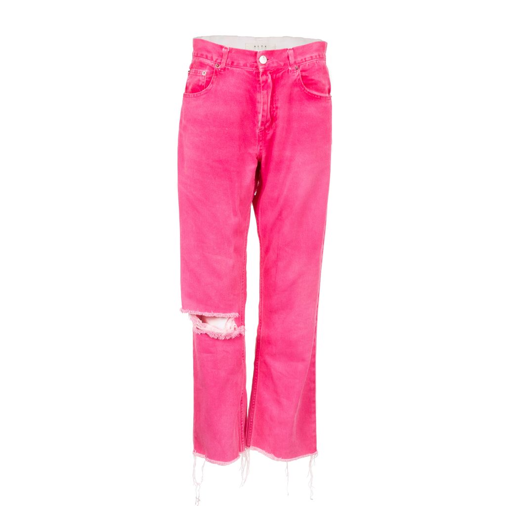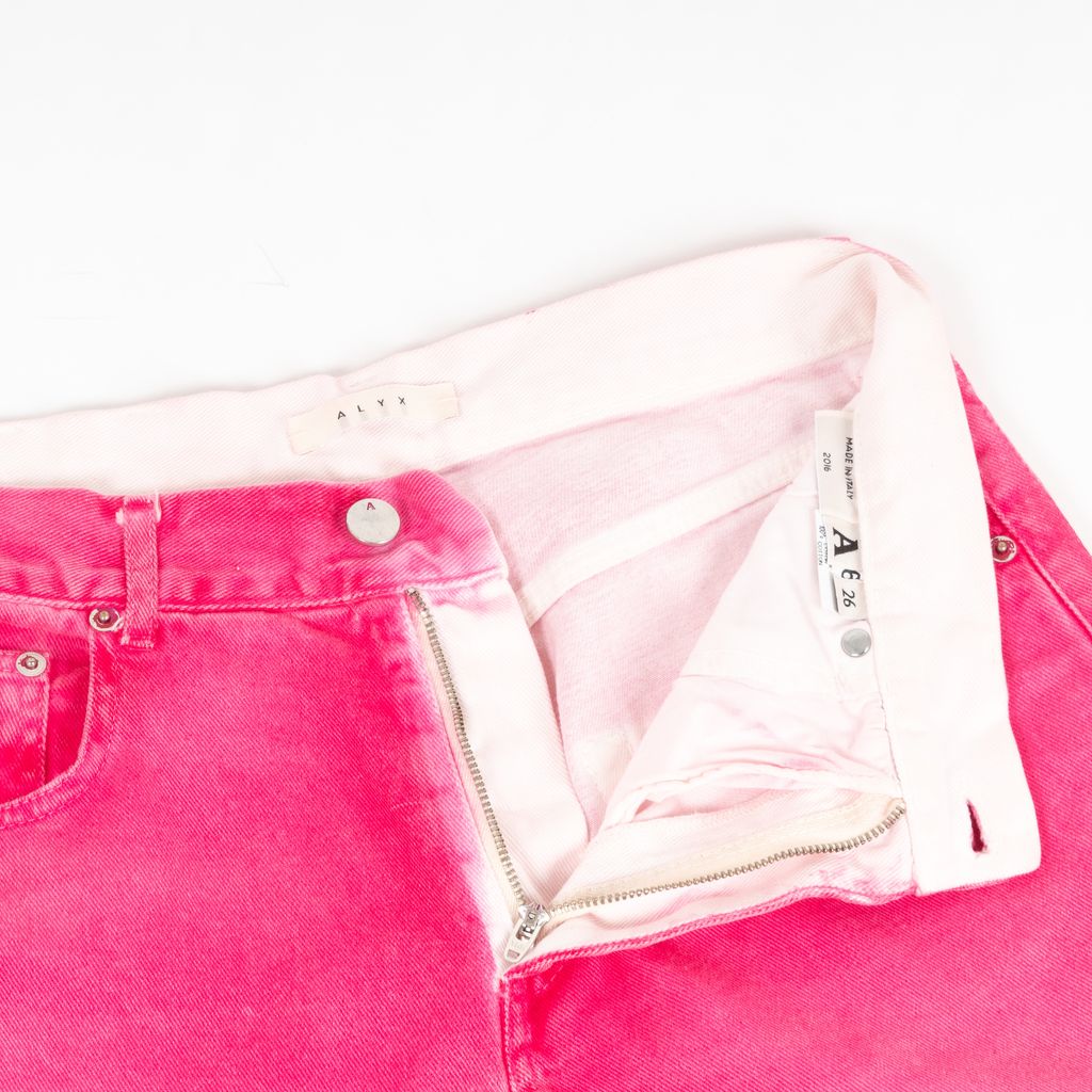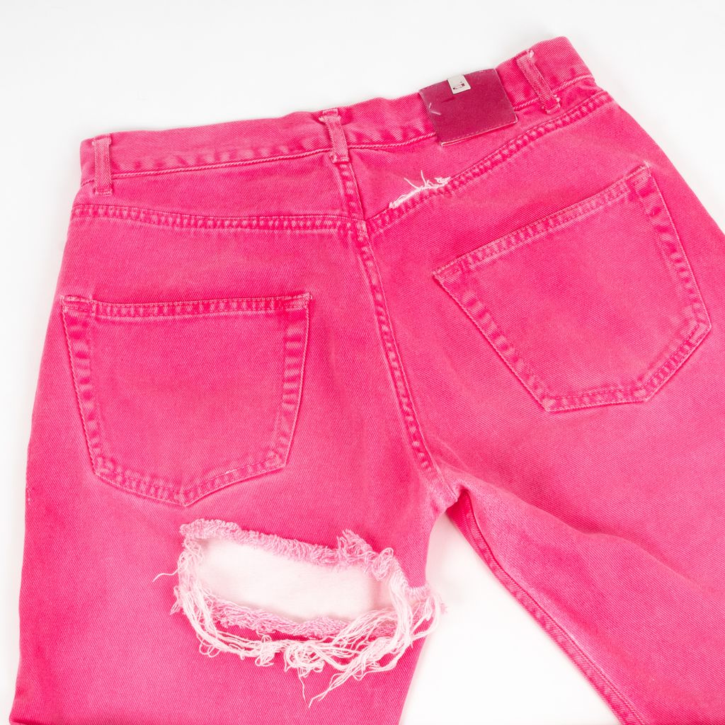These hot pink distressed jeans from Alyx would have Elle Woods shook. Features high rise straight leg silhouette, raw hemline, distressing on the right knee and under left back pocket, faded pink wash, button fly closure, and minor signs of wear. Signs of wear include markings on pant legs as photographed.