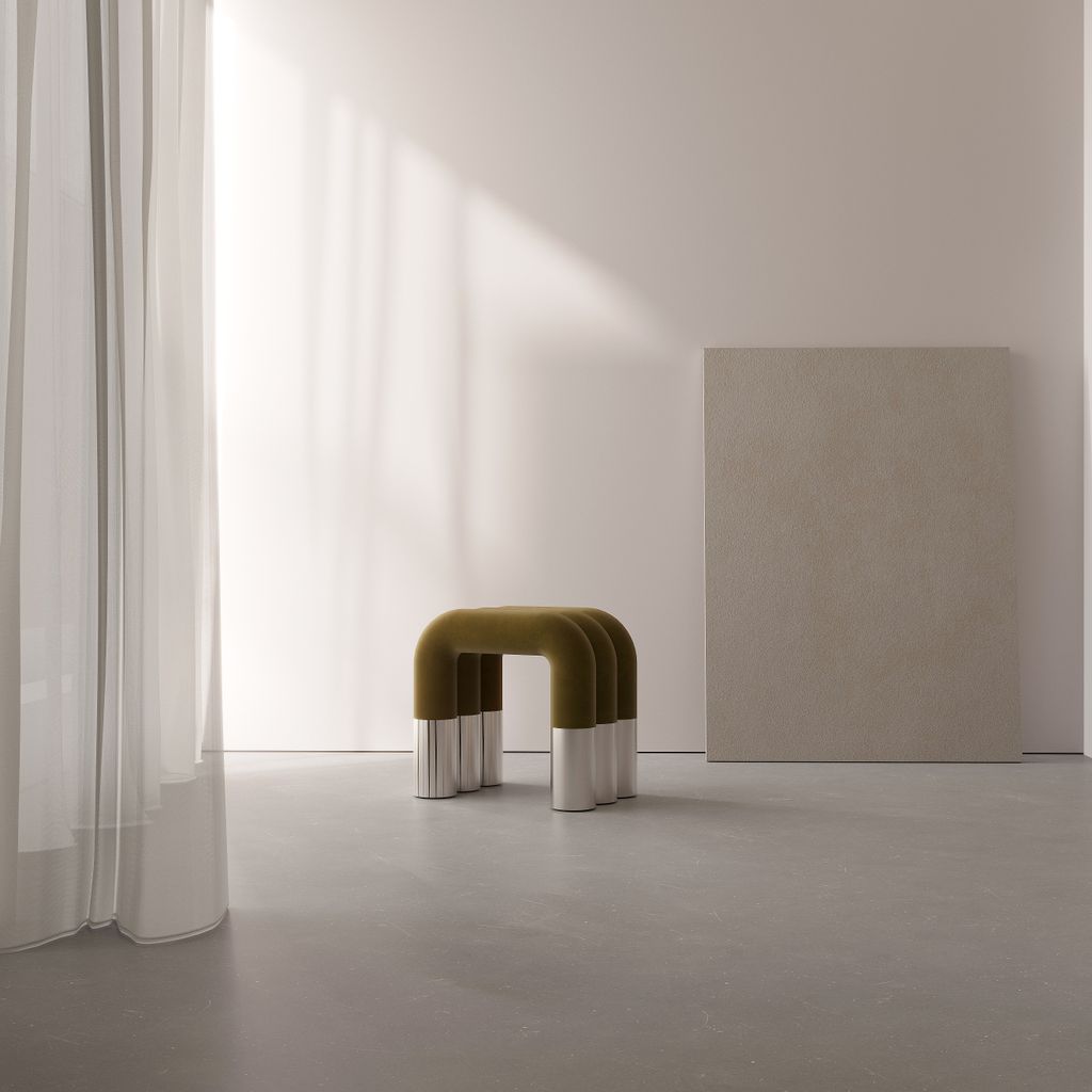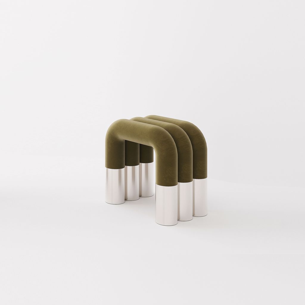 Who is Amadeo? Amadeo is the traveler, the avant-garde. An upholstered in velvet, stool composed of three cylindrical tubes with satin metal legs.