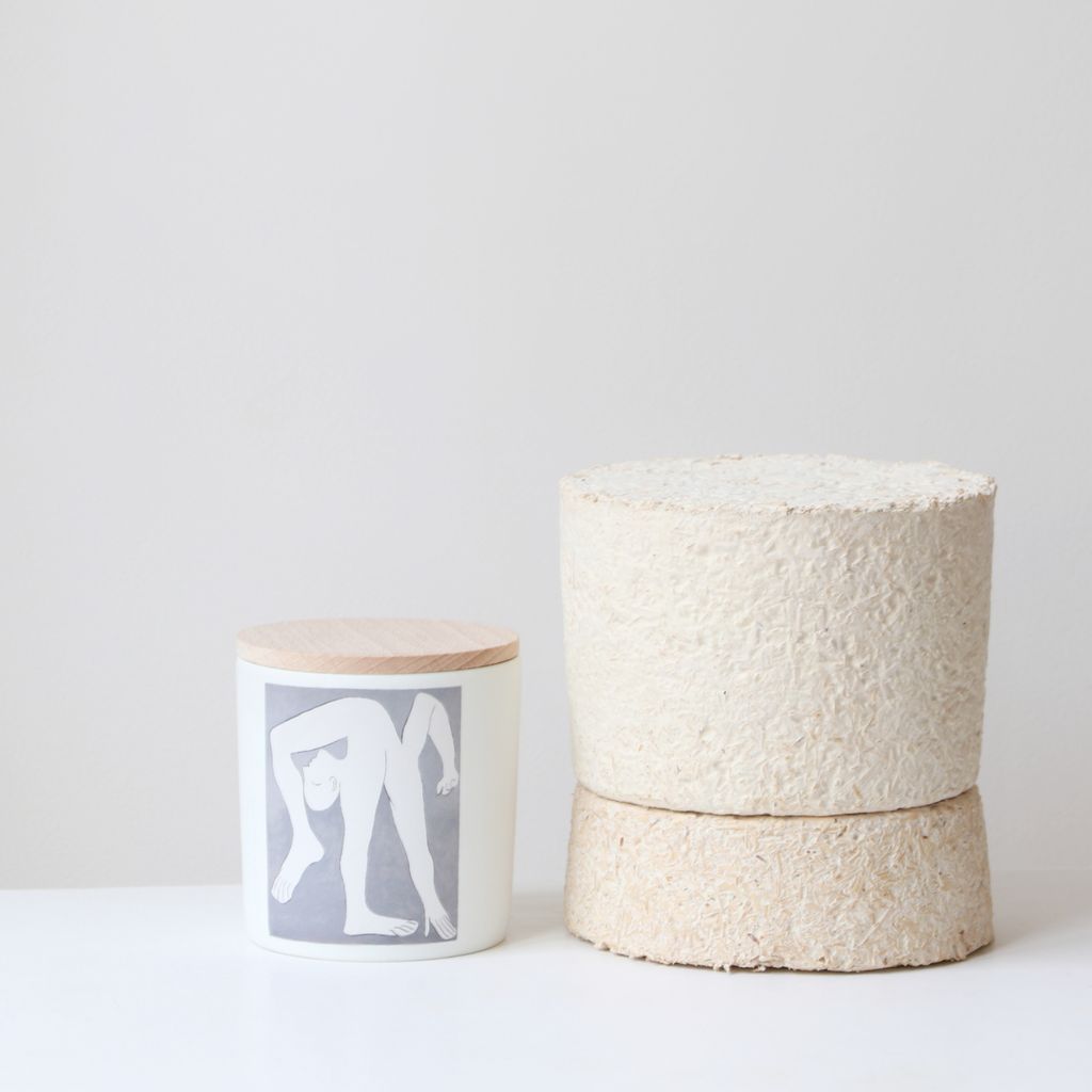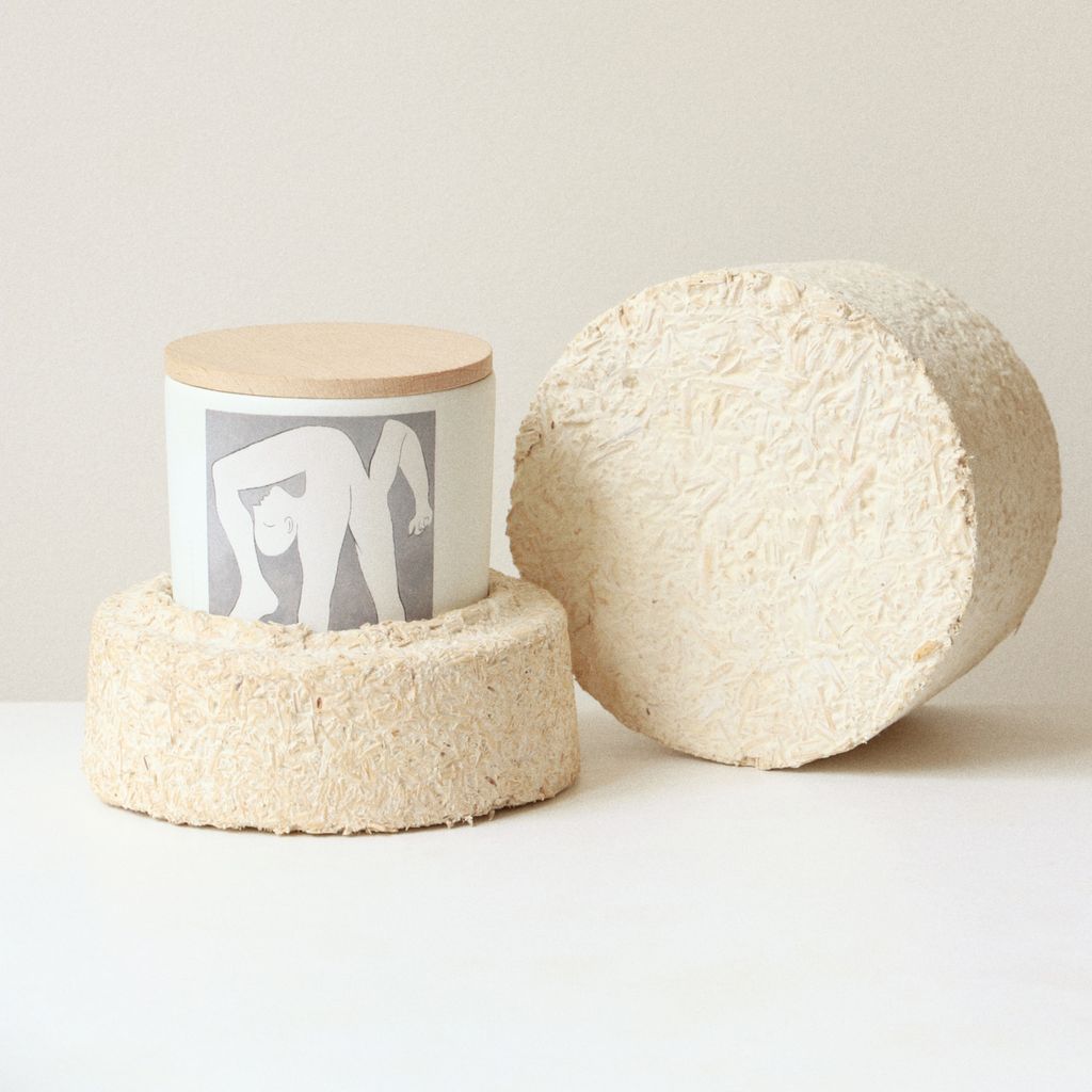 Amen Picasso Ginger Scented Candle features 200 g of natural vegetal wax, white porcelain jar, reforested wood coer lid, CO2 negative emission, and circular biodegradable mushrooms packaging.