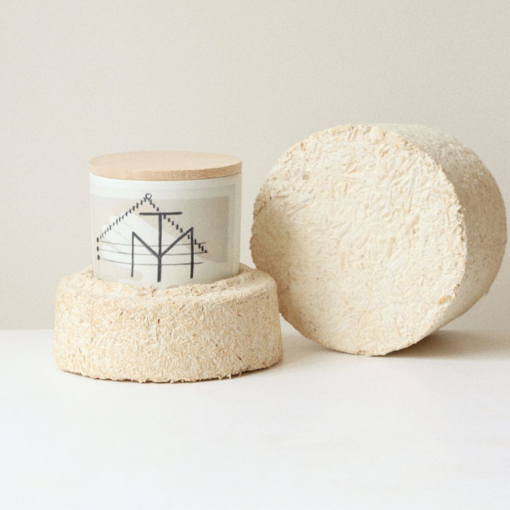 Amen Picasso Jazmin Scented Candle features 200 g of natural vegetal wax, white porcelain jar, reforested wood coer lid, CO2 negative emission, and circular biodegradable mushrooms packaging.