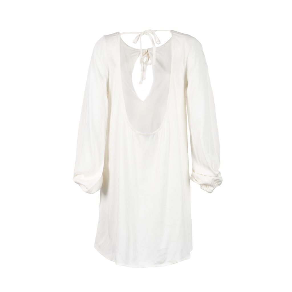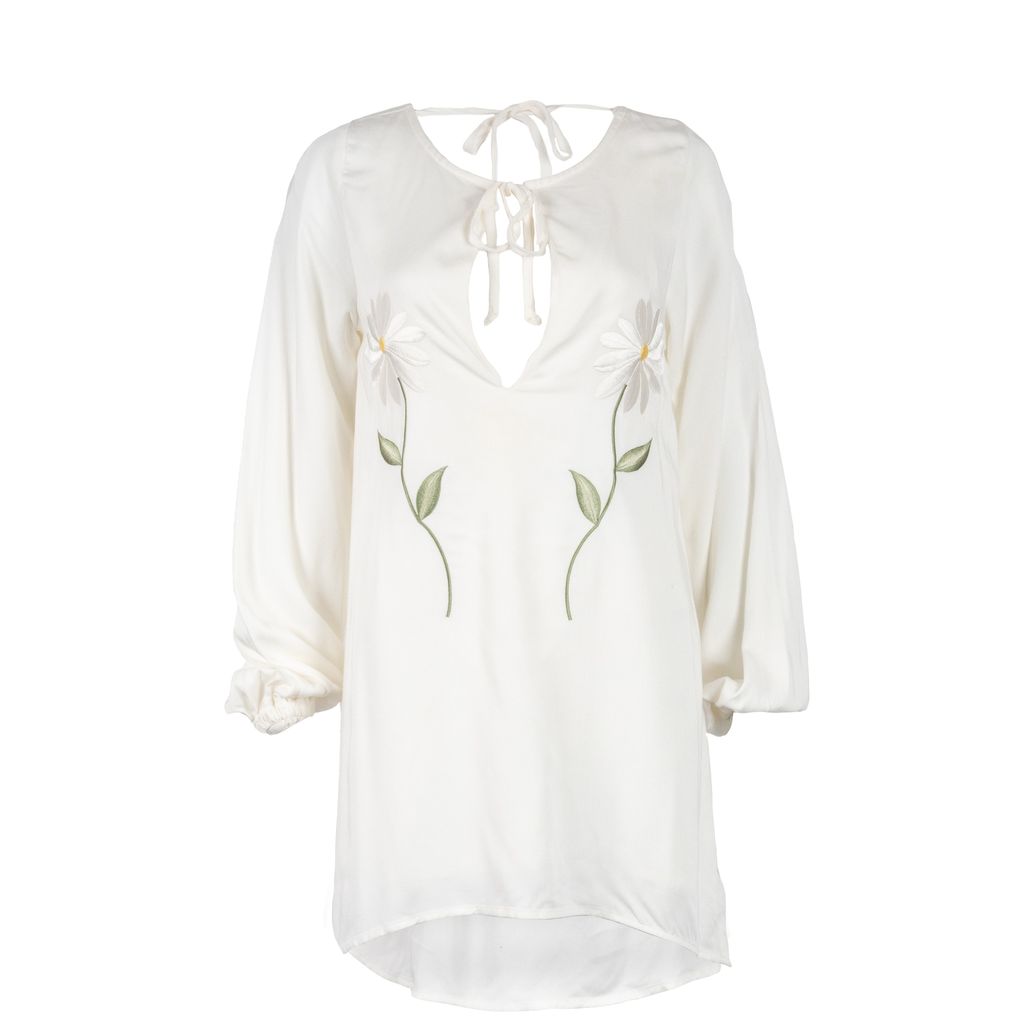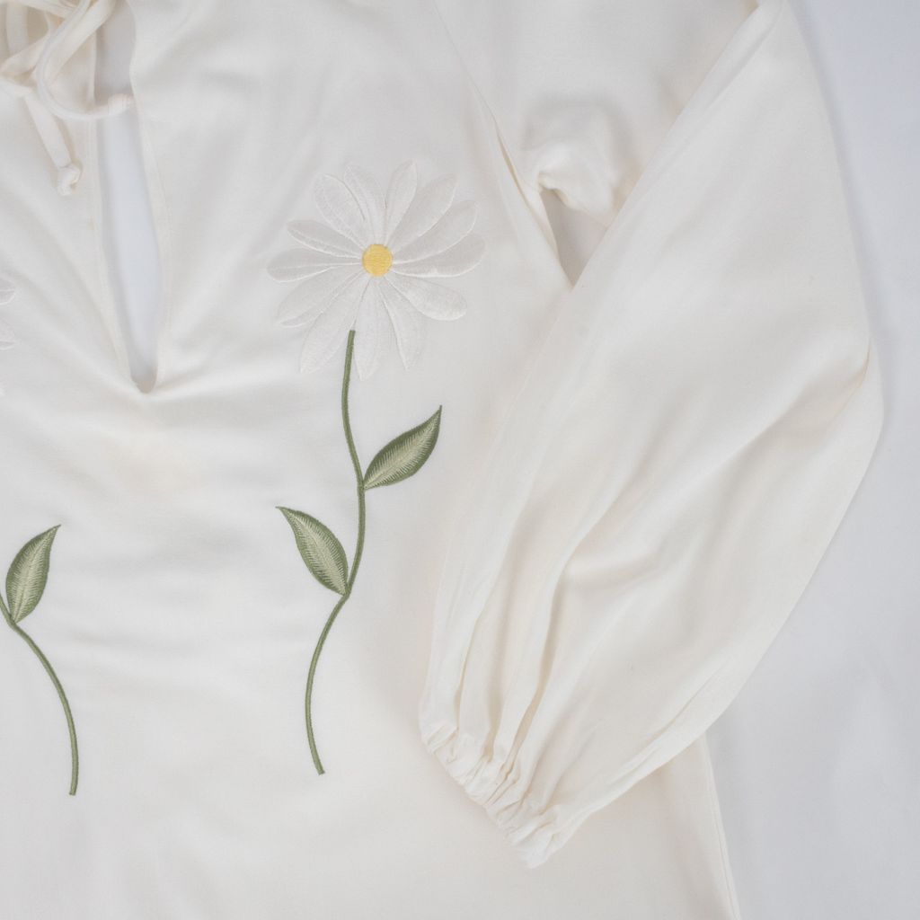 This vintage mini dress from American Gold is the ultimate display of flower power. Features large keyhole at neck with tie closure, set of embroidered daisies on chest, balloon sleeves with elastic at wrists, tonal lining, and deep scoop back.