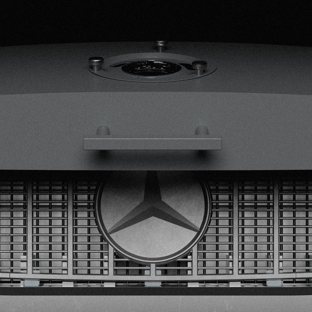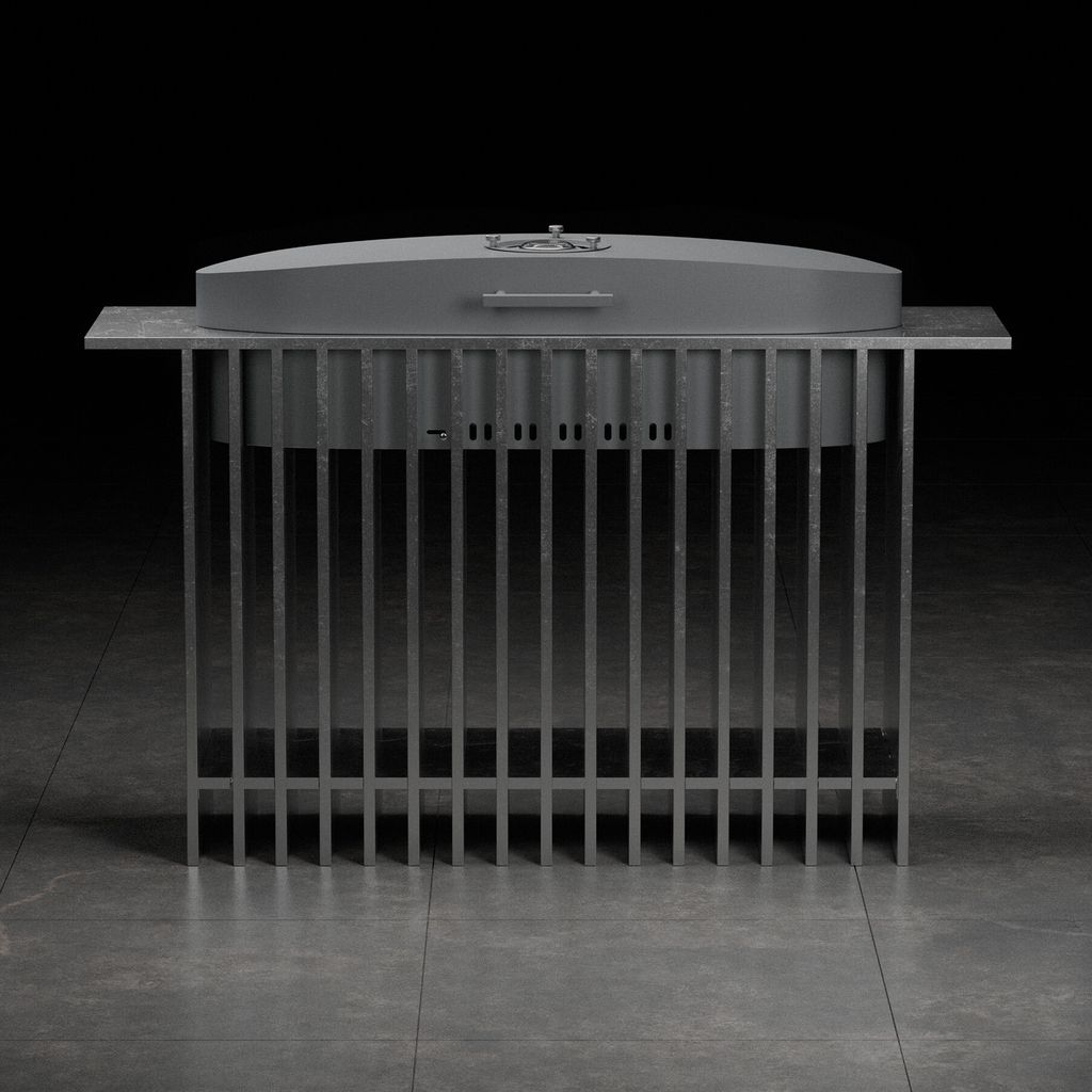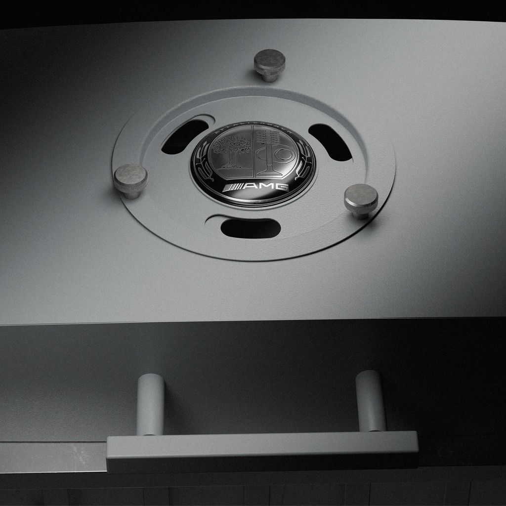 A long charcoal grill patterned from an amg gt front grille on a geometric base of solid anodized aluminum slabs.