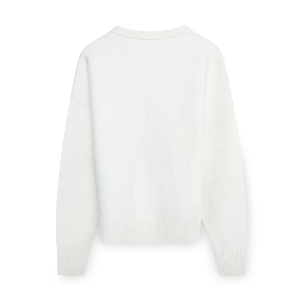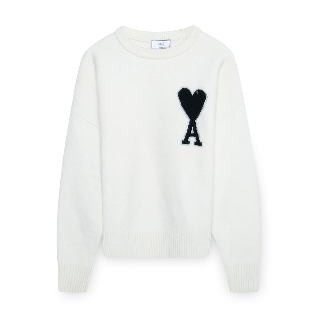 AMI Alexandre Mattiussi Off-White Ami De Cœur Sweater features rib knit crewneck, hem, and cuffs, dropped shoulders, and intarsia logo graphic at chest.