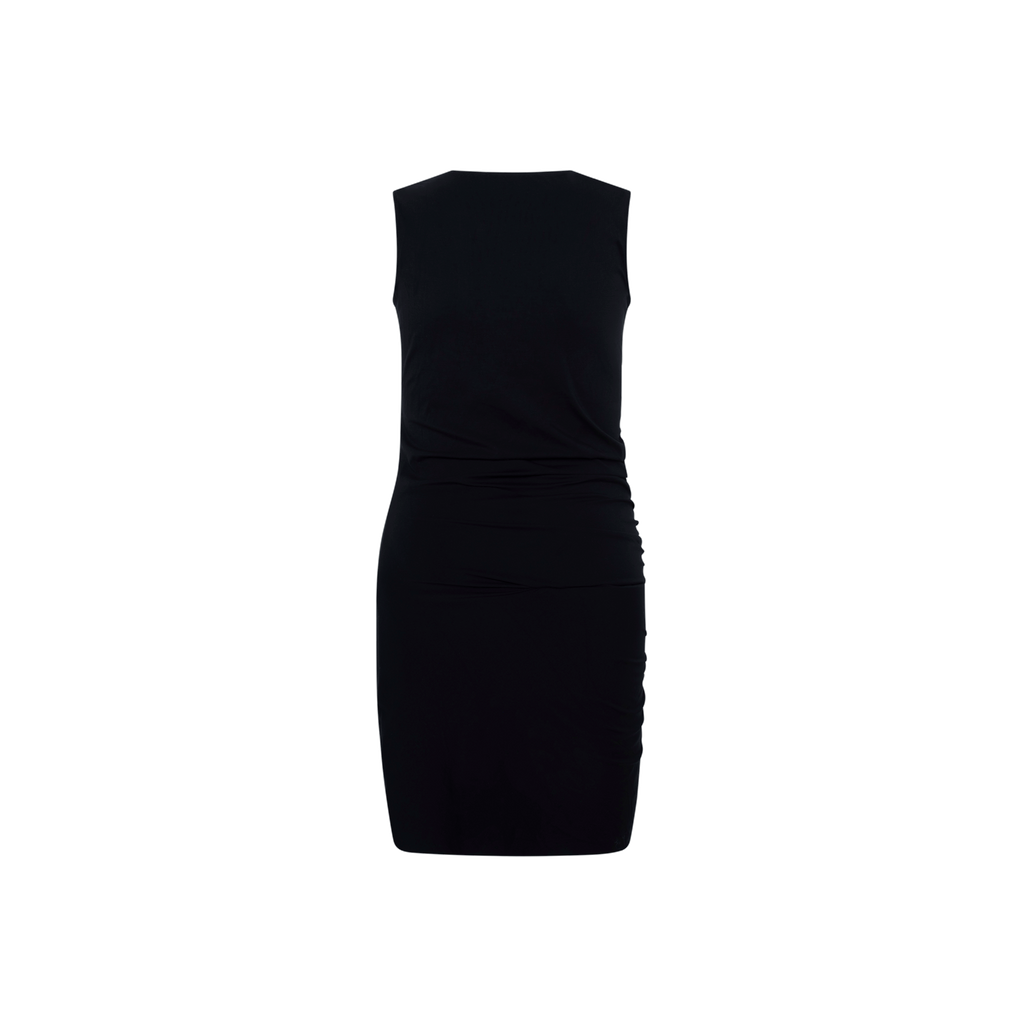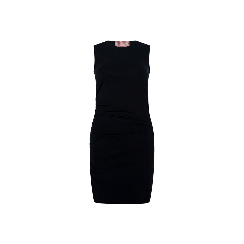 Amina Muaddi x Wolford Black Ruched-Side Jersey Dress features figure sculpting jersey, ruching down the side, and mini length.