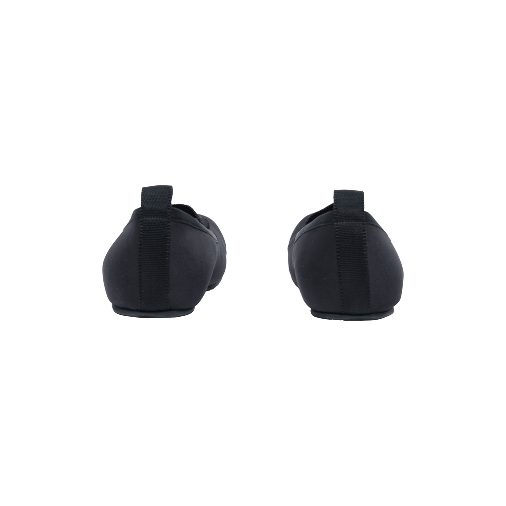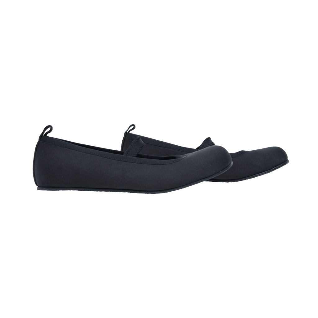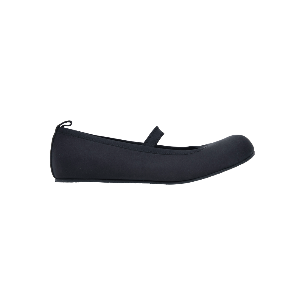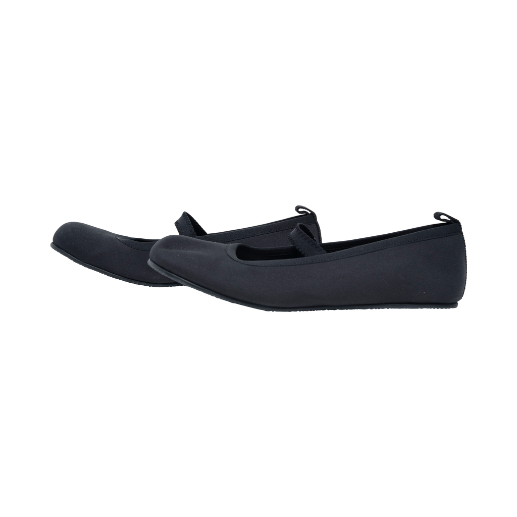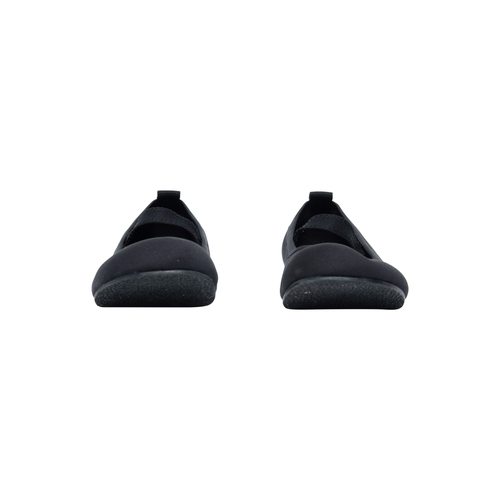 Amomento Black Ballet Flats features slightly square toe, elastic top strap, and rubber soles.