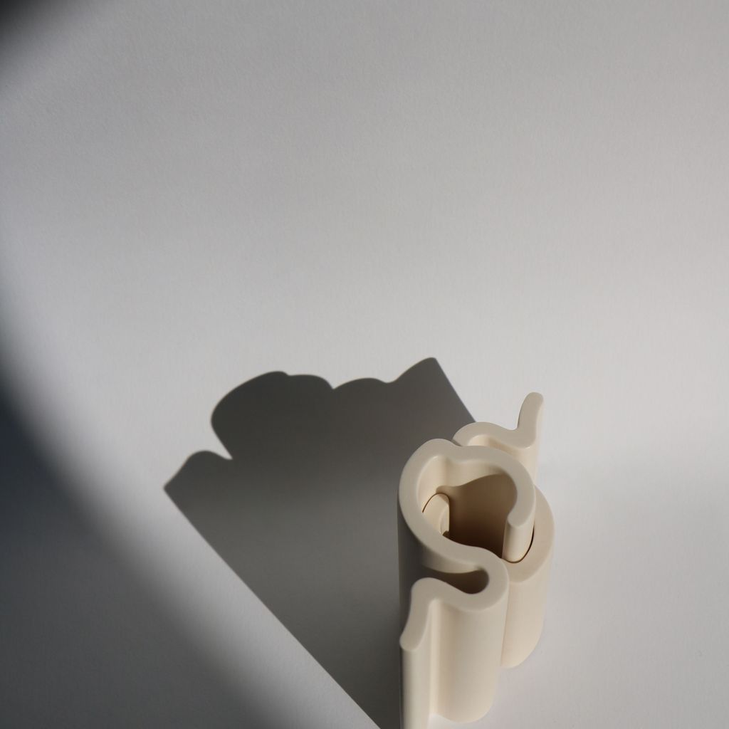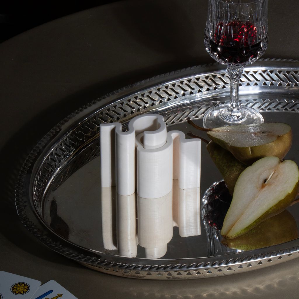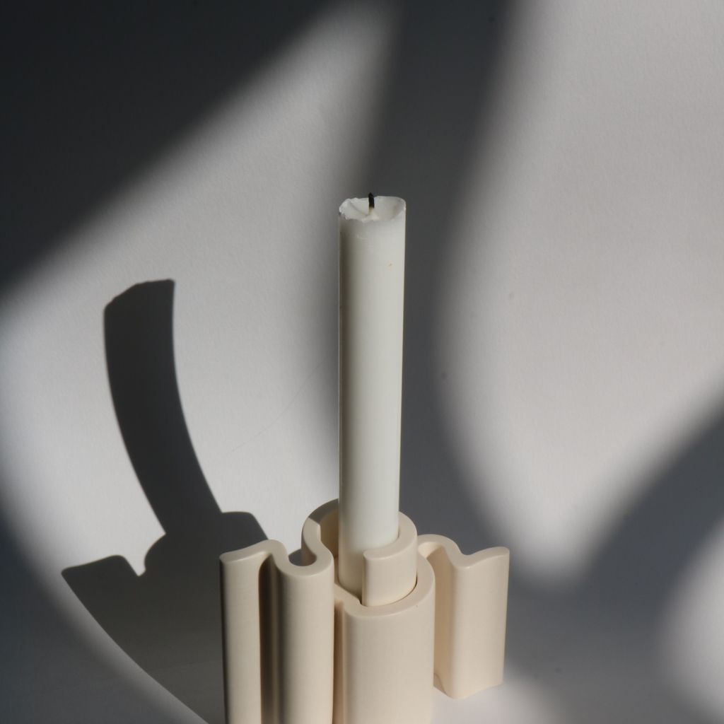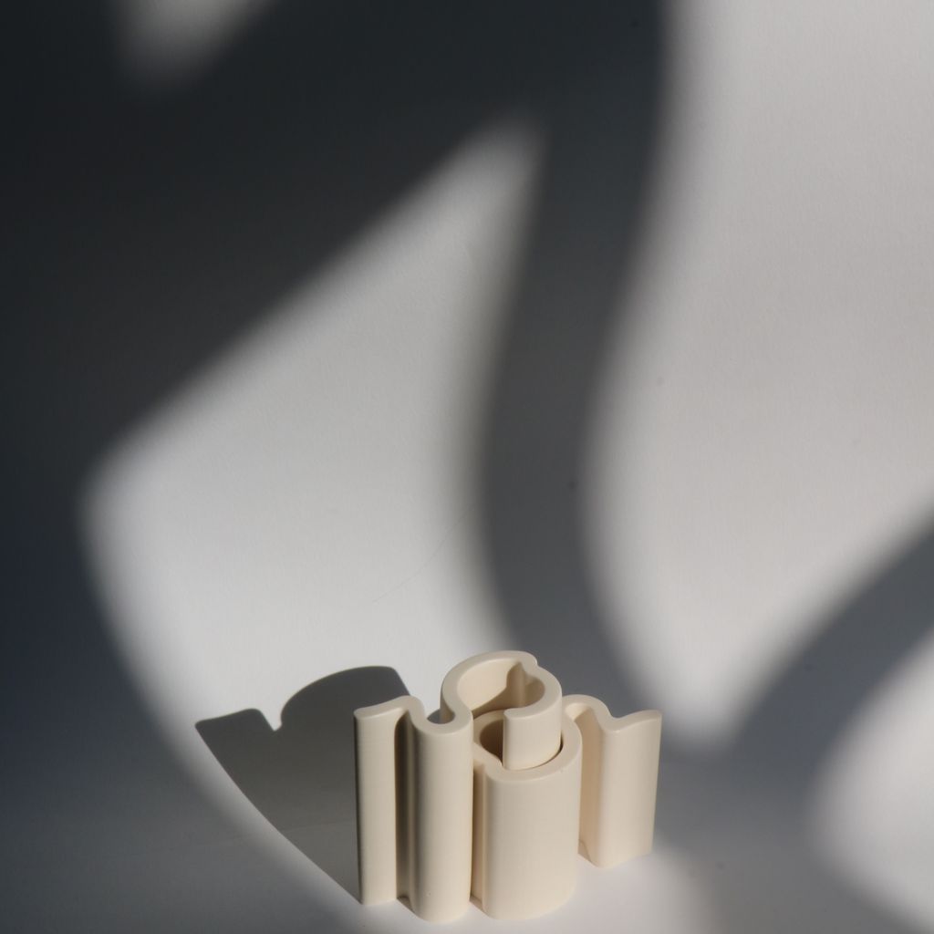 These candleholder pieces interlock with each other in a playful way, creating unique shapes, much like a living typography. Like an arch, they are sealed together by a keystone: the candle. Two base pieces form the candle holder, sealed by a 2.2 cm diameter candle. Another piece can be added to create new candle holes. The possibilities are endless, like a constantly evolving alphabet of light!