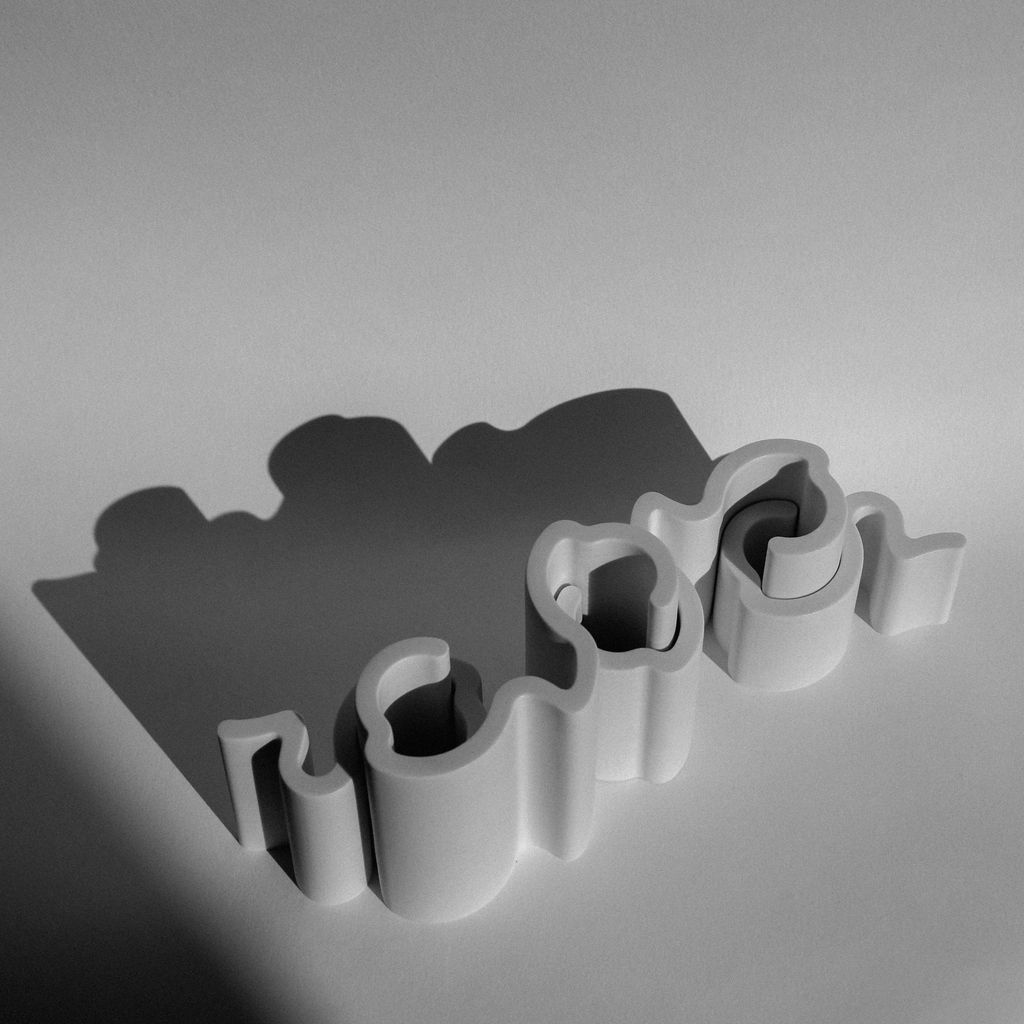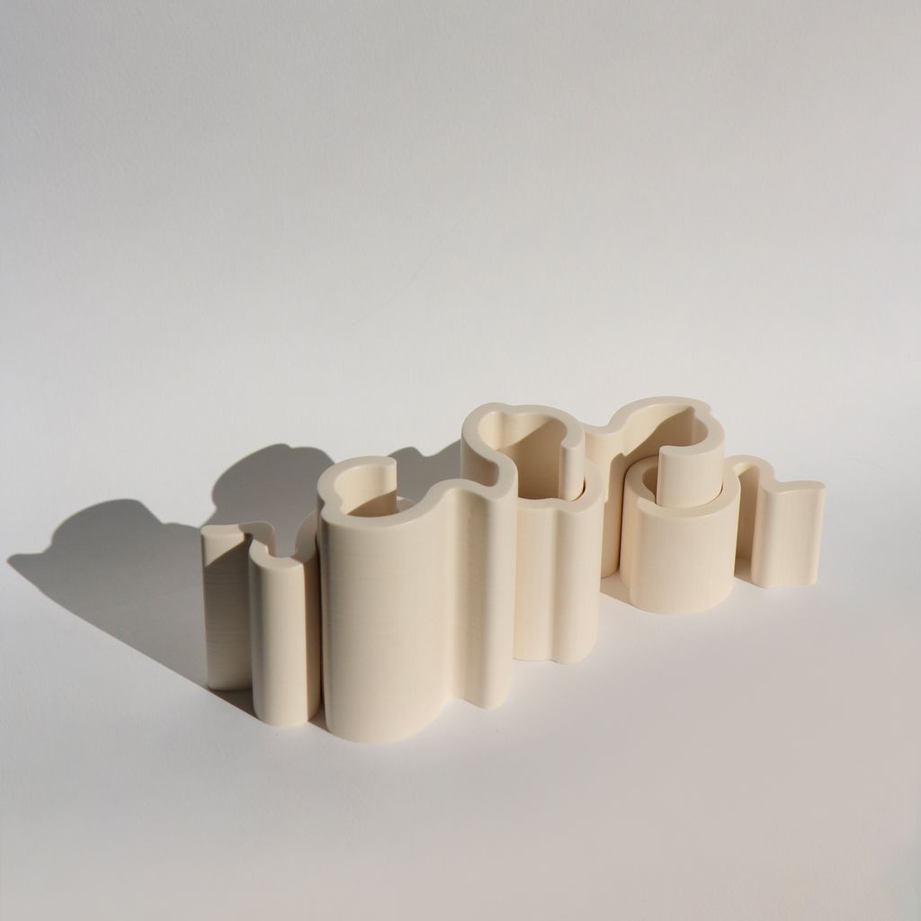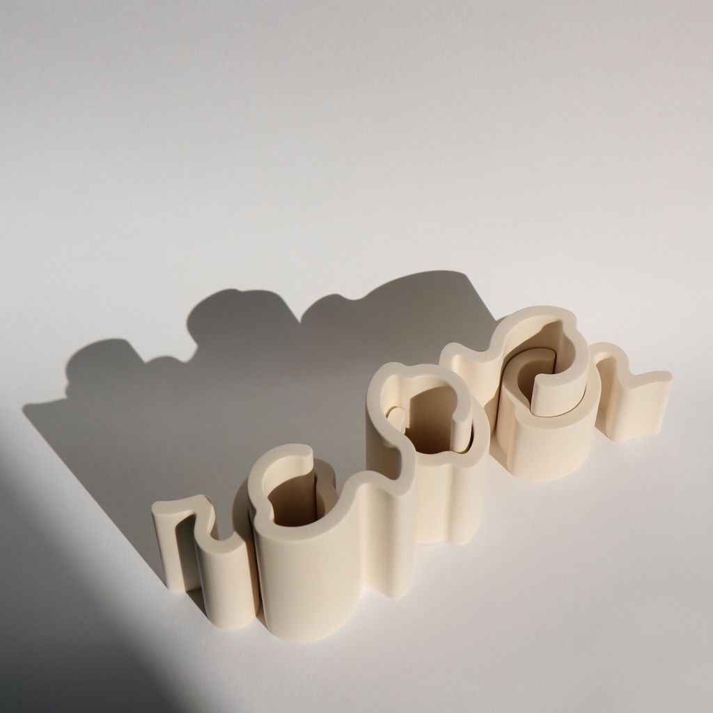 These candleholder pieces interlock with each other in a playful way, creating unique shapes, much like a living typography. Like an arch, they are sealed together by a keystone: the candle. Two base pieces form the candle holder, sealed by a 2.2 cm diameter candle. Another piece can be added to create new candle holes. The possibilities are endless, like a constantly evolving alphabet of light!
