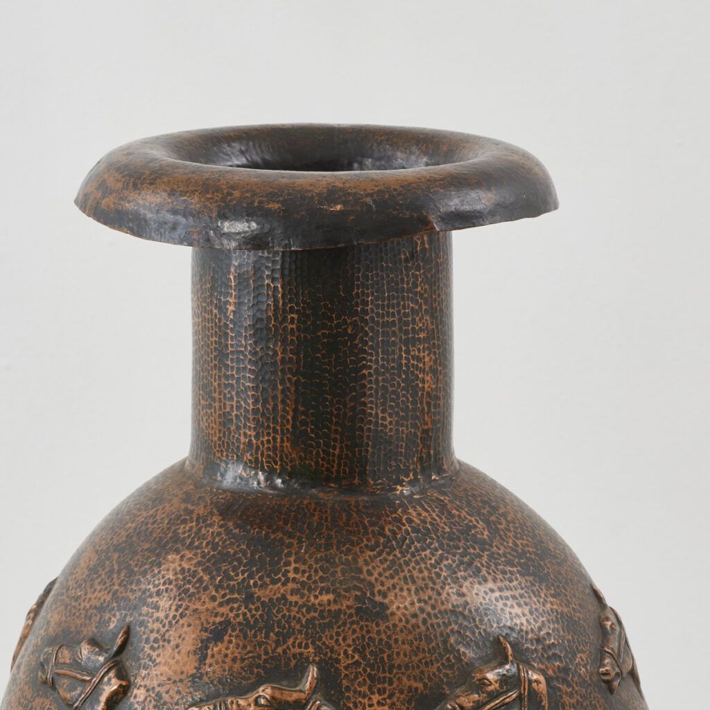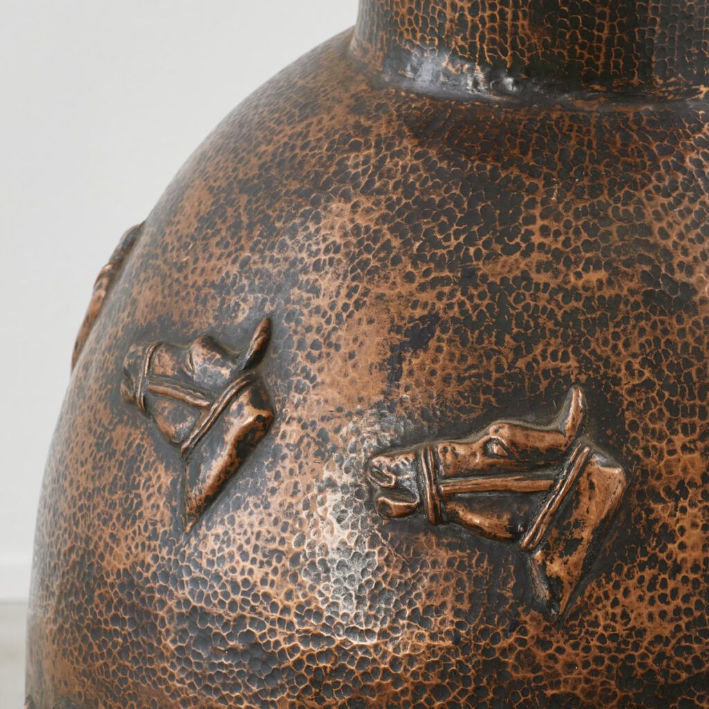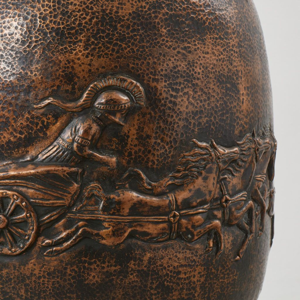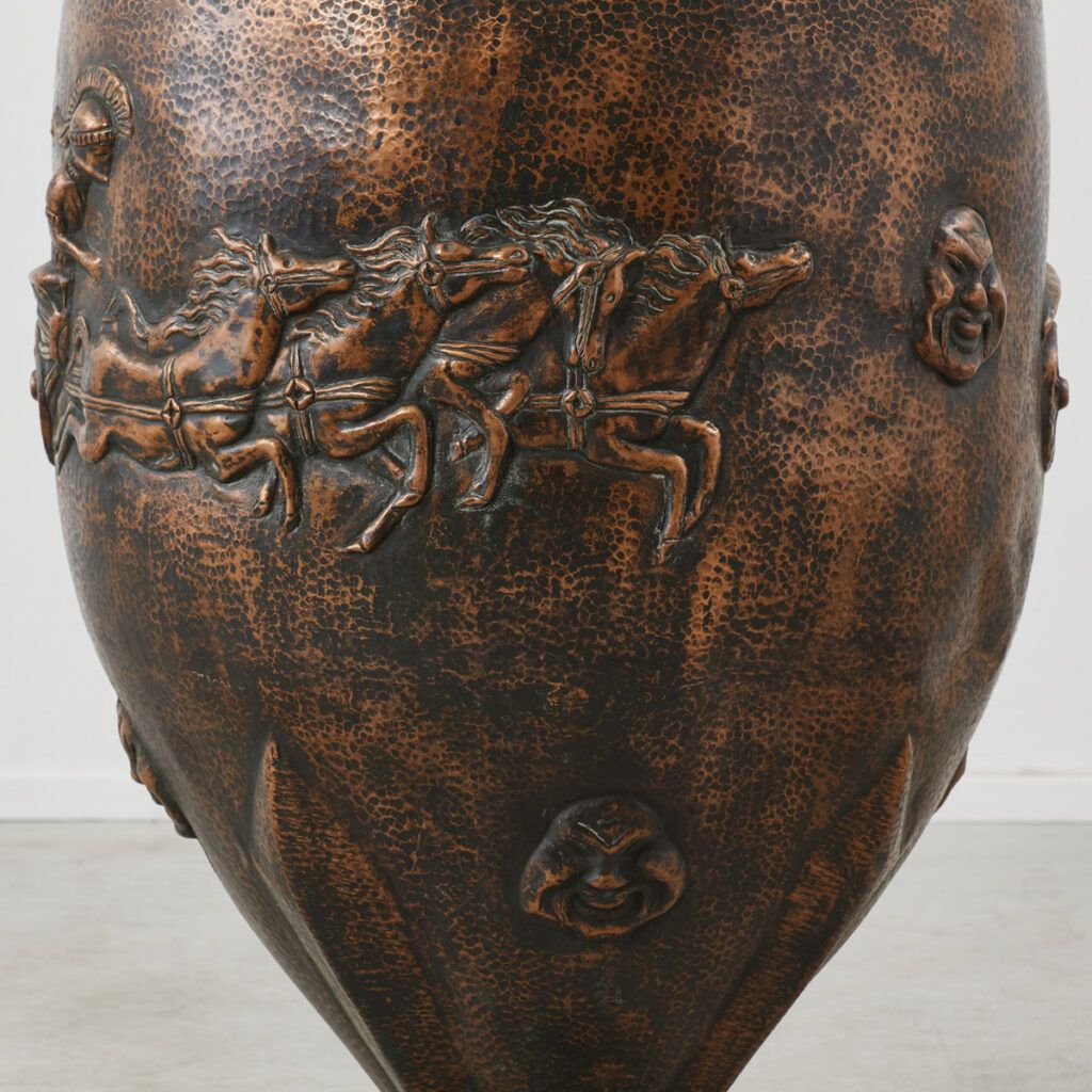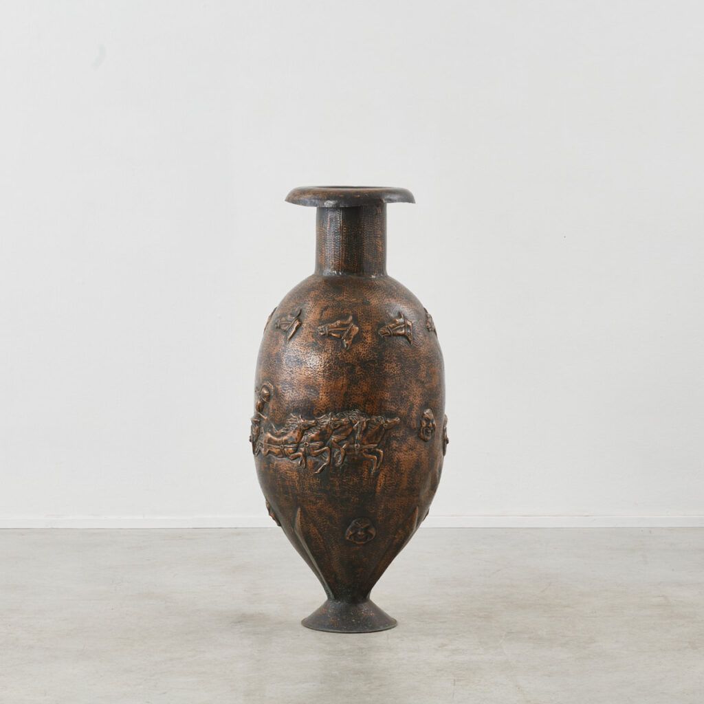 With its elegant straight neck and ovoid body, this rare oversized Bragalini vase is distinctly urn-like. The burnished copper surface is wrapped in figurative motifs of Roman chariot racers and horses, while four sword-like elements emerge from the flared base.