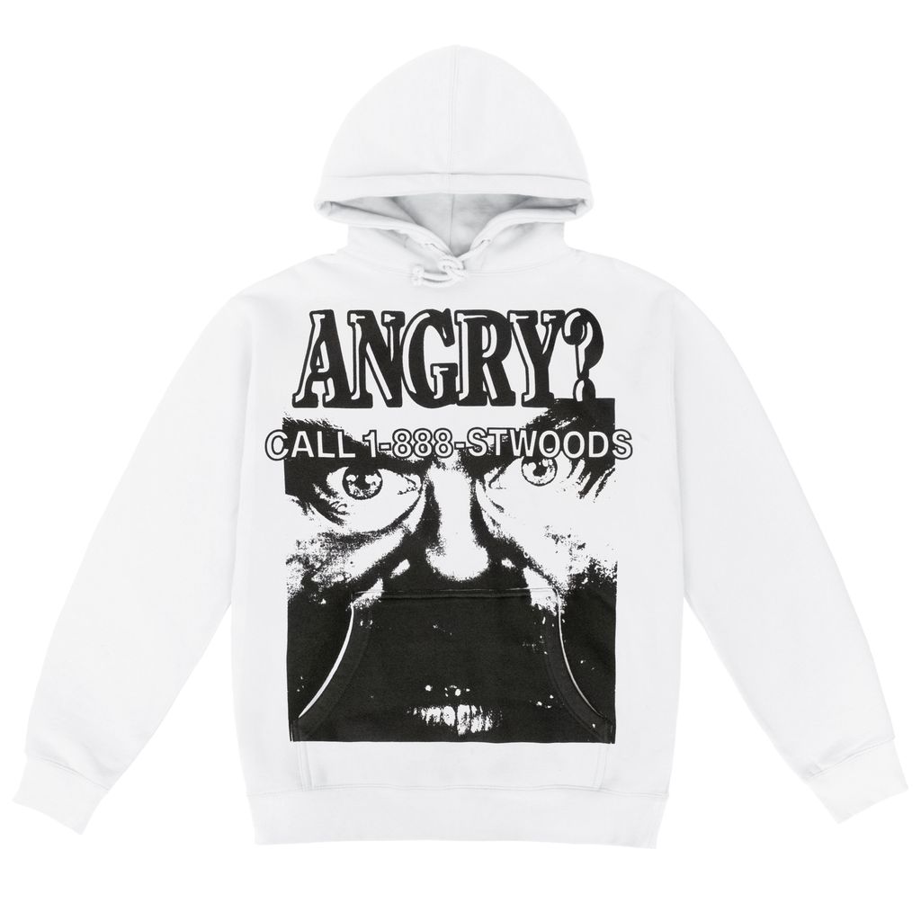 SW Angry Hoodie is a long sleeve cotton fleece hoodie in white featuring a fleece lined hood with drawstring and nickel eyelets, all over screen print graphic at front, Kangaroo pocket at waist // 1x1 rib knit cuffs and hem, split stitch double needle sewing on all seams and twill neck tape. Made in Canada.