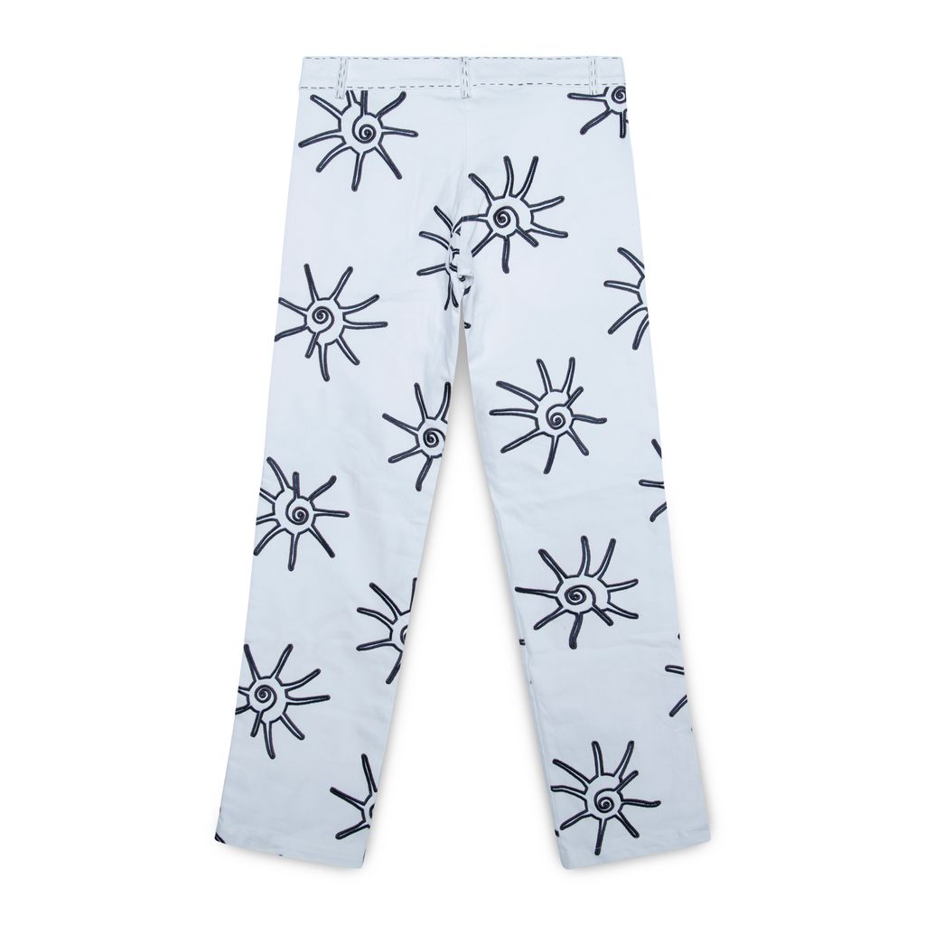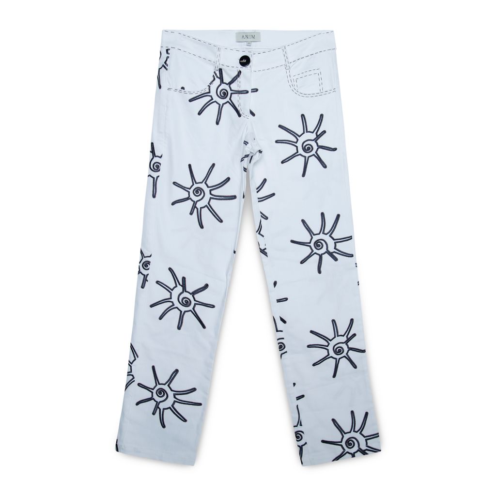 Anim Sun Embroidered White Jeans features straight leg fit, brown and navy blue embroidery, 3-pocket styling, and zip closure.