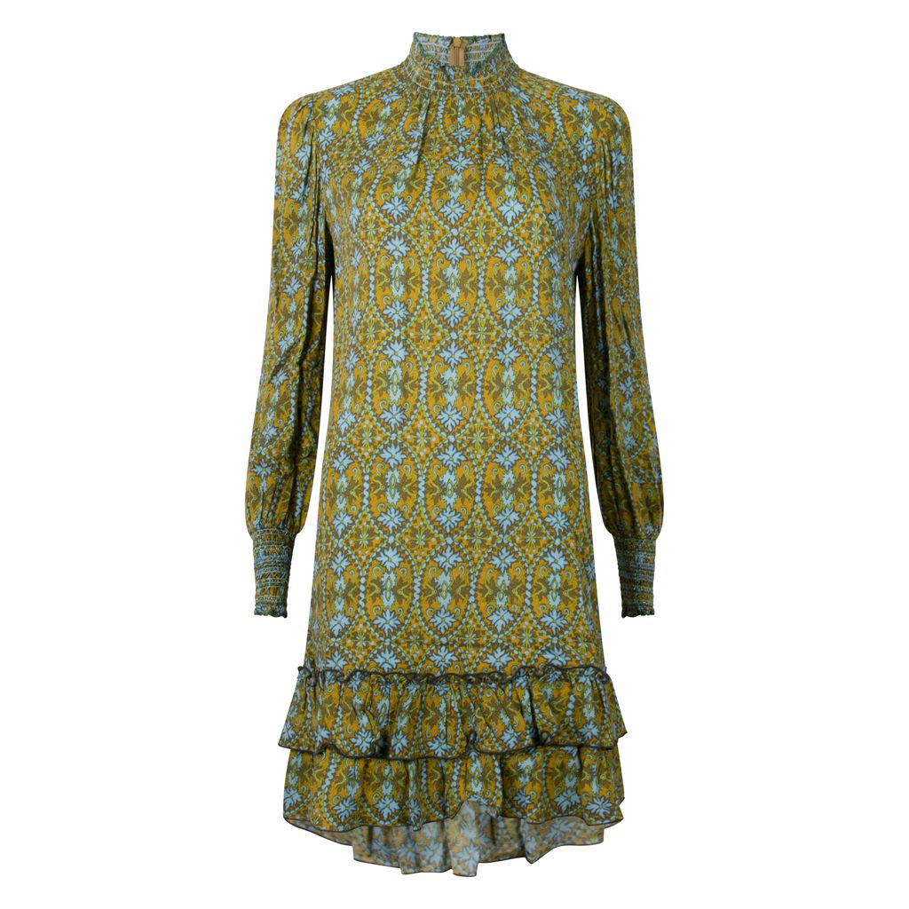 This printed dress from Anna Sui features a high smock neckline, hidden back-zip closure for easy wear, long sleeves with smock stretch cuffs, a tiered ruffle hemline, and has a A-line silhouette. Like new, in amazing condition. Dress is unlined.
