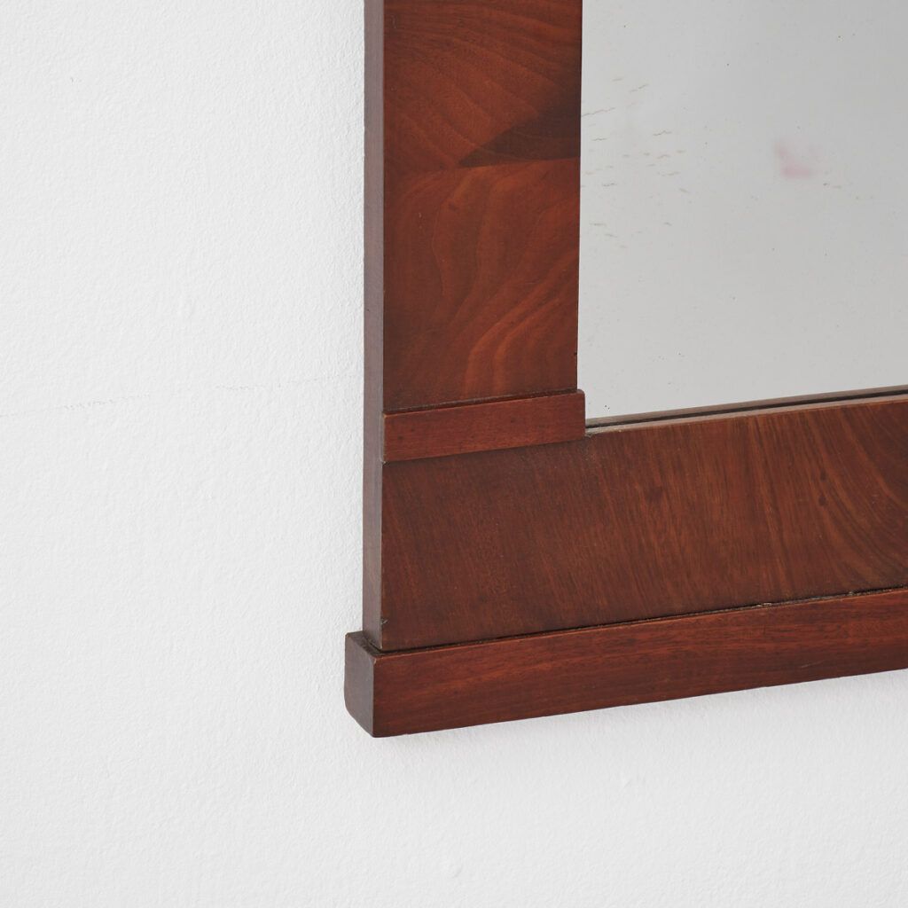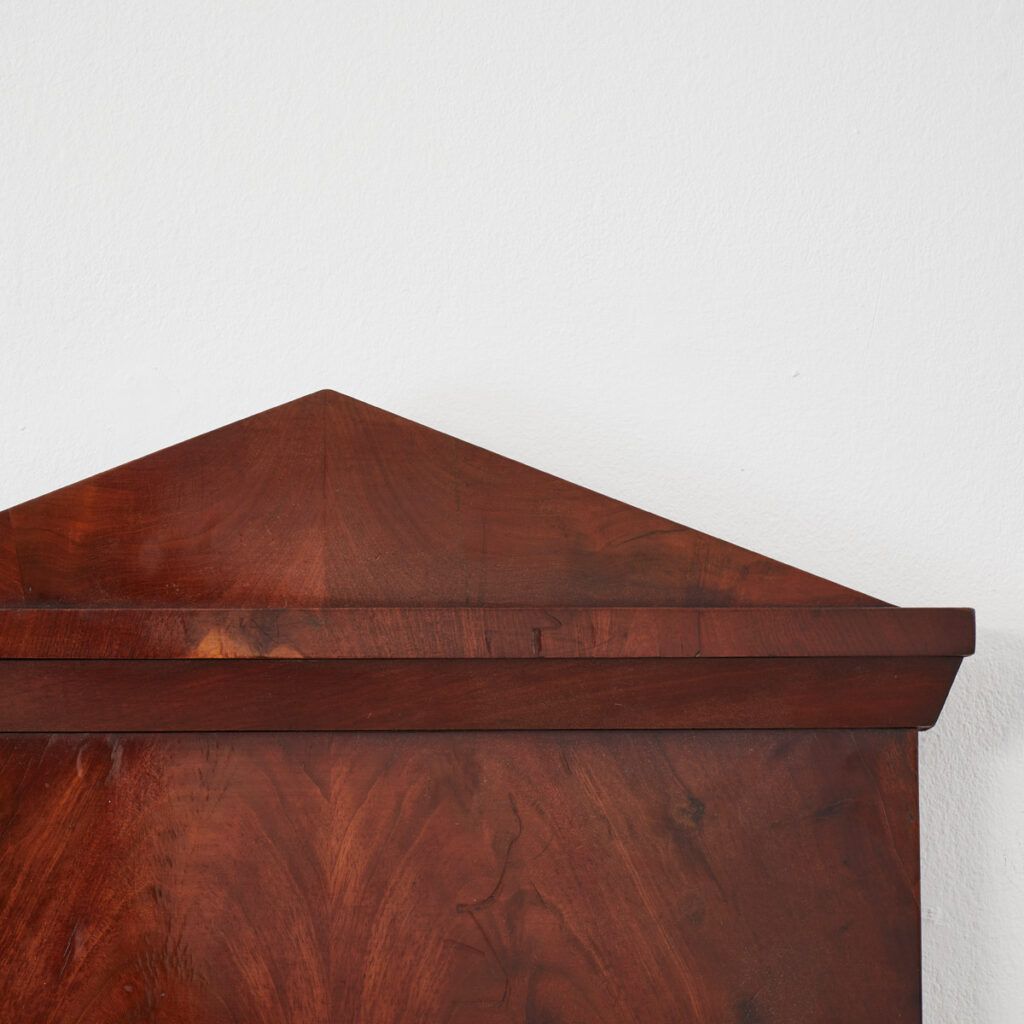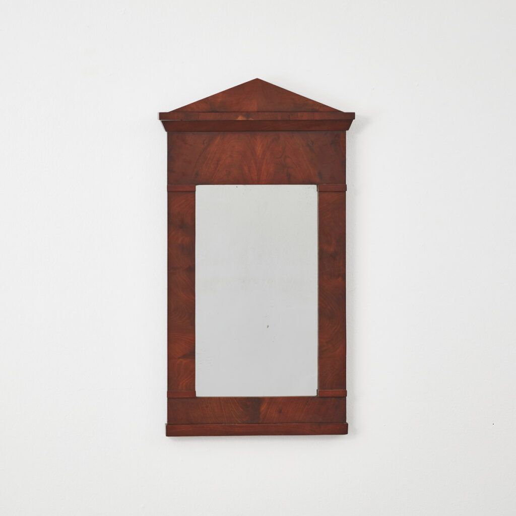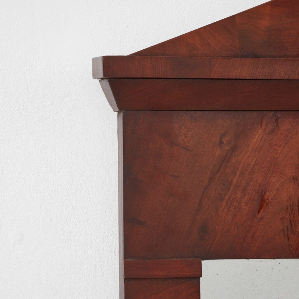 Crafted from rich mahogany, this antique Classical empire style mirror boasts elegance with its bold lines’ characteristic of the neoclassical aesthetic. Its narrow profile makes it ideal for smaller spaces such as a hallway, bathroom or cloakroom.