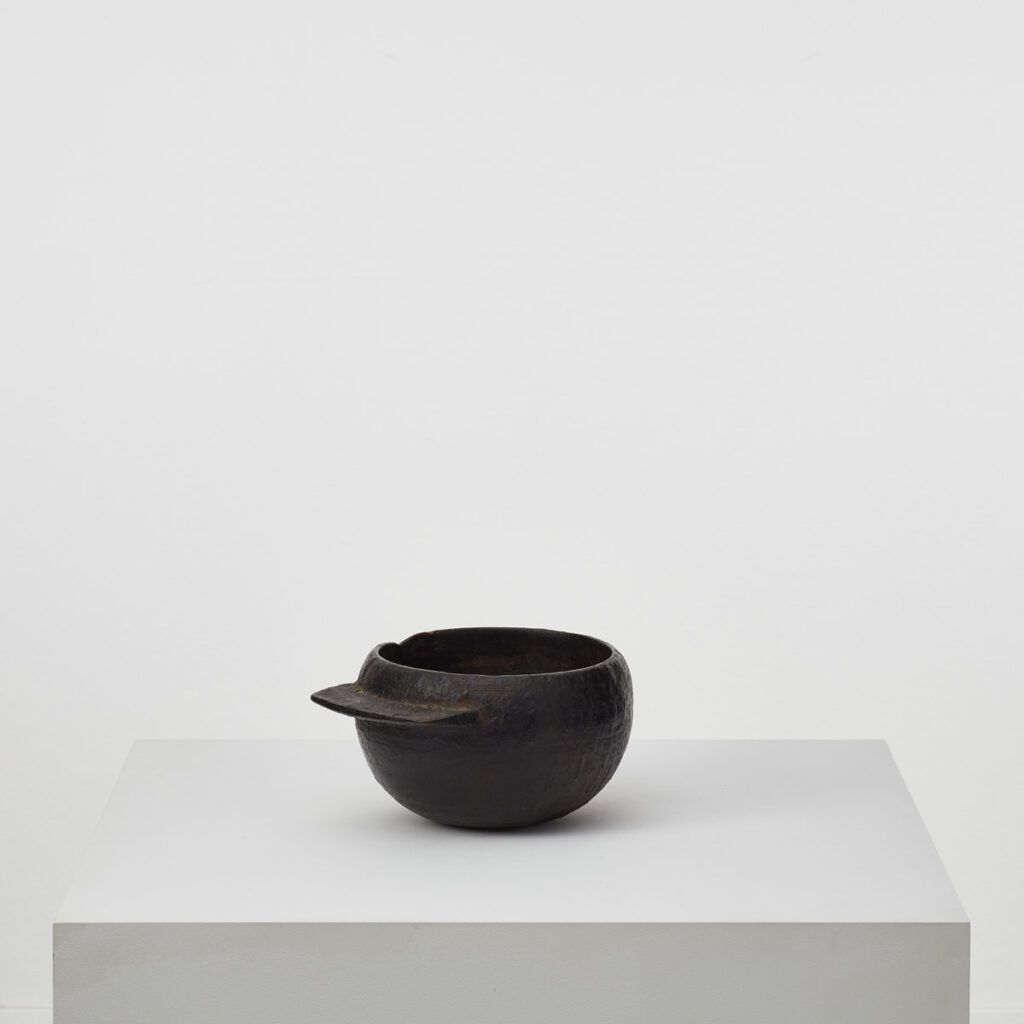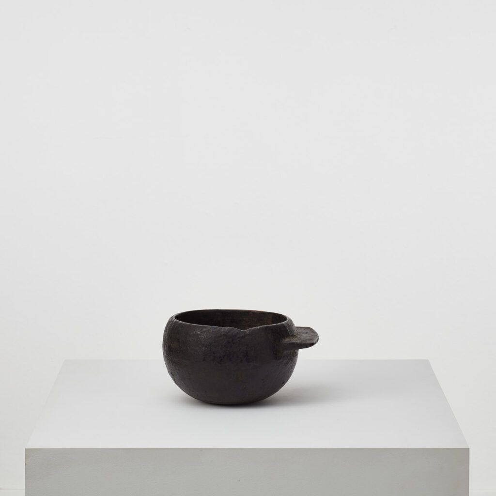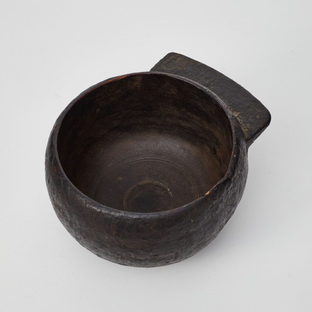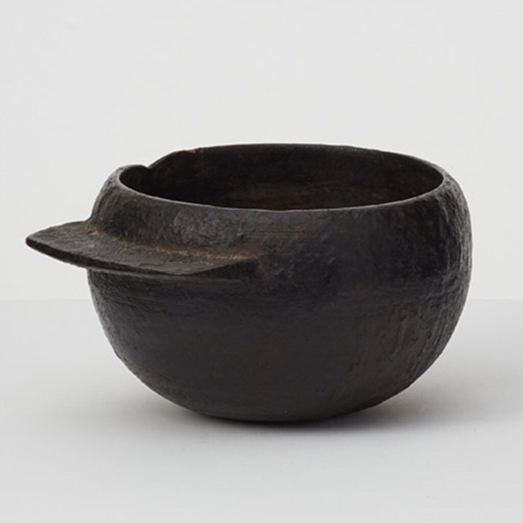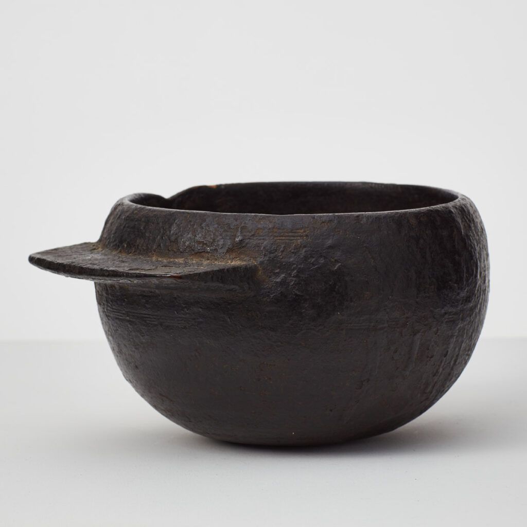 Obscure, this antique wooden pot covered in tar is full of wabi-sabi charm. With a distinctive flat handle adorning one side, the pot has an asymmetrical form of an unconventional elegance. The tar gives the pot a rough finish with areas of age and wear revealing the ancient wood underneath. It was possibly used as a pot for tar applying tar in shipping or roofing.