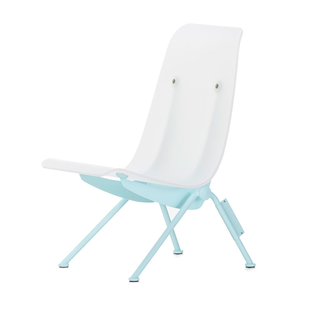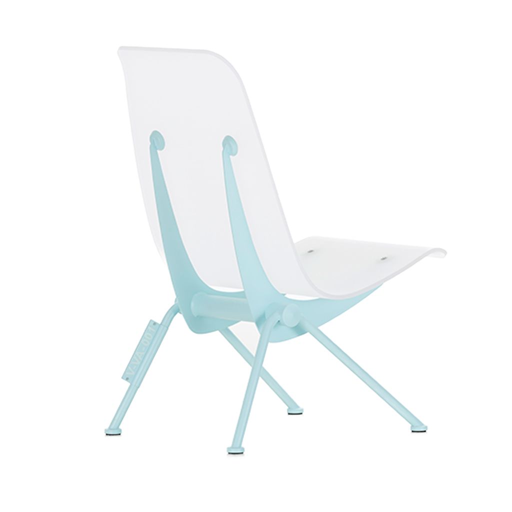 The Antony chair by Jean Prouvé was designed in the early 1950s for the Cité Universitaire in Antony near Paris. With its dynamically curved wooden shell and characteristic metal base, this small armchair was one of the French designer's last furniture creations. Virgil Abloh pays tribute to the iconic design with an updated version. He has transformed the armchair by giving it a plexiglass shell that reveals the supporting metal structure, which is further accentuated by a powder blue lacquer finish. Each Armchair is individually numbered 1 of 150.