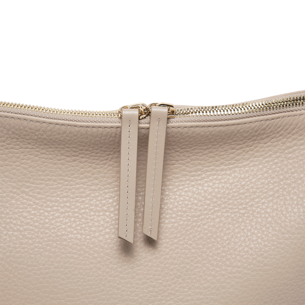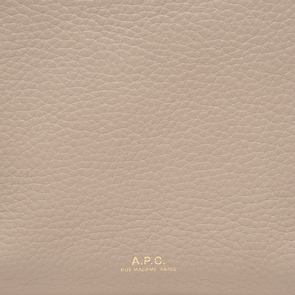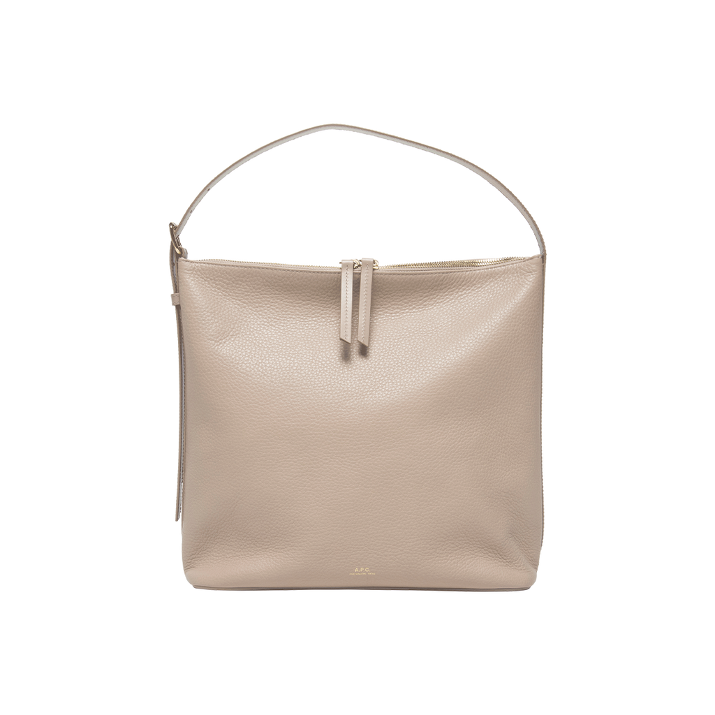 A.P.C. Beige Vera Bag features square shape in grained leather, large double zip opening with leather zip pulls, adjustable shoulder strap, and 1 interior pocket.