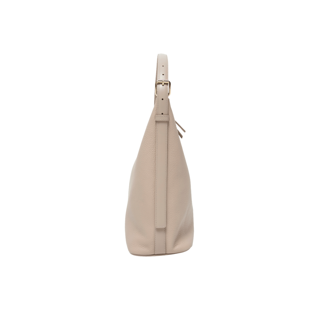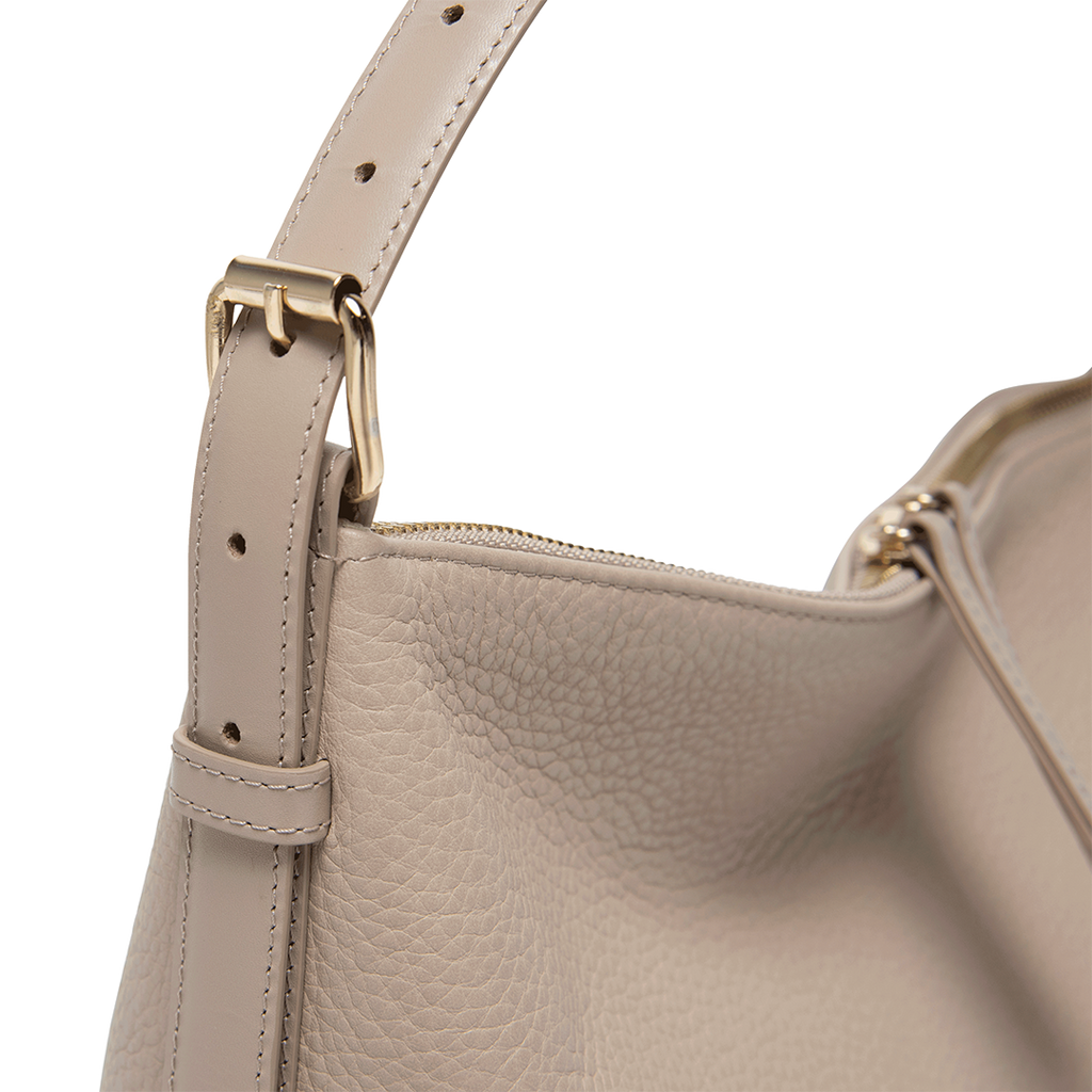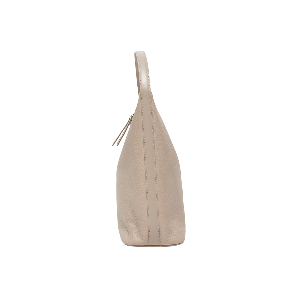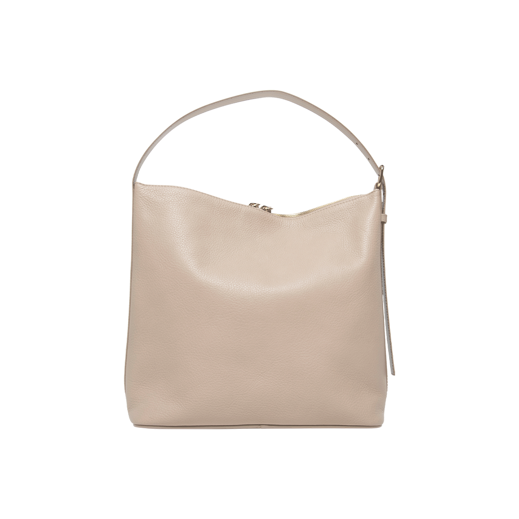 A.P.C. Beige Vera Bag features square shape in grained leather, large double zip opening with leather zip pulls, adjustable shoulder strap, and 1 interior pocket.