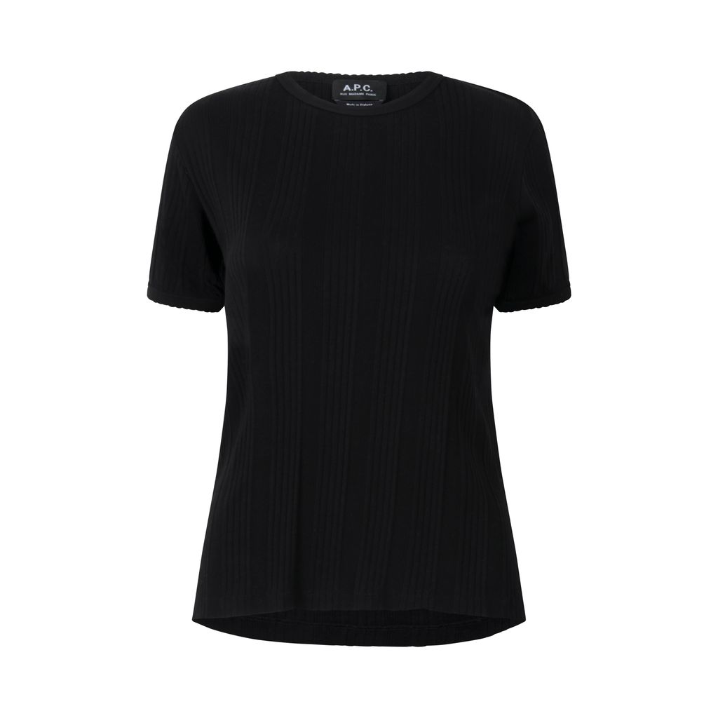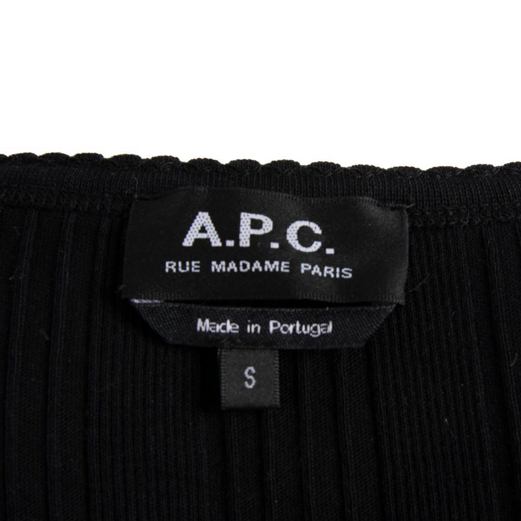 This essential black top from A.P.C. features a round-cut neckline, short sleeves with embellished trim, ribbed bodice detailing, and has a relaxed fit. Gently worn, in excellent condition.