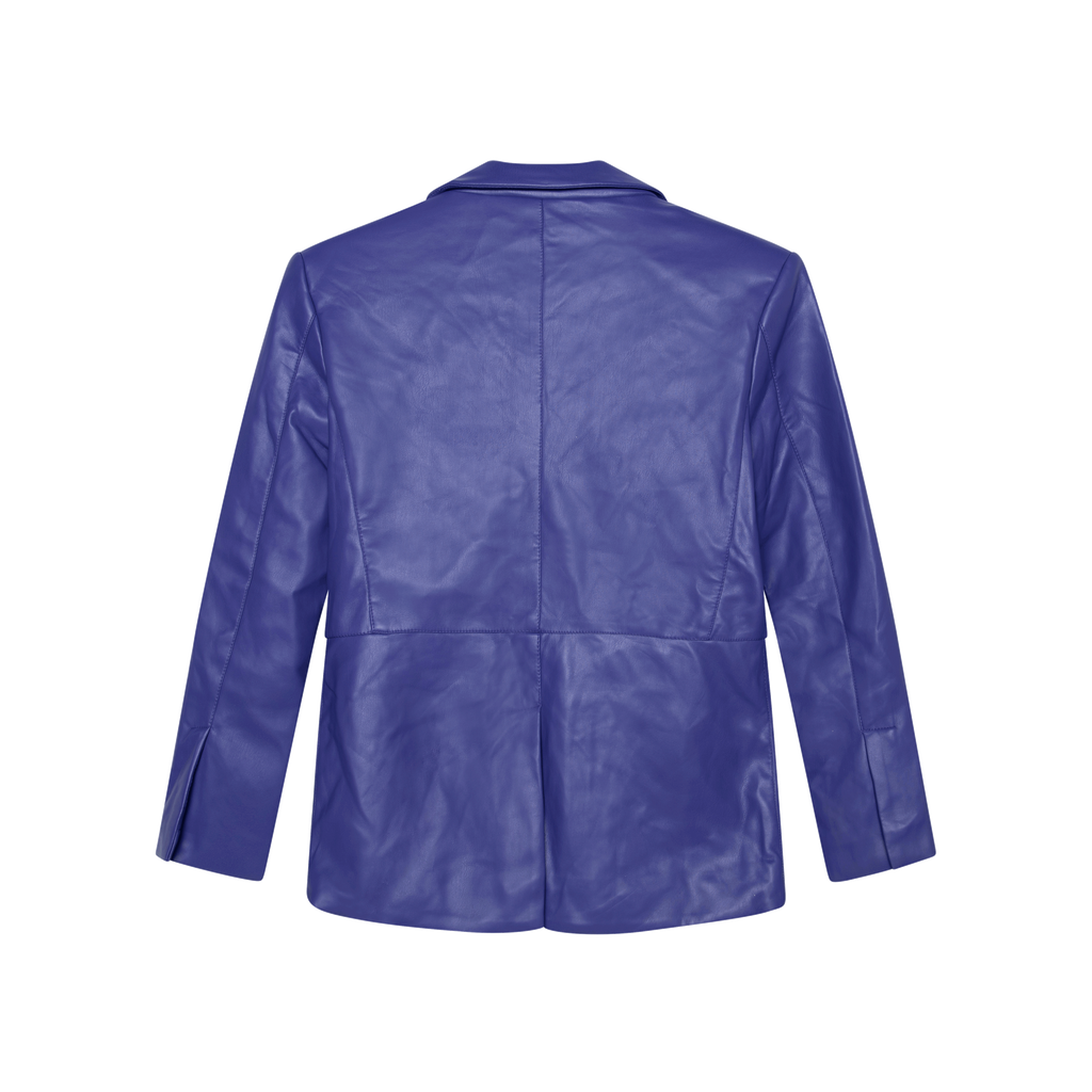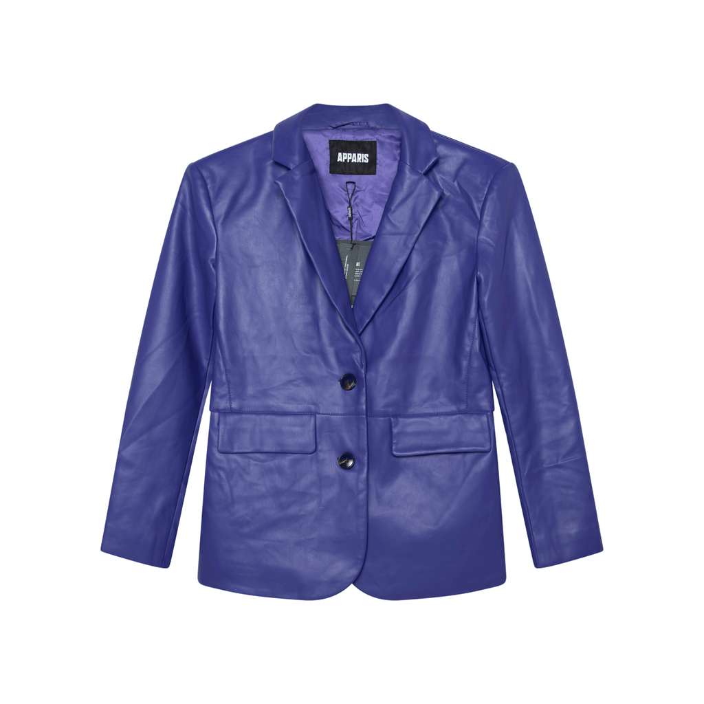 Apparis Killian Vegan Leather Blazer in Electric Purple features slender notched lapel, long sleeves, dual flap pockets, and front button closure.