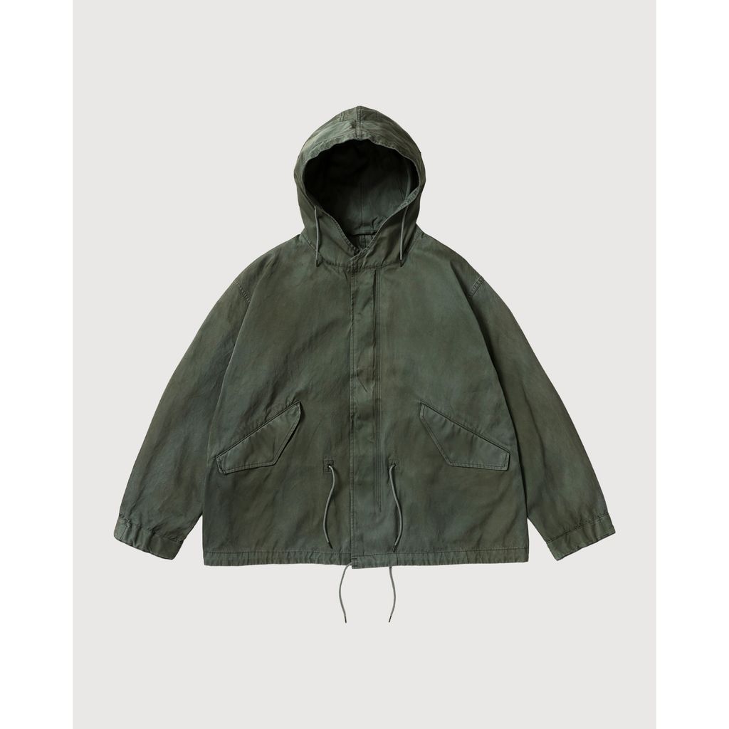 The A.PRESSE Vintage Silk Hoodie Jacket in Sage reimagines the classic U.S. Army M-65 with a cropped length and wide A-line silhouette. Crafted in Japan from ultra high-density silk-cotton double cloth, it features a detachable liner and a hand-aged finish that gives each piece a distinct character.