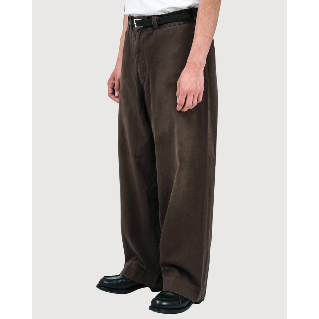 The A.Presse Vintage Twill Work Pants in brown draw inspiration from classic 1950s American workwear. Crafted in Japan from super long cotton slub twill, they feature a relaxed silhouette with a gradual taper toward the hem. Finished with top-down belt loops, piped pocket linings, an Asahi zipper and vintage processing that gives each pair a distinct character.
