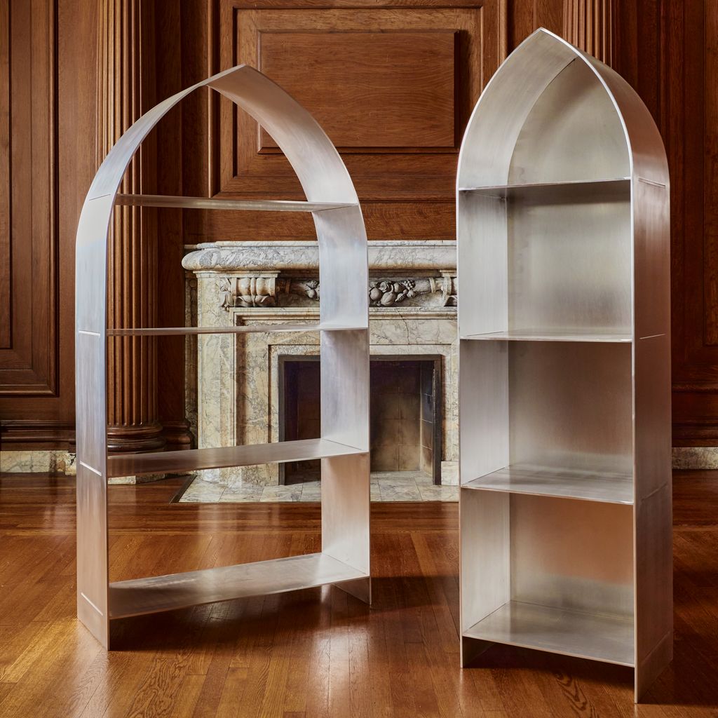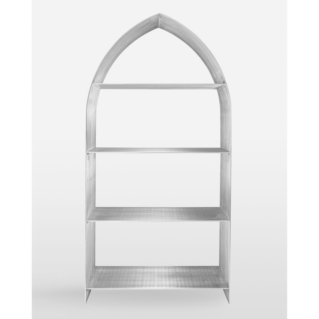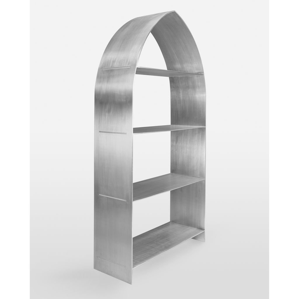 Calling on the pointed arches of high gothic architecture, this centuries old motif is crafted on a made to order basis from 1/4 in aluminum sheets. The industrious nature of the construction is then hand brushed to achieve the finish. Surface variances illustrate this handwrought technique. Available in two sizes, the arch bookcases bring an architectural element, like that of a cloister, to a space, as well as storage and display.