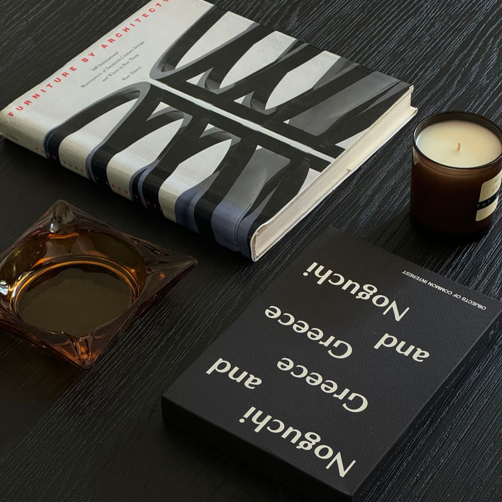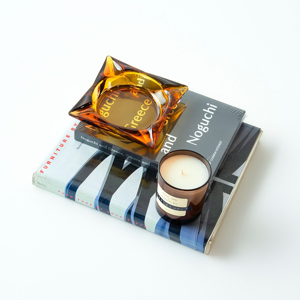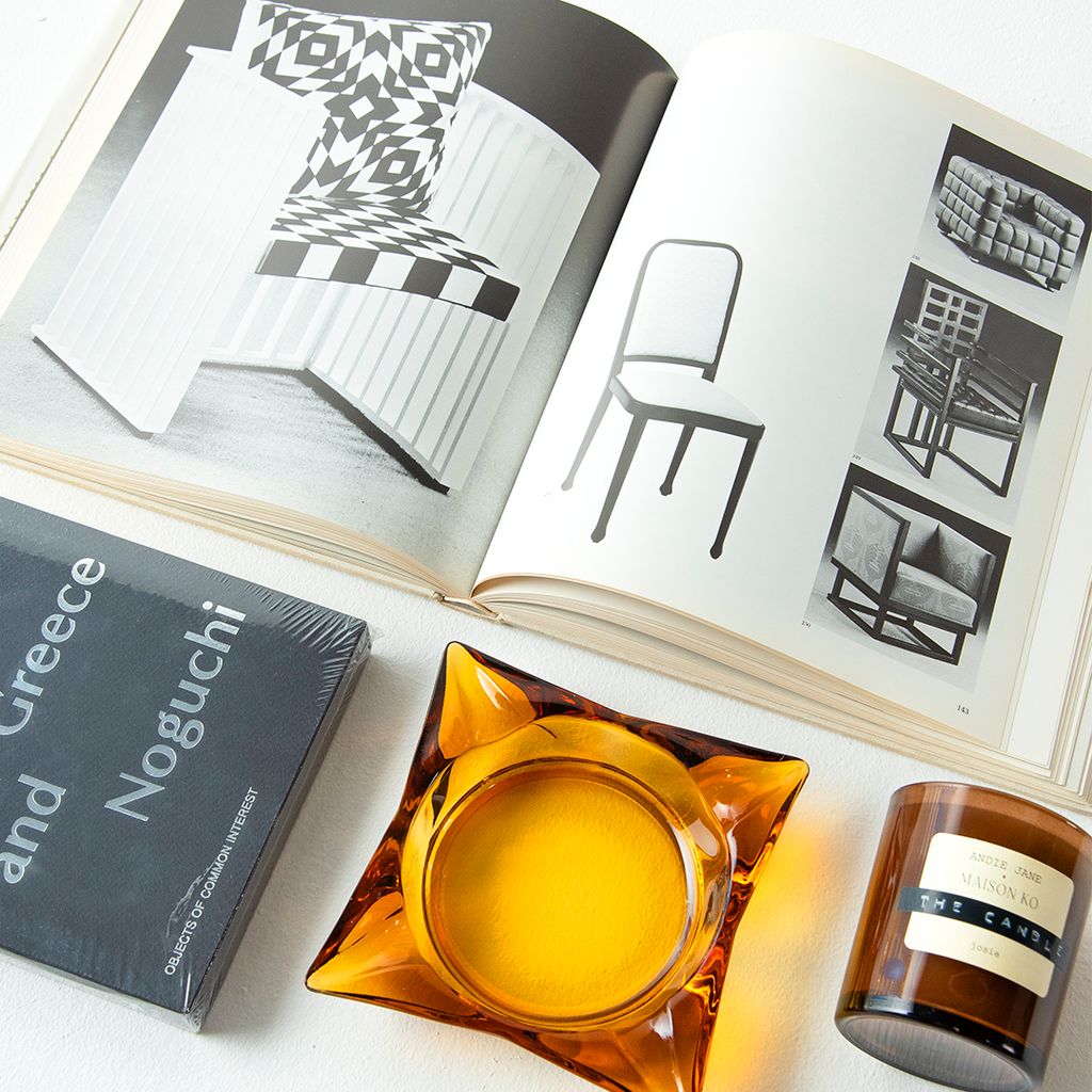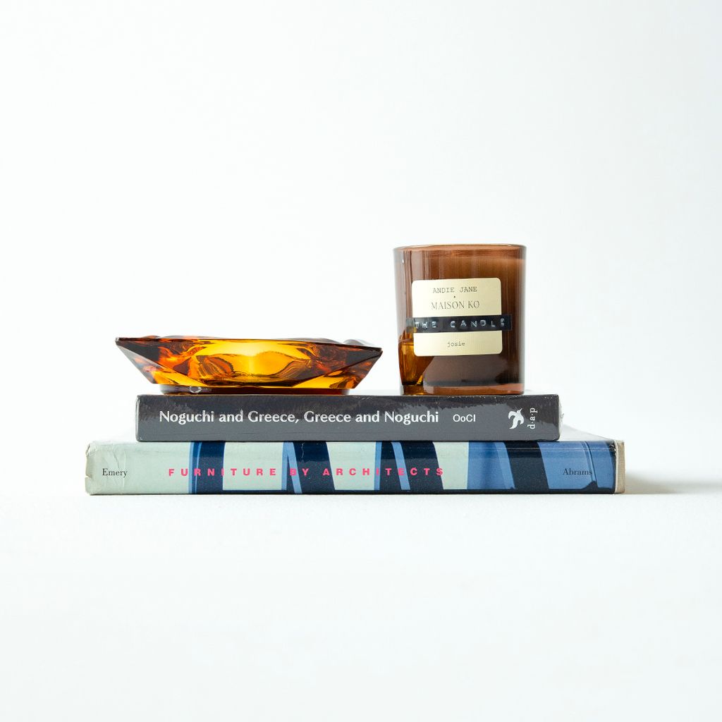 Archives and Artifacts features Vintage 'Furniture By Architects: International Masterpieces of the Twentieth-Century Design and Where to Buy Them' Book, New 'Noguchi and Greece, Greece and Noguchi: Objects of Common Interest' Book, Vintage Amber Glass Catchall Dish, Andie Jane x Maison Ko 'josie' Candle with notes of iris, bergamot, and vanilla.