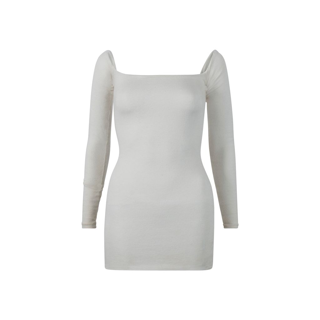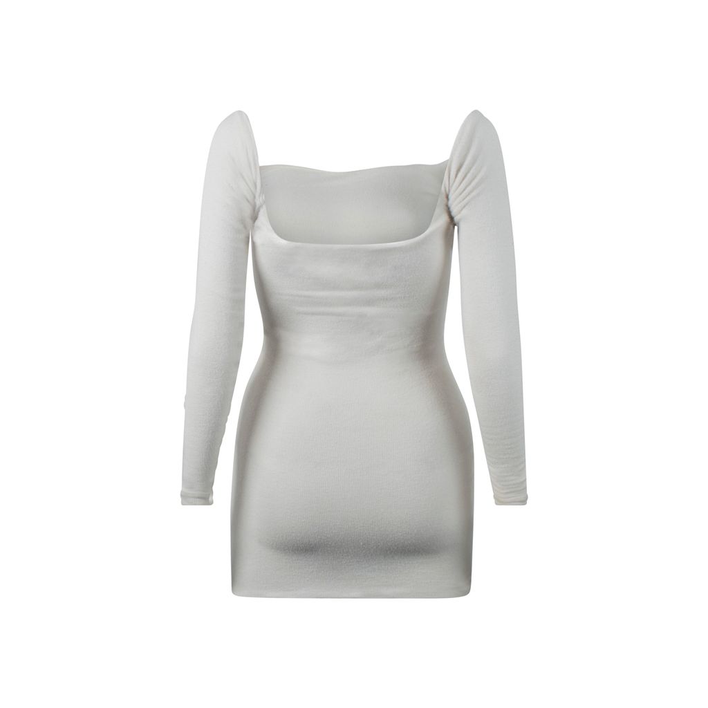 This ARE YOU AM I Anke dress in white is made from stretch ribbed knit fabric and has a square cut neckline. This dress has long-cut sleeves and has a bodycon silhouette. Gently worn.