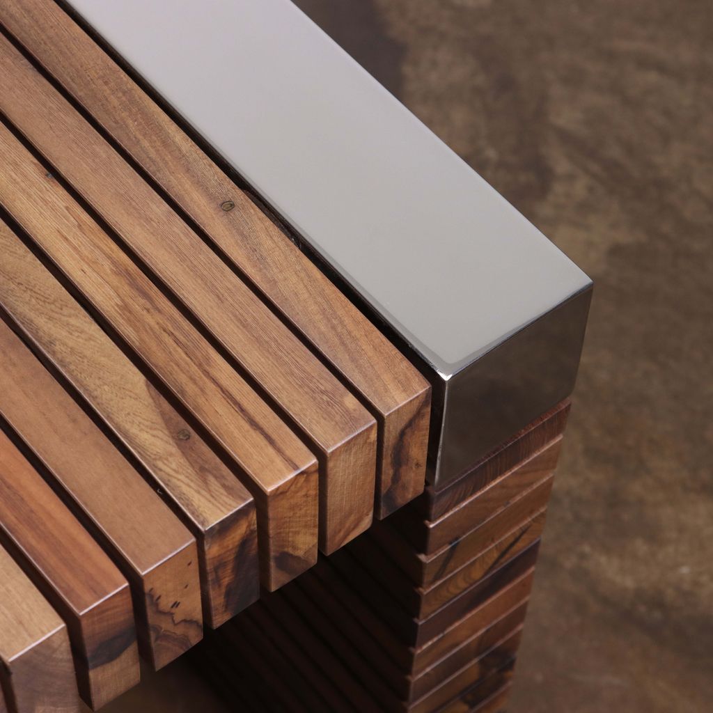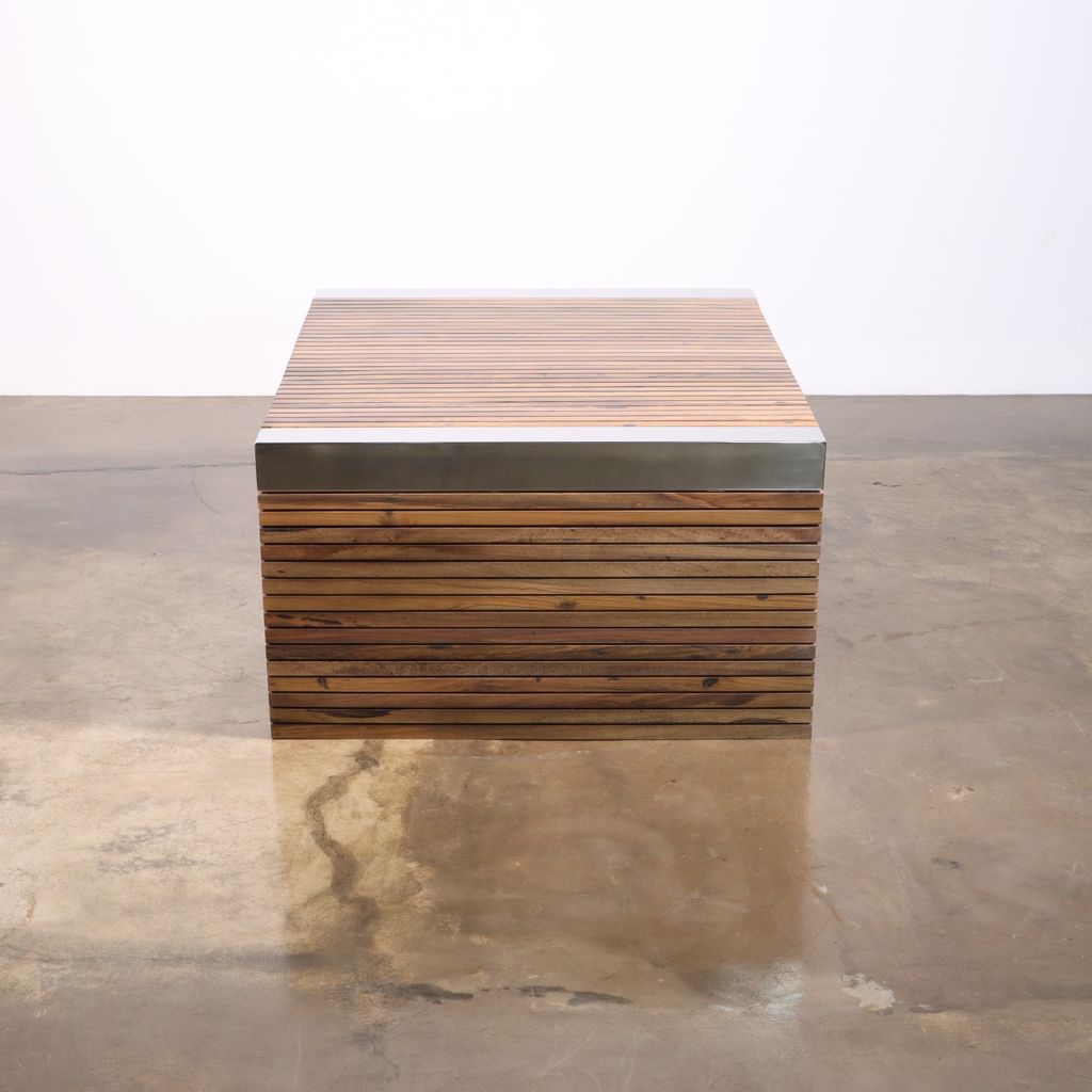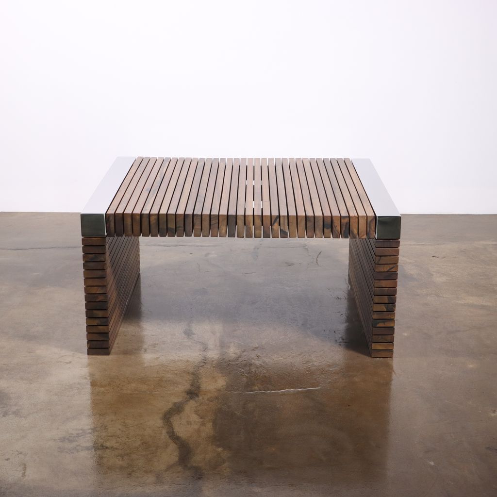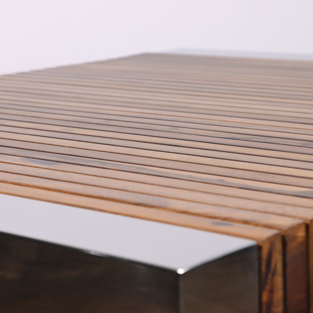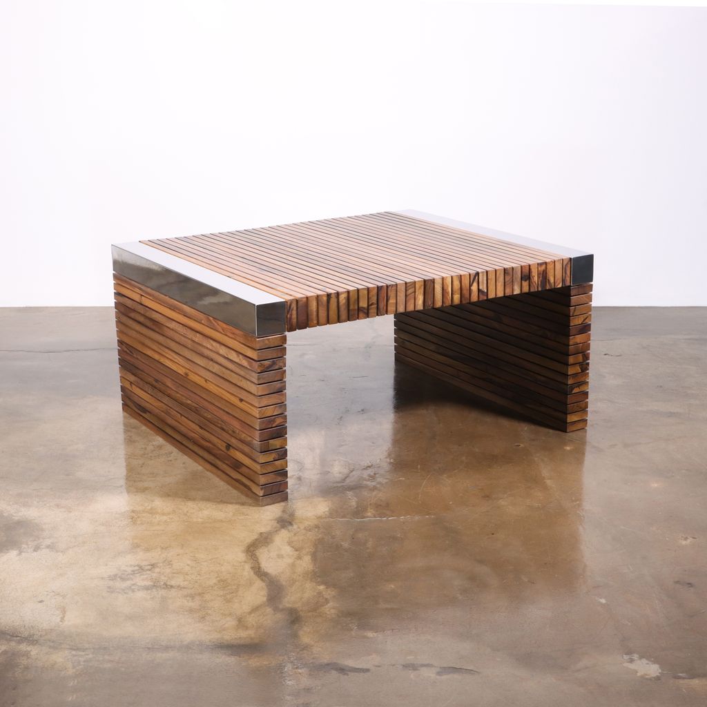 The Argilla Table is a study of contrasts, comprised of repeated wood slats suspended in air by a metal skeleton and disks that prevent the slats from touching one another. Its corners are adorned with nickel-plated bars of metal. Customizable in any size, shape or finish. The name comes from the Italian word for clay, which is what designer William Stuart used to make the original model.