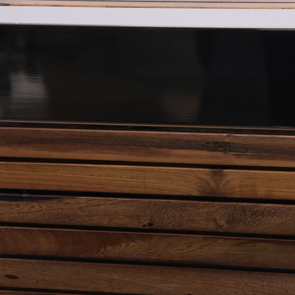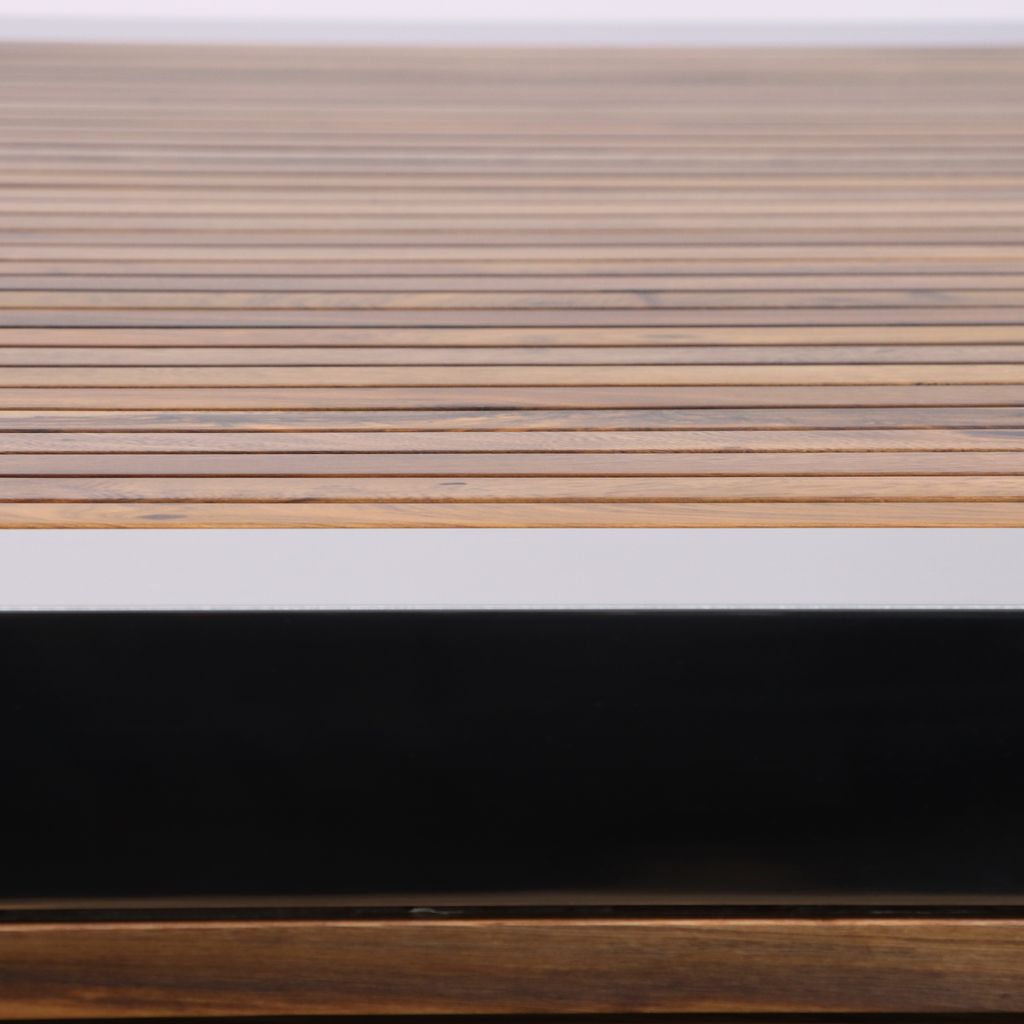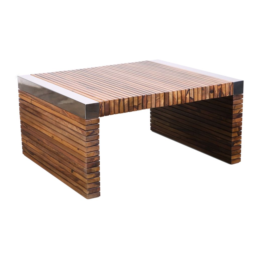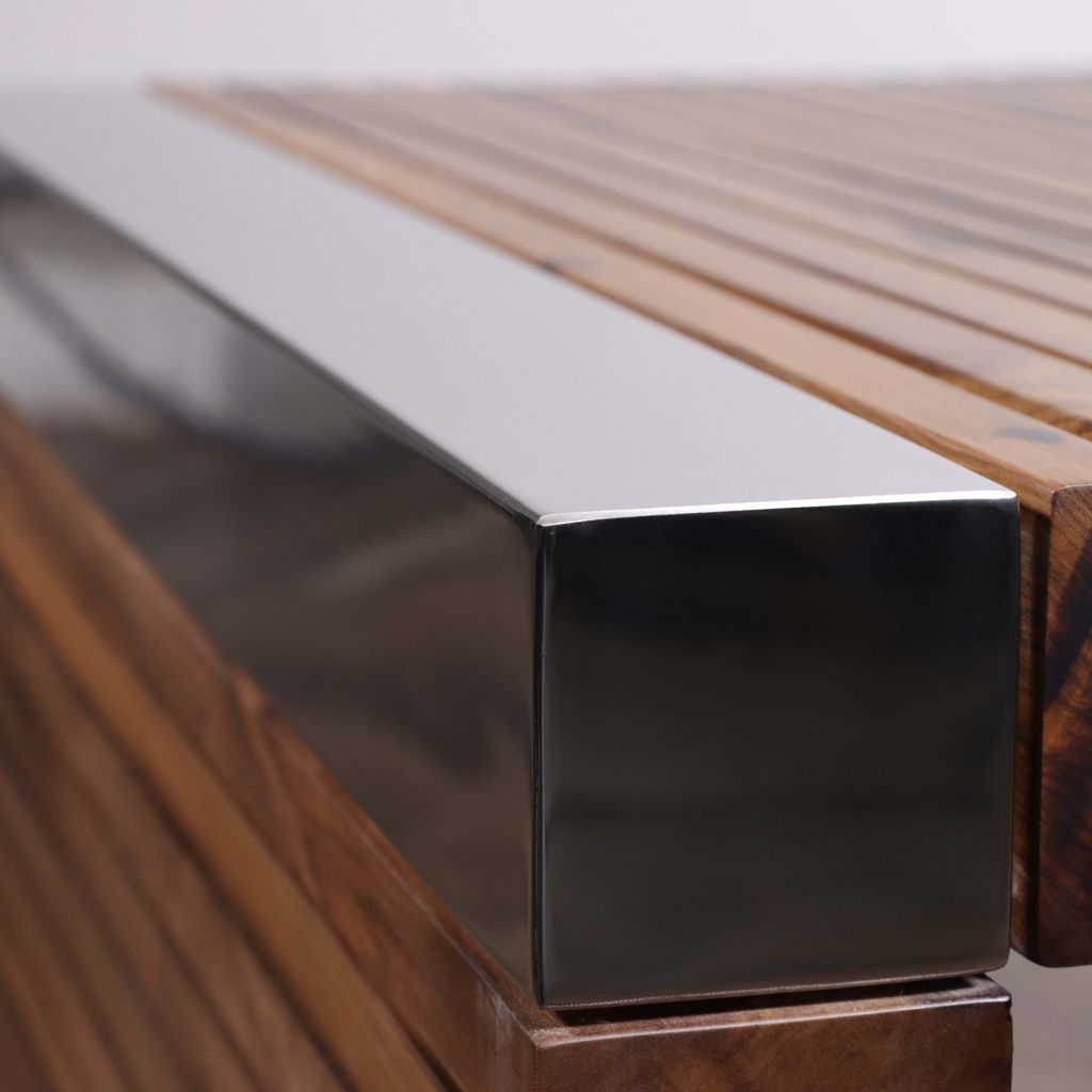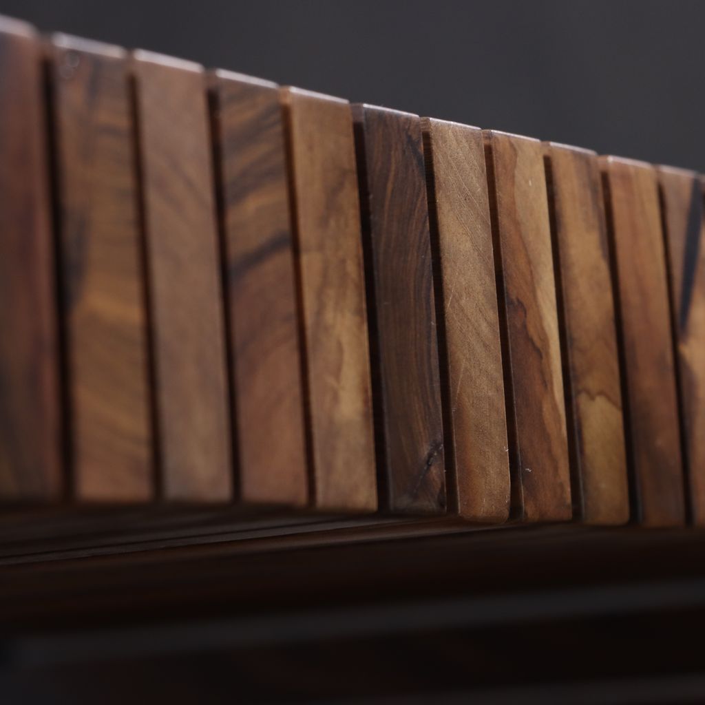 The Argilla Table is a study of contrasts, comprised of repeated wood slats suspended in air by a metal skeleton and disks that prevent the slats from touching one another. Its corners are adorned with nickel-plated bars of metal. Customizable in any size, shape or finish. The name comes from the Italian word for clay, which is what designer William Stuart used to make the original model.