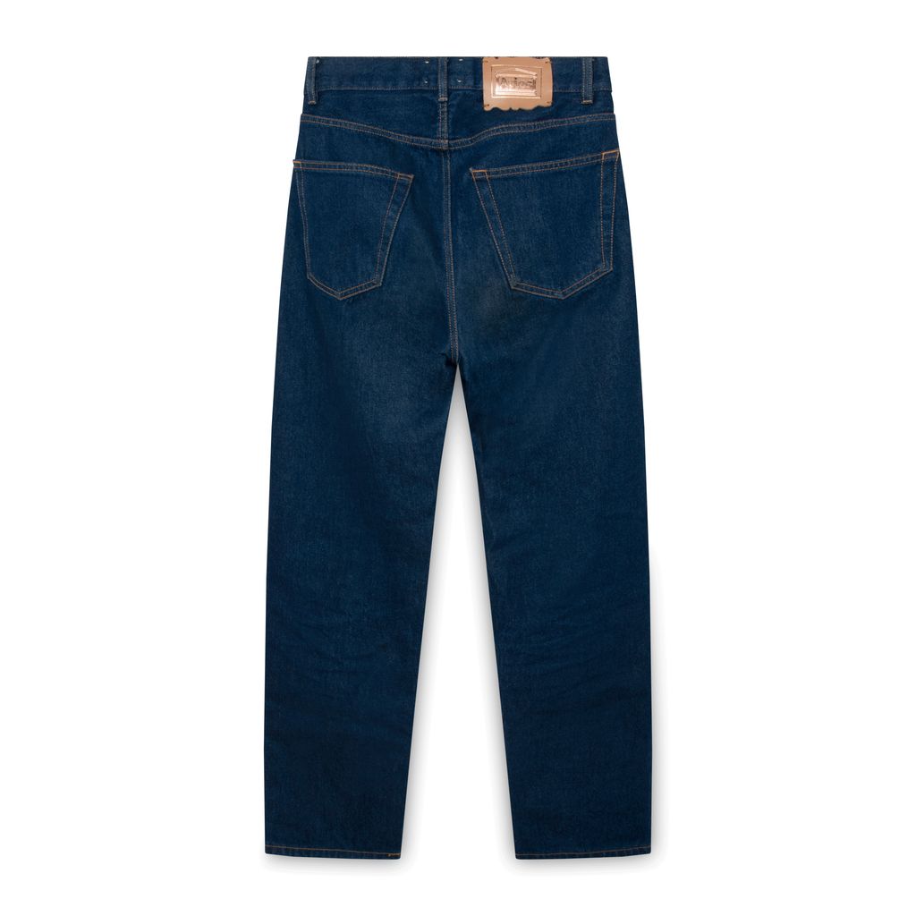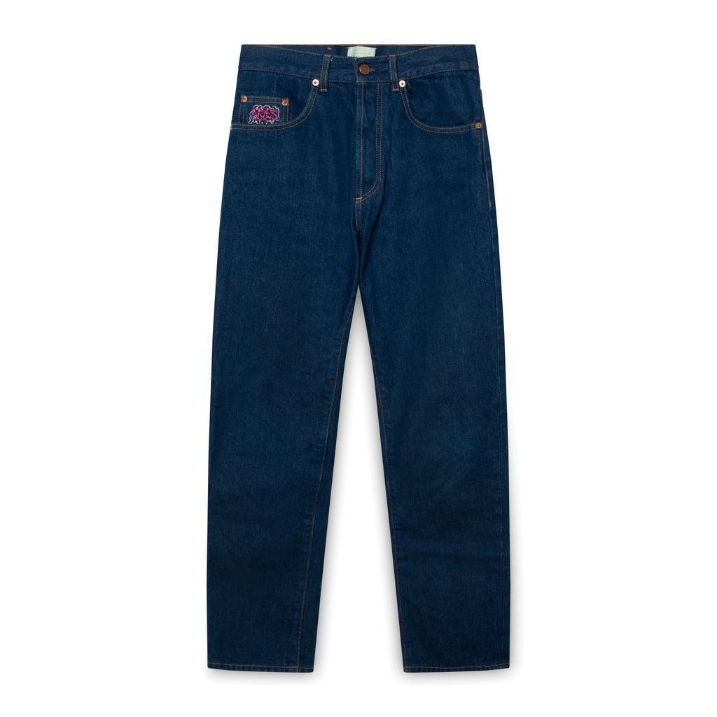 Aries blue jeans feature bronze hardware and embroidered Aries logo on the right pocket.
