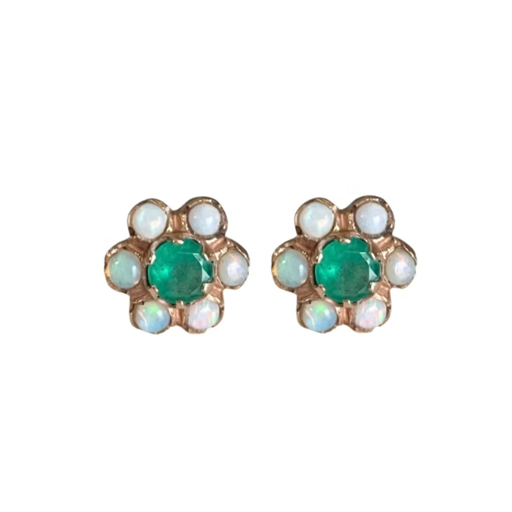 Delicately crafted in a floral silhouette, these Arik Kastan stud earrings bloom with vivid emerald centers framed by luminous opal petals. Set in warm 14k rose gold, the flower design draws inspiration from Victorian-era jewelry, blending romantic charm with timeless elegance. A beautifully balanced composition where rich green meets ethereal glow.