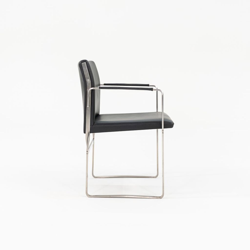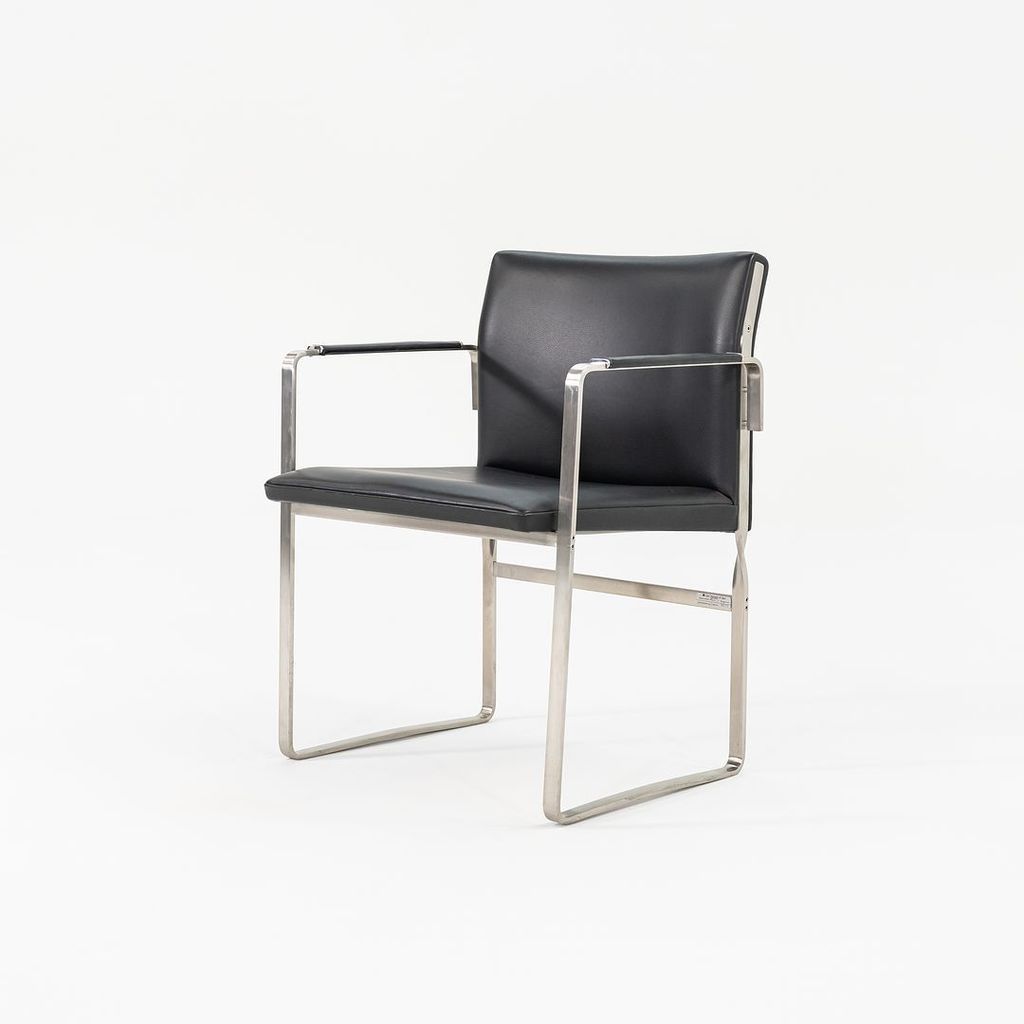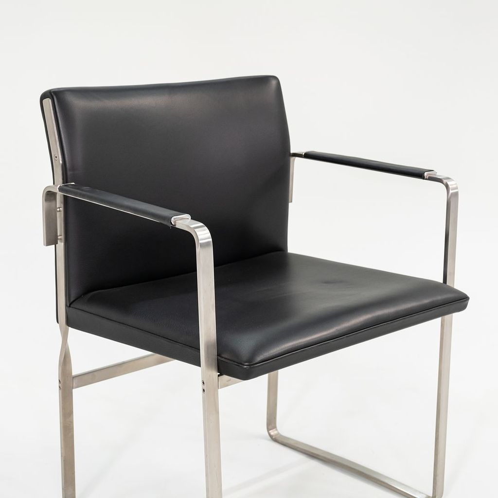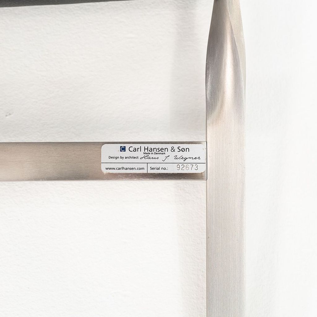Listed for sale are three CH111 Dining armchairs (sold individually) made with a stainless steel frame and black leather seat. The chair was designed by Hans Wegner and produced by Carl Hansen & Son in Denmark. Each dates to circa 2022 and is guaranteed as authentic. Condition is excellent with some light wear. See photos.