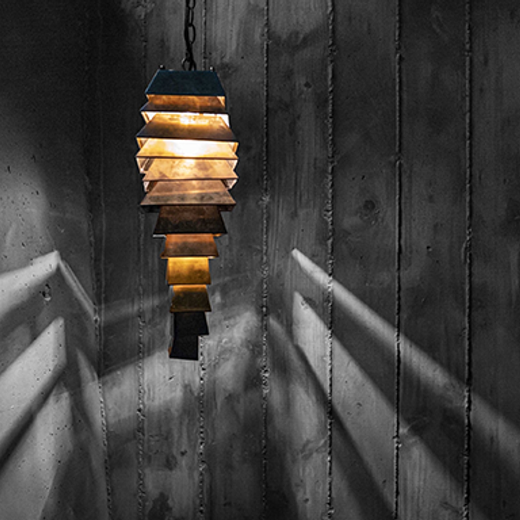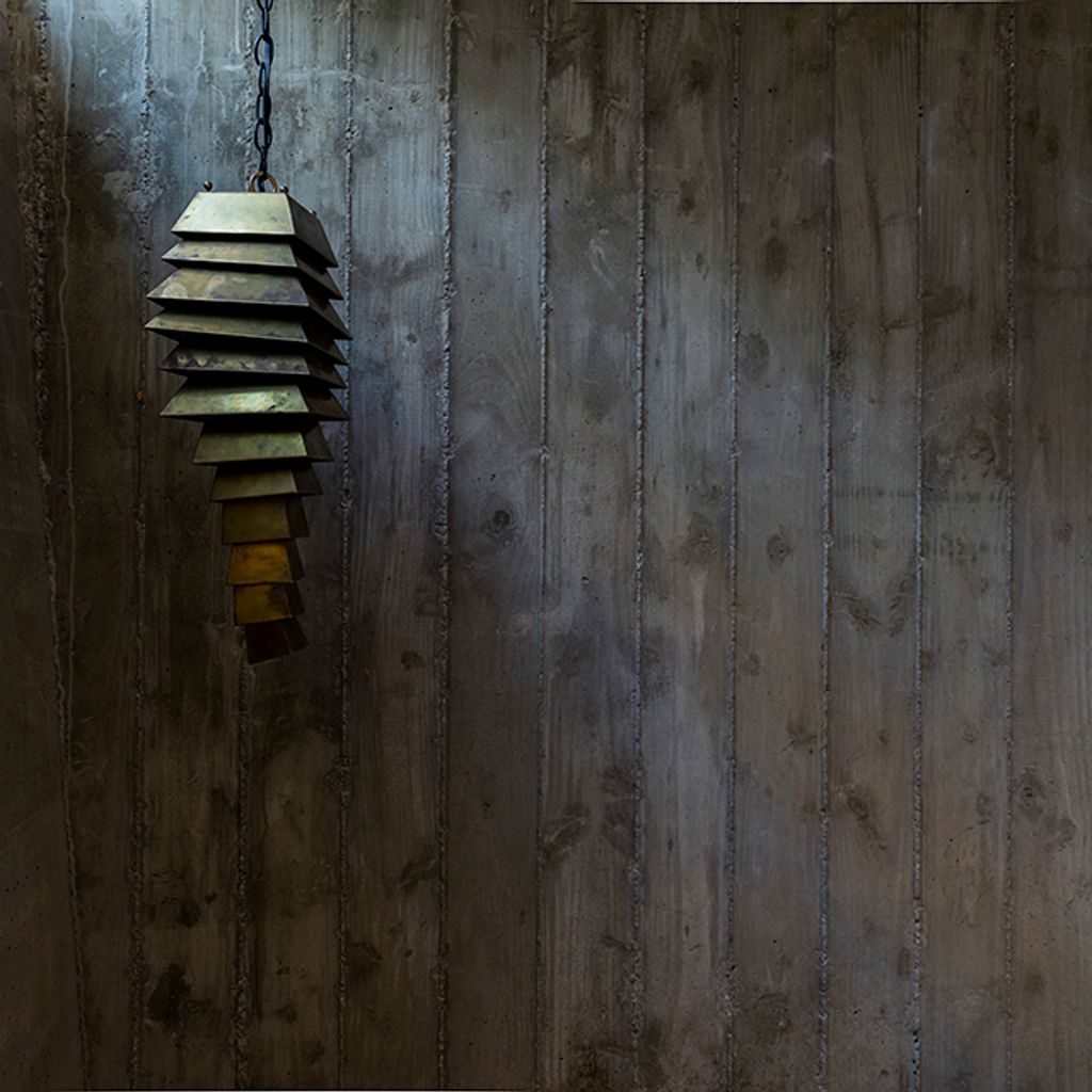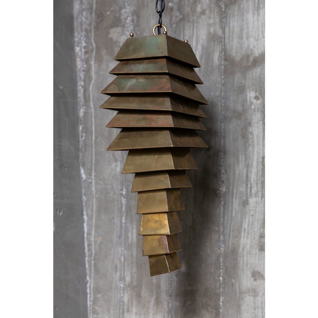 A solid brass chandelier designed to mimic the mighty armadillo. The fixture is composed of brass "scales," formed in concentric harmony. Pendant holds one 60W bulb. Pair with warmer light tones to accentuate the beauty of the brass as it ages over time. The natural descension of the piece plays with light to create a unique radiance against any backdrop.