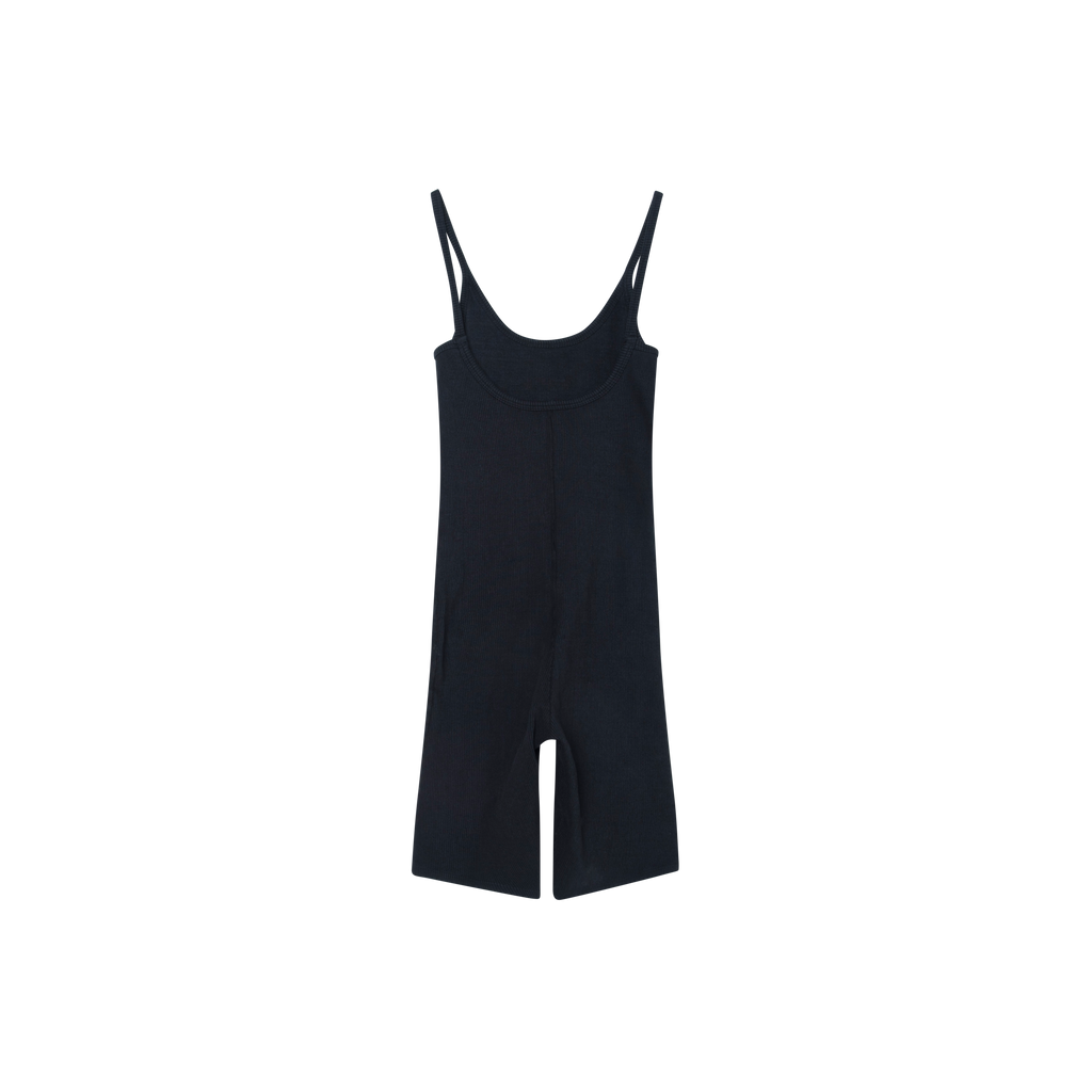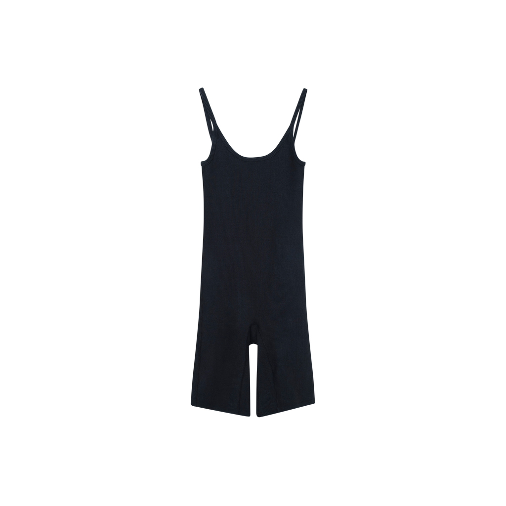 ARQ Nico Bikesuit in Black features heavyweight organic-cotton rib knit, mid thigh shorts, low scoop neckline, and lower scoop back.