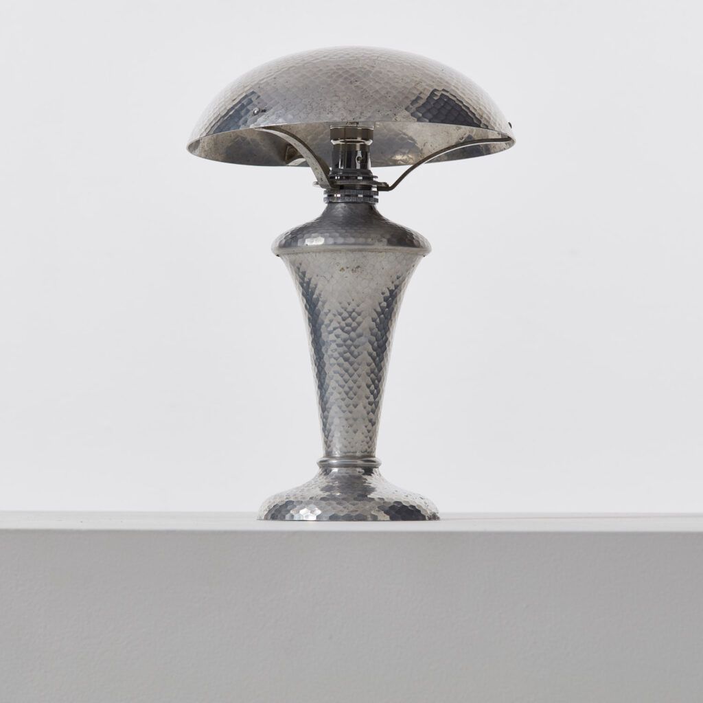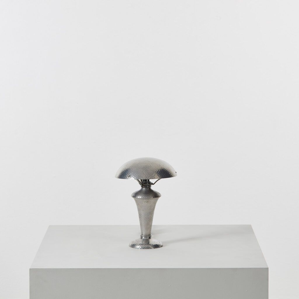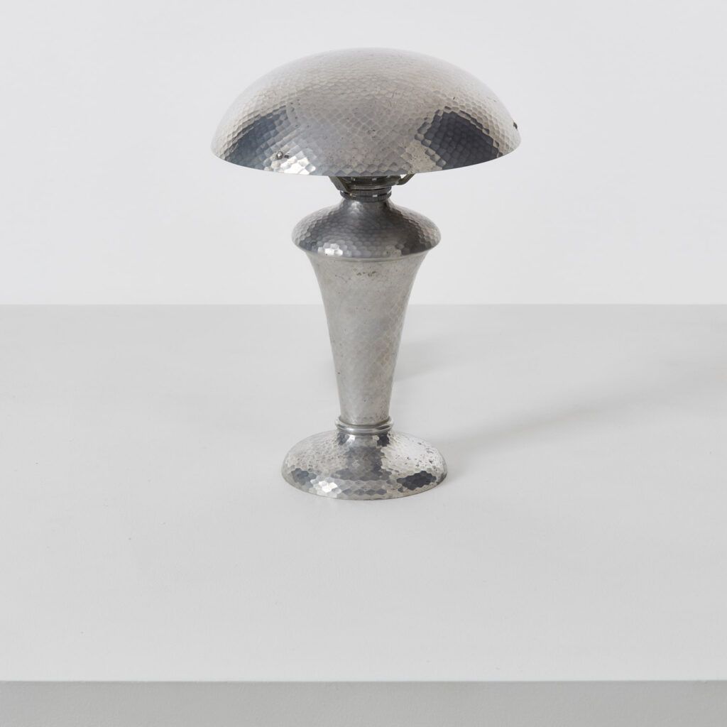 With an urn-like base and saucer shade, this hammered metal table lamp points to the pursuit of balance in Art Deco design. The textured effect was not widely used at the time, and absent from better-known Bauhaus silhouettes.