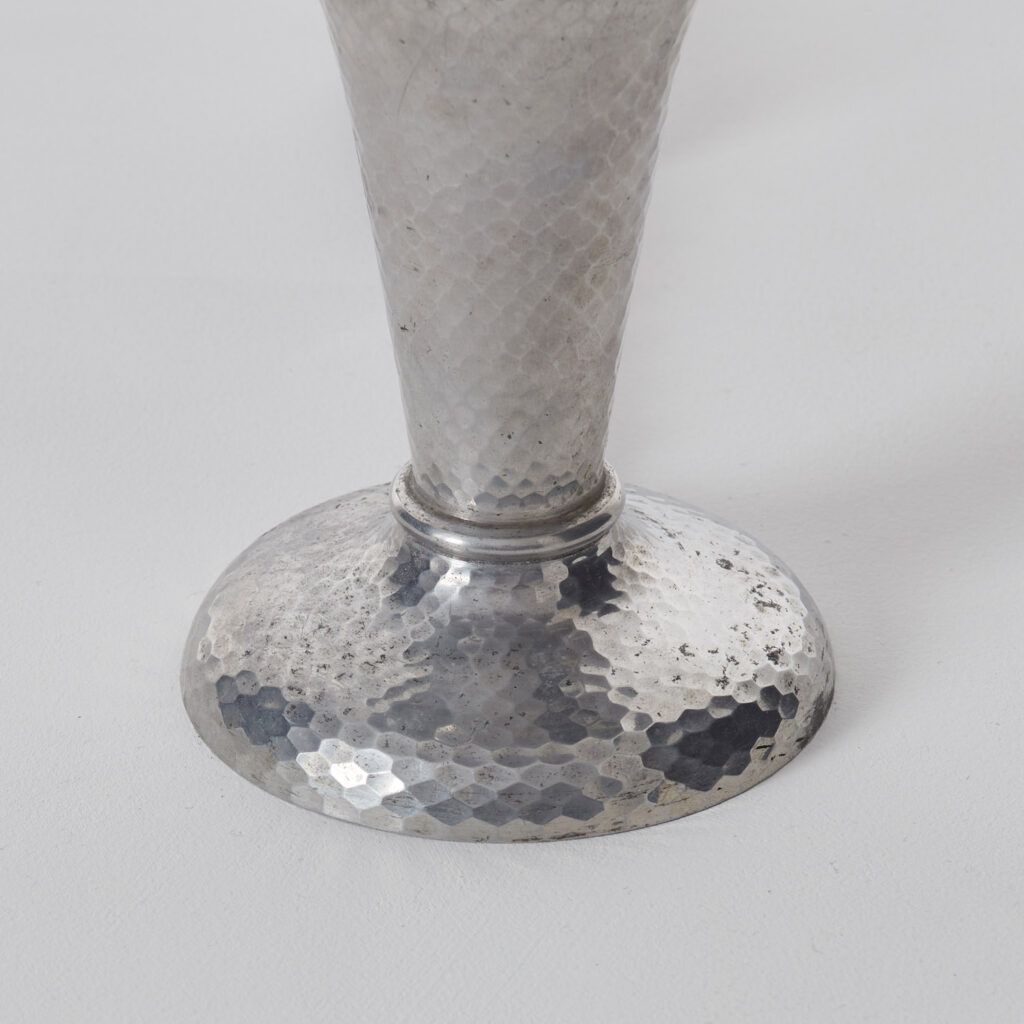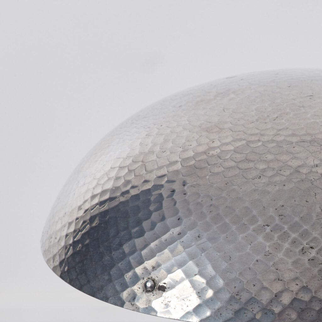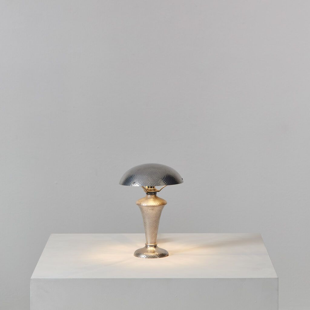 With an urn-like base and saucer shade, this hammered metal table lamp points to the pursuit of balance in Art Deco design. The textured effect was not widely used at the time, and absent from better-known Bauhaus silhouettes.