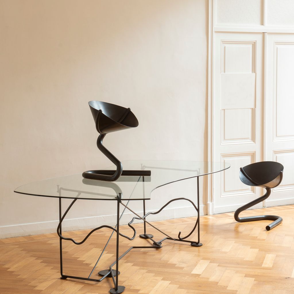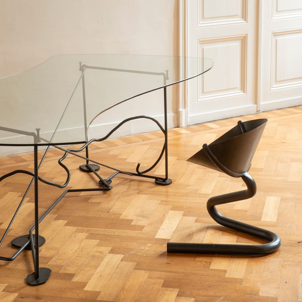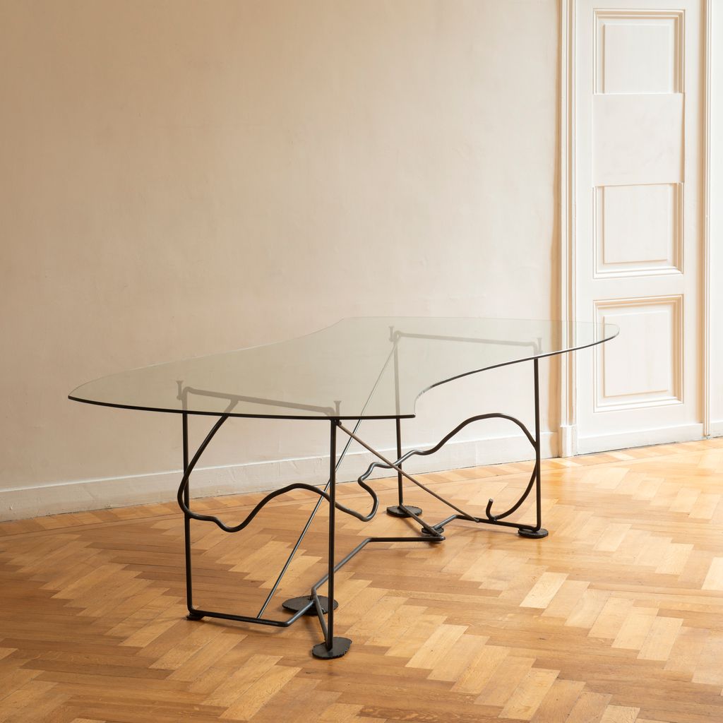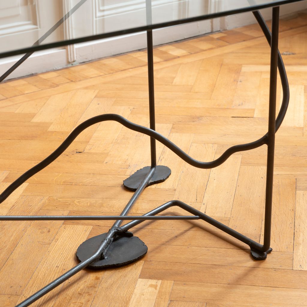French artisan-made sculptural table in tubular & plasmacut sheet steel with freeform glass tabletop.