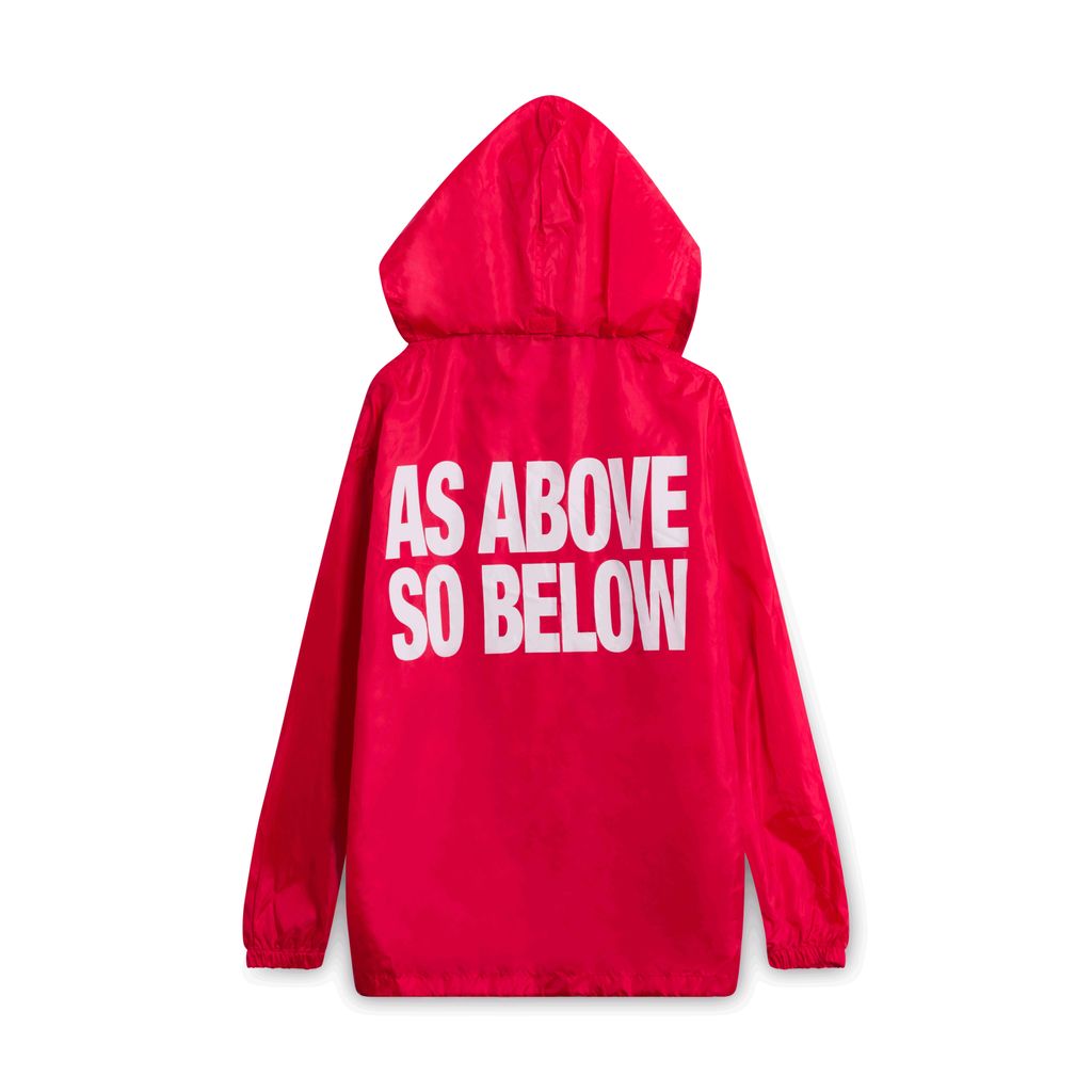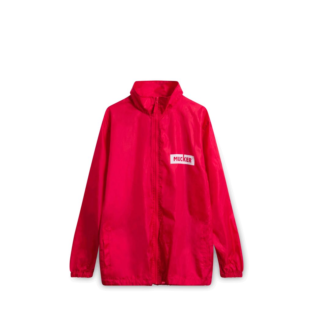 Red rain Jacket with white "Mucker" text on the front and "As Above So Below" text on the back. Zipper closure goes down the chest and there are two pockets located at the waist.