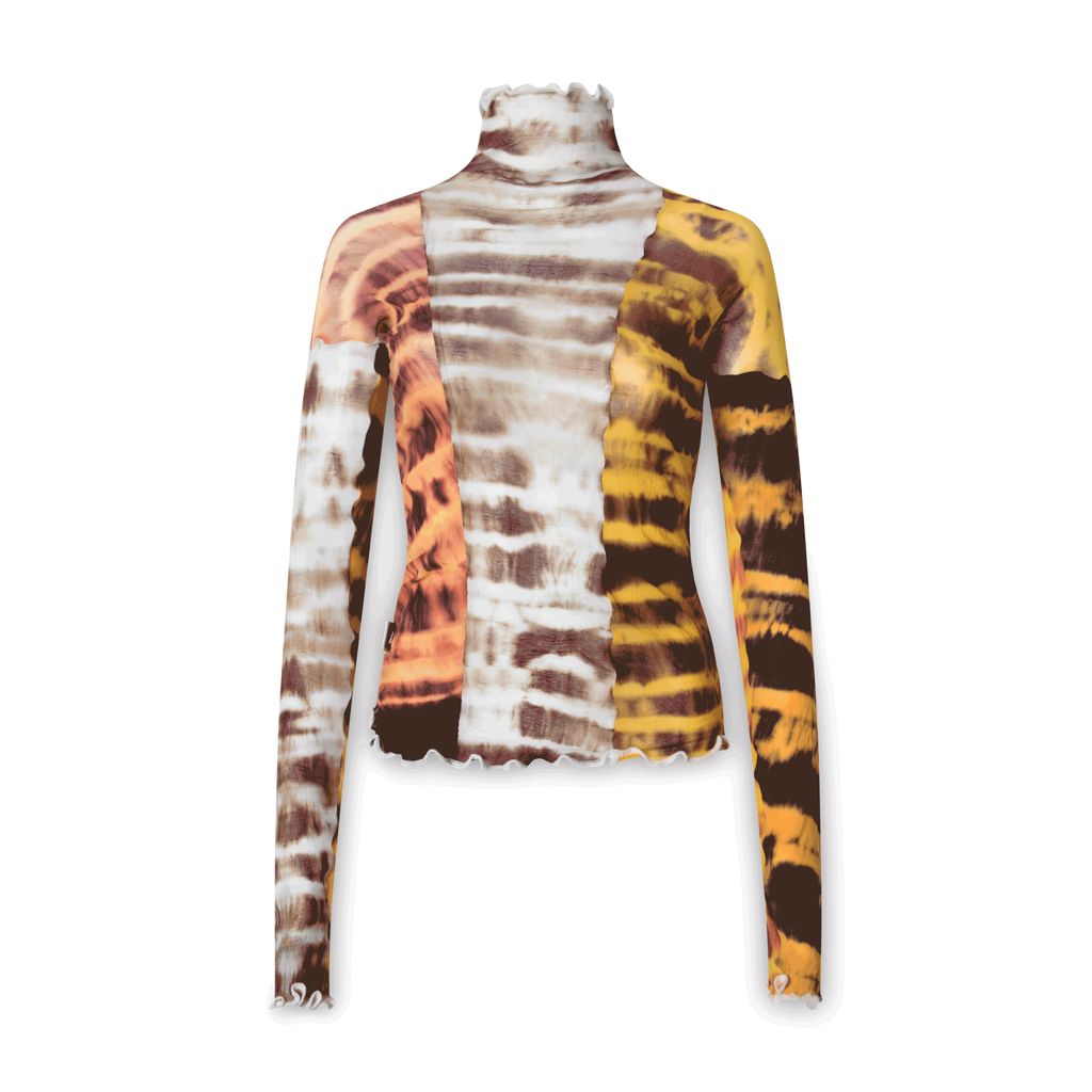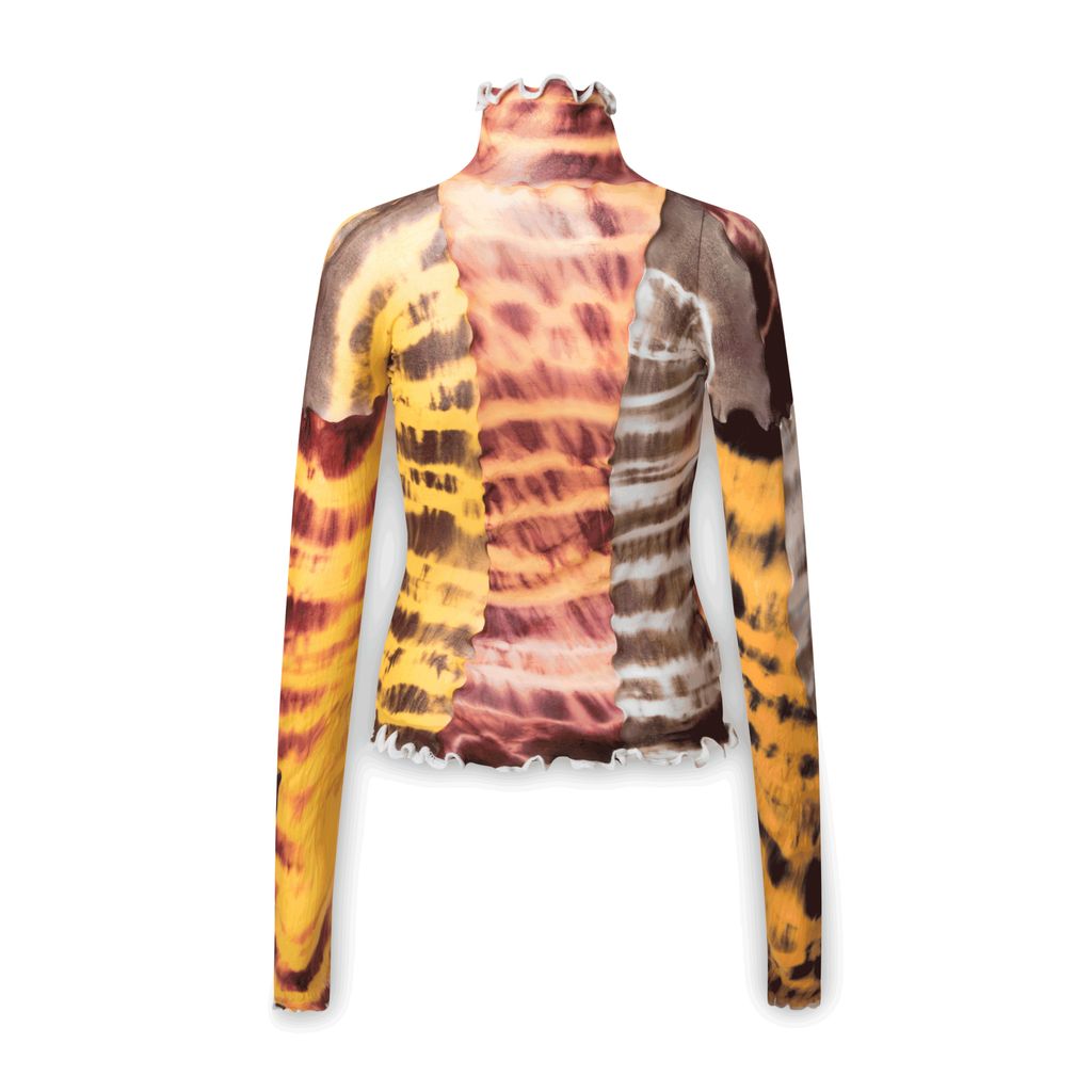 ASAI black & orange hot wok turtleneck in brown features sheer fabric and ruffles at the edges.