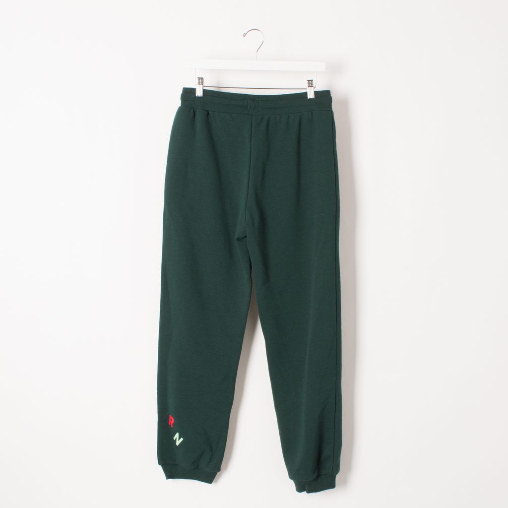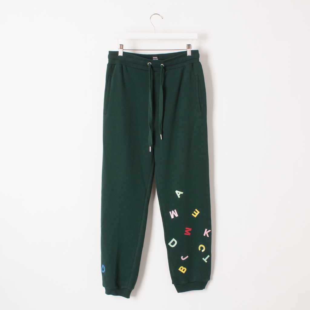 Ashish x River Island Design Forum jersey fabric sweatpants in dark green with multicolored alphabet leg detailing. Has elastic waist band and ankle trim.