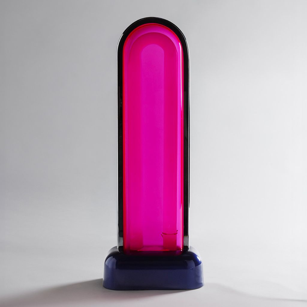 Transparent and opaque neon-pink Plexiglas shell on blue-lacquered metal base.