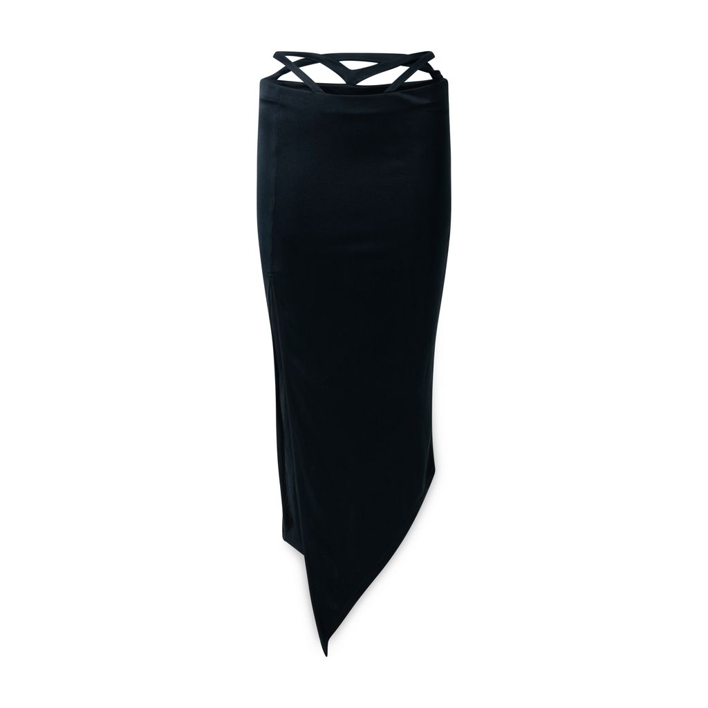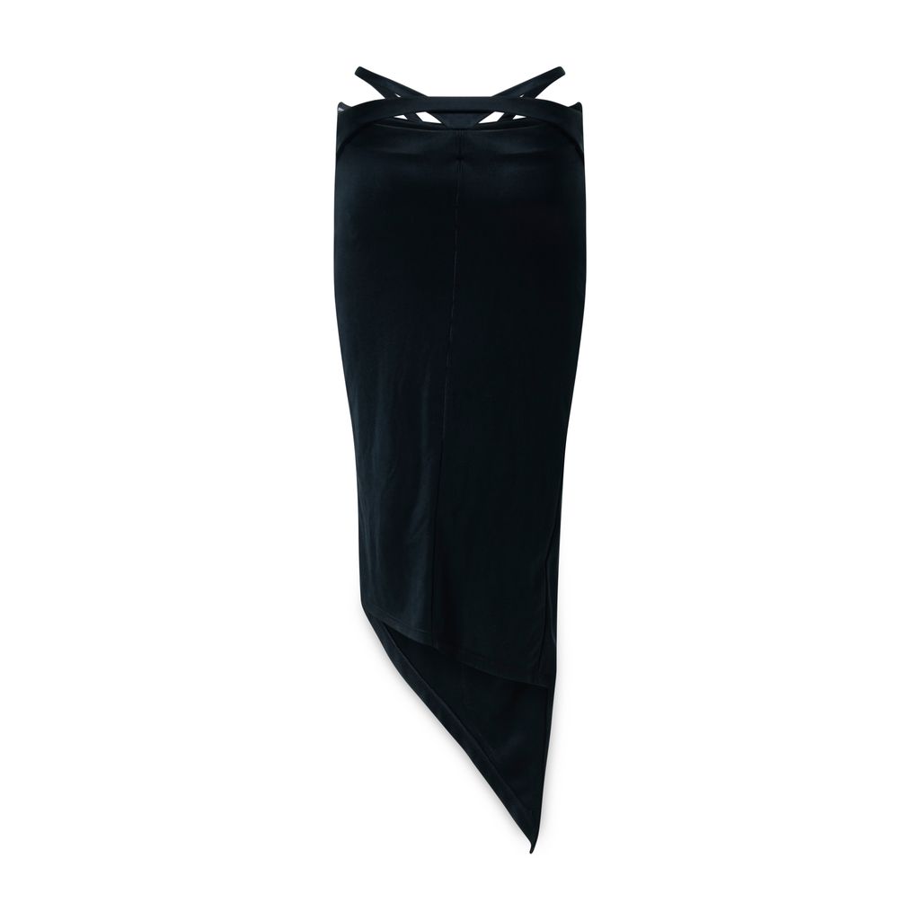 A low-rise maxi skirt with an asymmetrical hem. Features a cutout at the lower back, thong straps, and an invisible side zipper.
